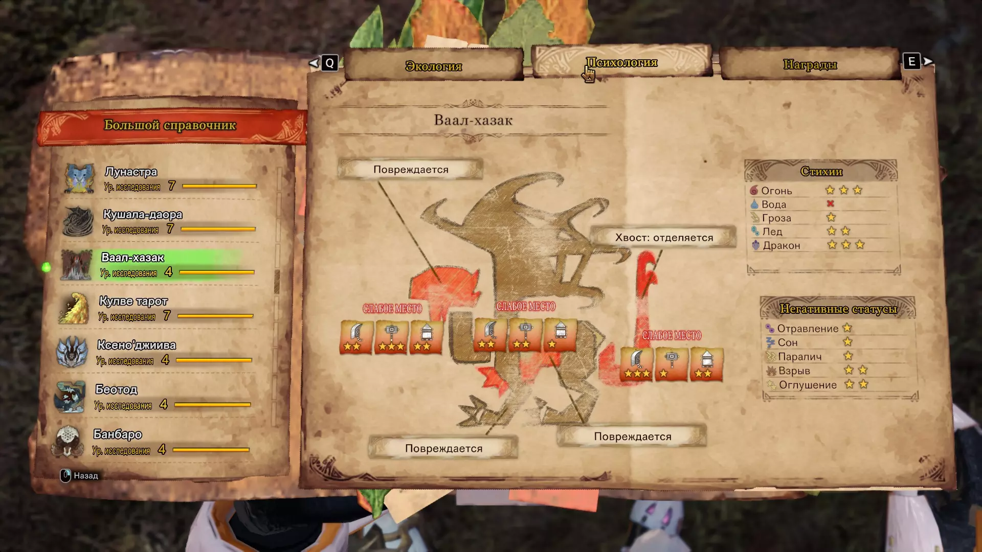 在图鉴中我们可以看到,它对火焰有三星弱点,对龙属性也有三星弱点,而它本身就是龙属性。不过它的某些部位,比如头部和腹部,最初完全不会受到龙属性伤害,要让这些部位对龙属性变得脆弱,需要先将其破坏,之后它们才会开始受到属性伤害。如果要说火焰元素,它原本就会对这些以及其他部位造成伤害,这表明在选择对抗该怪物的武器时,龙元素并不适合我们。大多数怪物都有这样的细节,但我不会逐一讨论,不过想向大家保证,不必对此感到害怕,因为所有东西都是通过比较来了解,并在实践中不断磨练的。下面为你介绍一些游戏细节。双剑的游戏细节不算多。简单来说,使用双剑需要灵活的战斗风格,也就是围绕怪物游走,并在合适的时机造成快速精准的伤害。值得关注的新内容是《怪物猎人:世界 冰原》中出现的新动作,具体如下: - 回避射击:可以施加古老印记,打断怪物的攻击并阻止其行动。我强烈建议不要忽视这个机制,因为它非常有用,建议立即尝试掌握。旋转上勾拳也是非常实用的机制,因为它能帮助我们快速削弱怪物,通过【弱点探寻】技能增加对怪物的伤害和暴击率。在我看来,这是非常重要的机制,尤其是在多人游戏中,因为你可以通过简单的操作帮助整个团队,同时造成相当高的伤害。骑乘怪物背部——在我看来是游戏中的一个娱乐元素,但在某些怪物身上,骑乘还能造成极其显著的伤害。简而言之,怪物体型越长,骑乘起来就越有趣且越有用。 关于自瞄及其弹药 简单介绍一下自瞄及其弹药。