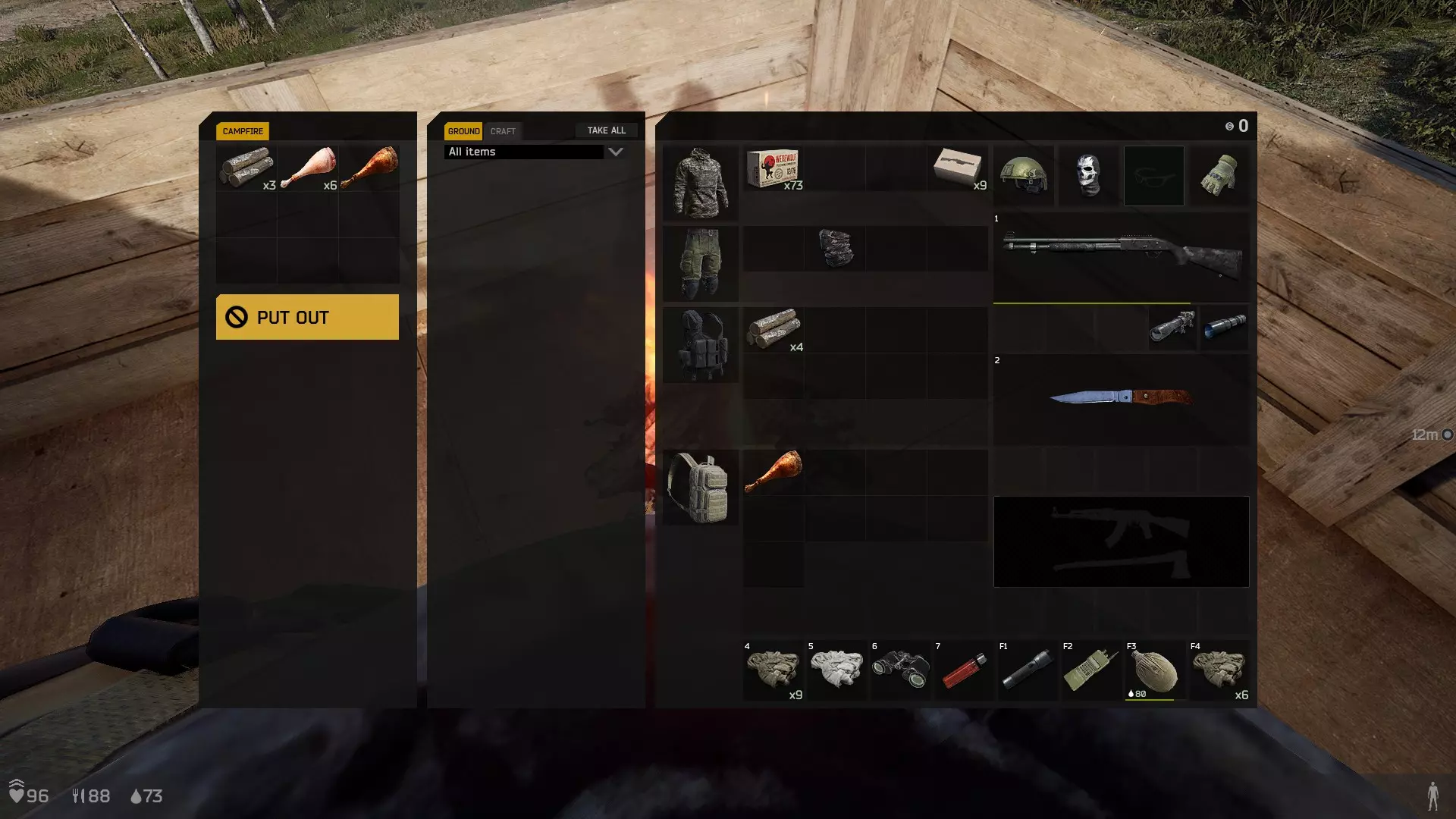 生好火后,需要在持有打火机的状态下放入肉和木头进行烧烤。如果放置不管,肉会被烤焦,所以烧烤时要好好盯着。不过就算烤焦了也不是不能吃。