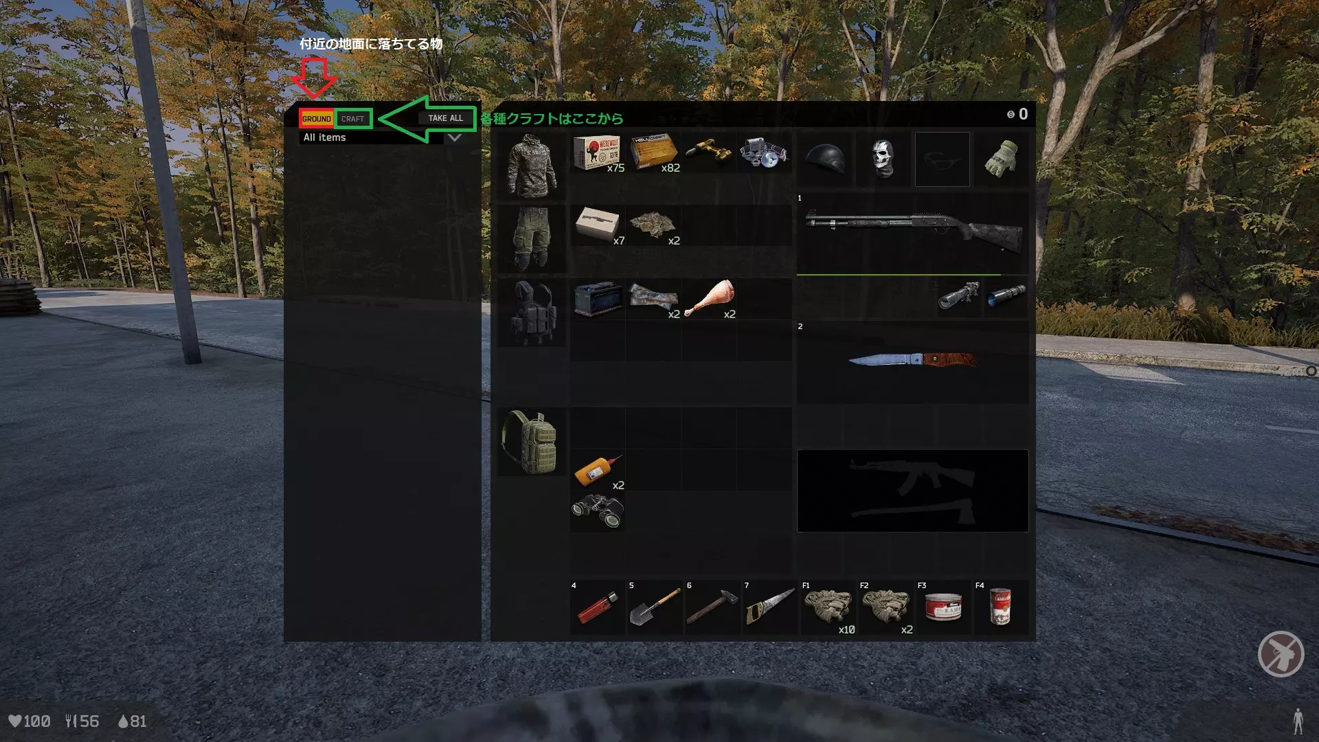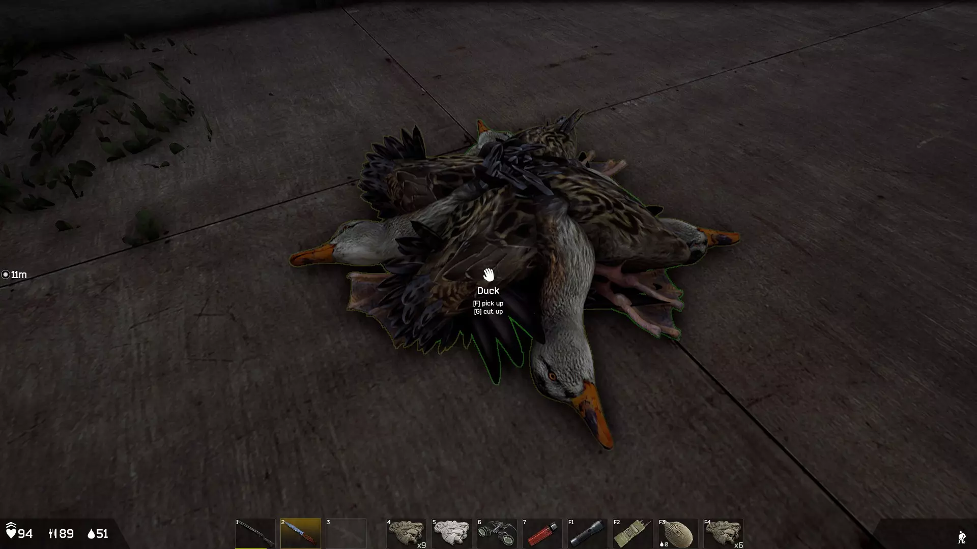 把猎物带回据点后,放在地上并装备小刀进行处理吧。我曾试过在安全区(セーフゾーン)这么做结果被偷了。