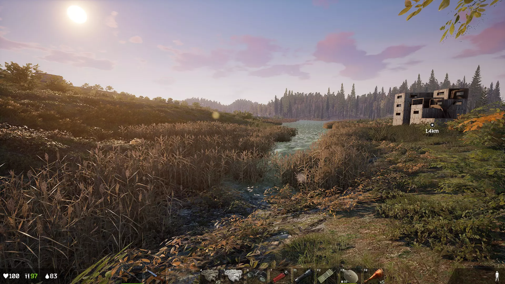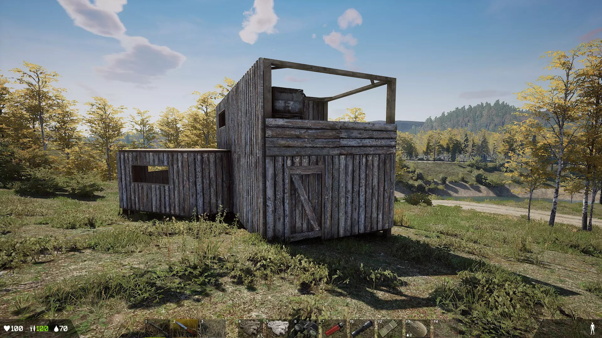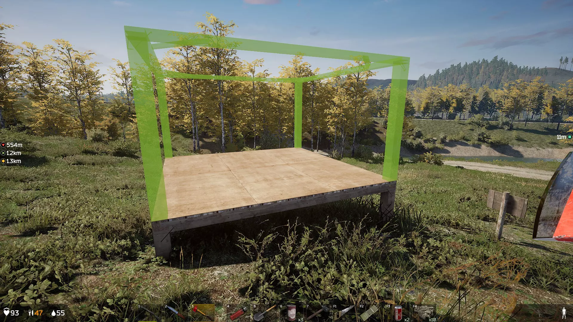 对于拾荒者级别的玩家来说,像军队这类人经常会丢弃有用的东西,所以就算有厉害的家伙瞬间完成任务去搜刮物资,也不要放弃。仔细查看已经被打倒的尸体,往往会发现有配件等物品被遗留下来。 4.基地建造 建立基地时需要考虑的要点:能否通过农场种植食物?选址时要考虑可耕种区域的距离和人气程度,是否靠近安全区。如果涉及PvP,要选择不显眼或具有威慑力的位置,还要注意地面坡度。 需要携带的物品:能否通过B键进行准备制作,斧头、锤子、锯子、钉子约200个、电子锁、最基本的自卫手段、食物和水、最低限度的医疗用品,最好还有2块金属板。 安全区内的树木无法砍伐,需要在现场砍伐。 首先重要的是选址,但本作中基地之间的距离限制相当严格。不过,还是尽量选择靠近可耕种区域和安全区的位置,固定刷新食物的营地附近是有力候选之一。只是单纯选择可以建造基地的地方附近也行,但物资供给会不稳定。适合建造基地的地点还包括可以猎鹿的地方,或者附近有玩家放置了水塔的位置。如果附近没有任务触发点,或者离可以建造基地的地方太远,就会很不方便。尤其是想要大量囤积物资的玩家,最好考虑金属板的供给情况。热门地点附近很难捡到物资,但冷门地点又会因附近缺乏高难度任务而陷入困境。此外,如果地形倾斜度过大,就无法建造地基,所以尽量选择平坦的地方。这次为了不考虑太多复杂因素,只考虑了PVE模式,但如果是PVP模式,需要考虑的条件会更多。这就导致了对黄金地段的激烈争夺,与同类游戏相比竞争也相当激烈。我花了大约30分钟才从符合条件的1平方公里土地中找到可以建造的地方。建议大家善用标记功能,先规划好想建造的区域,再去寻找土地进行建造。