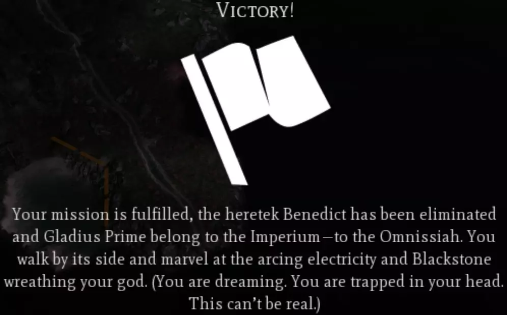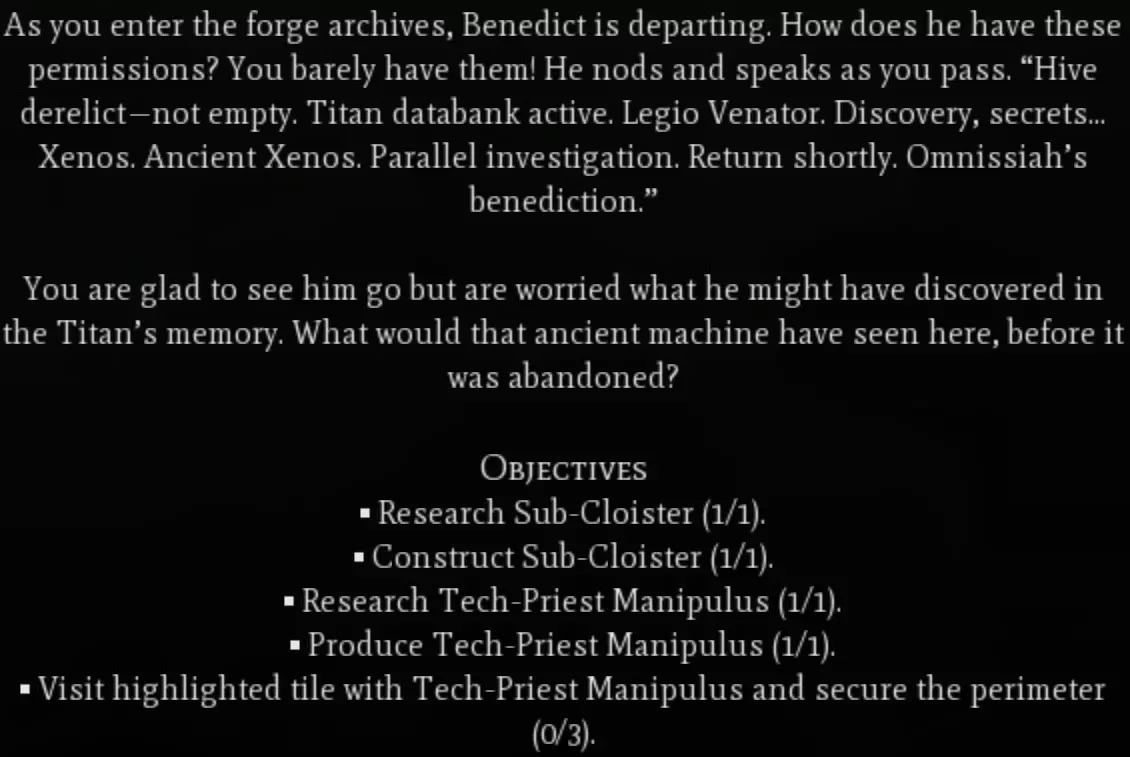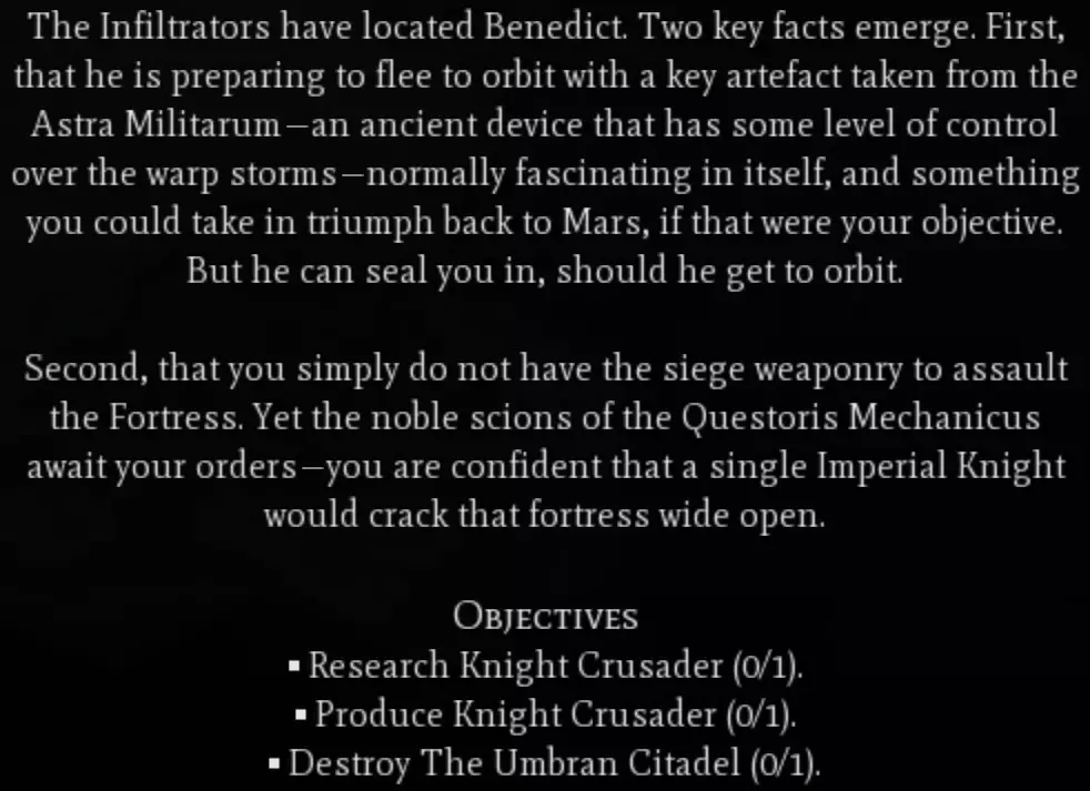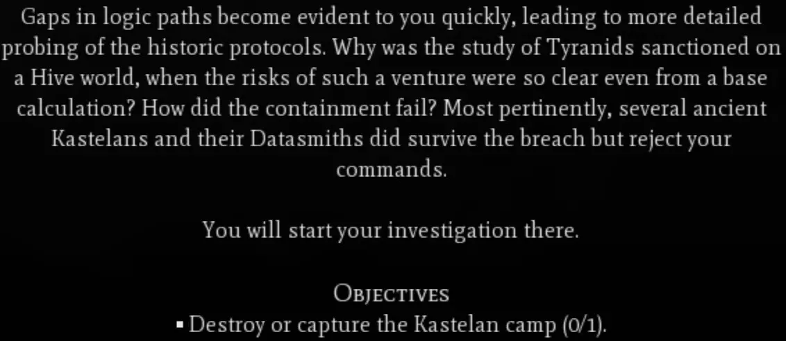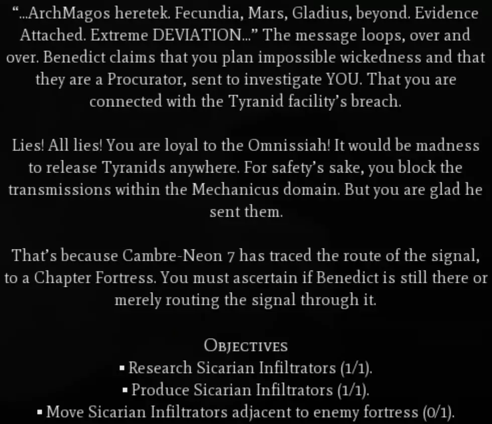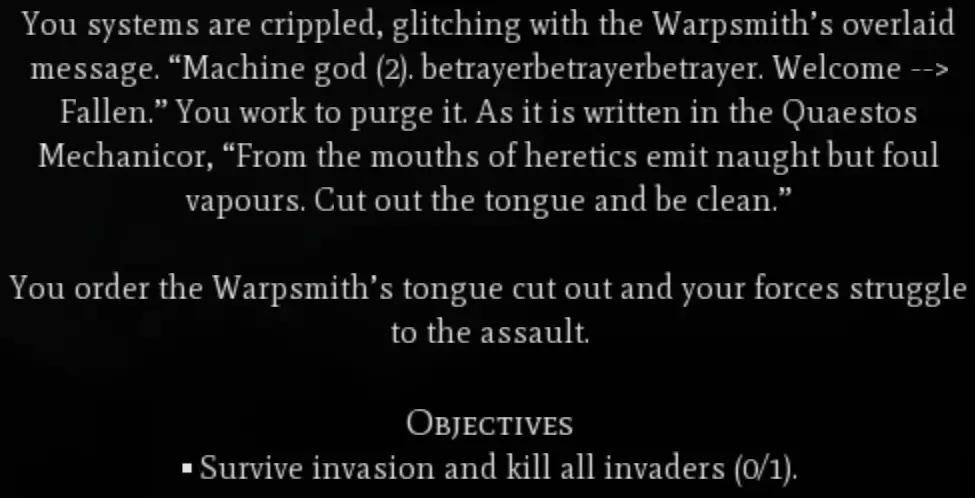 战斗 这是一种入侵类型的事件,可能是《角斗士》任务中最棒也可能是最糟糕的部分。在这个事件中,混沌部队会在距离你任何一座城市约10格的位置生成。这些部队可能包括6-8级的扭曲铁匠、地狱兽、碎骨魔和毒液爬行者。单看这些部队本身不算太糟,但在我的游戏里,6只毒液爬行者聚集在一起,开始冲击我的一些单位,所以要小心。我记得总共需要消灭大约14个单位。 警告 完成这个任务后,你很可能会直接进入第五章开始的第一场大型战斗。如果你还没有建造足够数量的单位,比如 skorpius 瓦解者,建议先不要消灭最后一两个单位,等准备就绪后再行动。即将到来的战斗将在你的某座城市附近生成一座中立的星际战士城市,该城市周围会有大约40支不同的单位小队。在我的游戏中,这些单位仅包含3种单位类型:终结者、雷火炮和 vindicator 坦克。 第五章:评估 - Questoris 部署