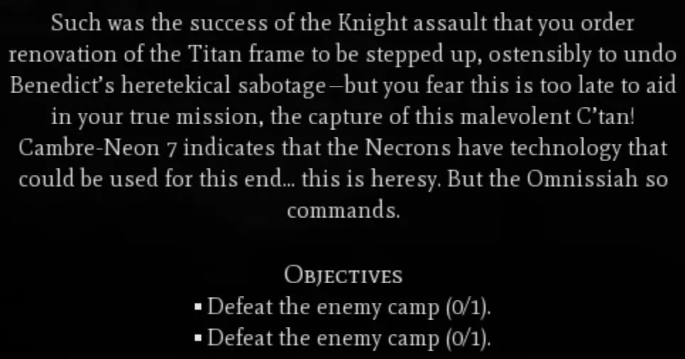 战斗 好吧,我们要对抗 Necron(太空死灵)并不太令人意外。真正令人震惊的是我们面对的军队规模。说实话,这可真是让人头疼,兄弟。不过,这里的战斗理念和之前一样:集中火力猛击他们,尽快瓦解大规模部队的士气。我在下面附上了我游戏中遇到的部队图片。说实话,我没费心去数清楚所有单位,但你将面对两支不同的部队,每支大约有30个单位。值得庆幸的是,他们只包含早期到中期的 Necron(太空死灵)单位。记住,这还不是任务线的最终阶段,所以不要过于激进,以免在最终阶段陷入被动。