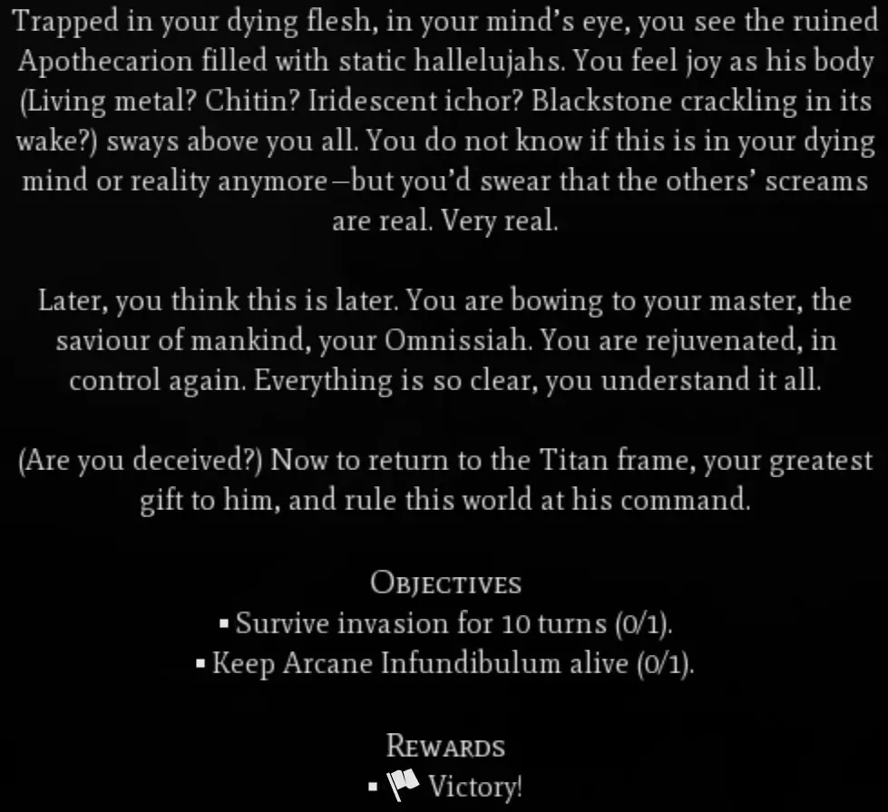 战斗 这里是另一个入侵风格的最终关卡。到这时候你可能已经拥有一支庞大的军队,所以难度不算太高。你将受到钛族和灵族单位的联合攻击,其中会出现一些终局单位,务必小心并保持警惕。一定要找到【奥术漏斗】并尽快将其转移到安全地带。在我的游戏中,它刷新在了三个钛族单位中间。建议先找到它,规划好护送路线到城市后再移动任何单位。 哦,还有,我曾见过六个蝎子单位聚集在一个地方,所以要小心这种可能让你快速损失大量单位的情况。还要注意躲在森林里的KV-128。 成功坚守10回合后,即可获胜!