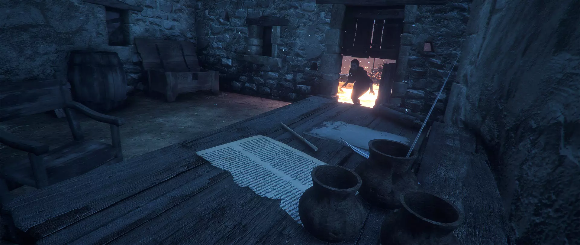 奇物:羊皮 在士兵让女人离开的场景结束后,进入右边的房子。你会看到一具悬挂的尸体。开枪击落尸体,随后远处的门会走出一名士兵。尽量快速射击他的灯笼将其解决。然后小心地绕过几群老鼠(或者烧死它们)。你需要走到士兵出来的那扇门,旁边会有一个箱子,里面放着羊皮。