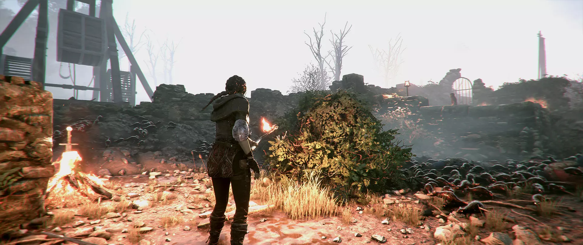 第五章 - 垃圾场(横向权杖(雅各布之杖)) 到达卢科会摇动的弹射器后,和古戈一起跑到另一边,让他从栅栏后面把木棍拿过来。让古戈待在原地,点燃木棍,然后穿过老鼠旁边的障碍物。之后用剑点燃冒烟的篝火。