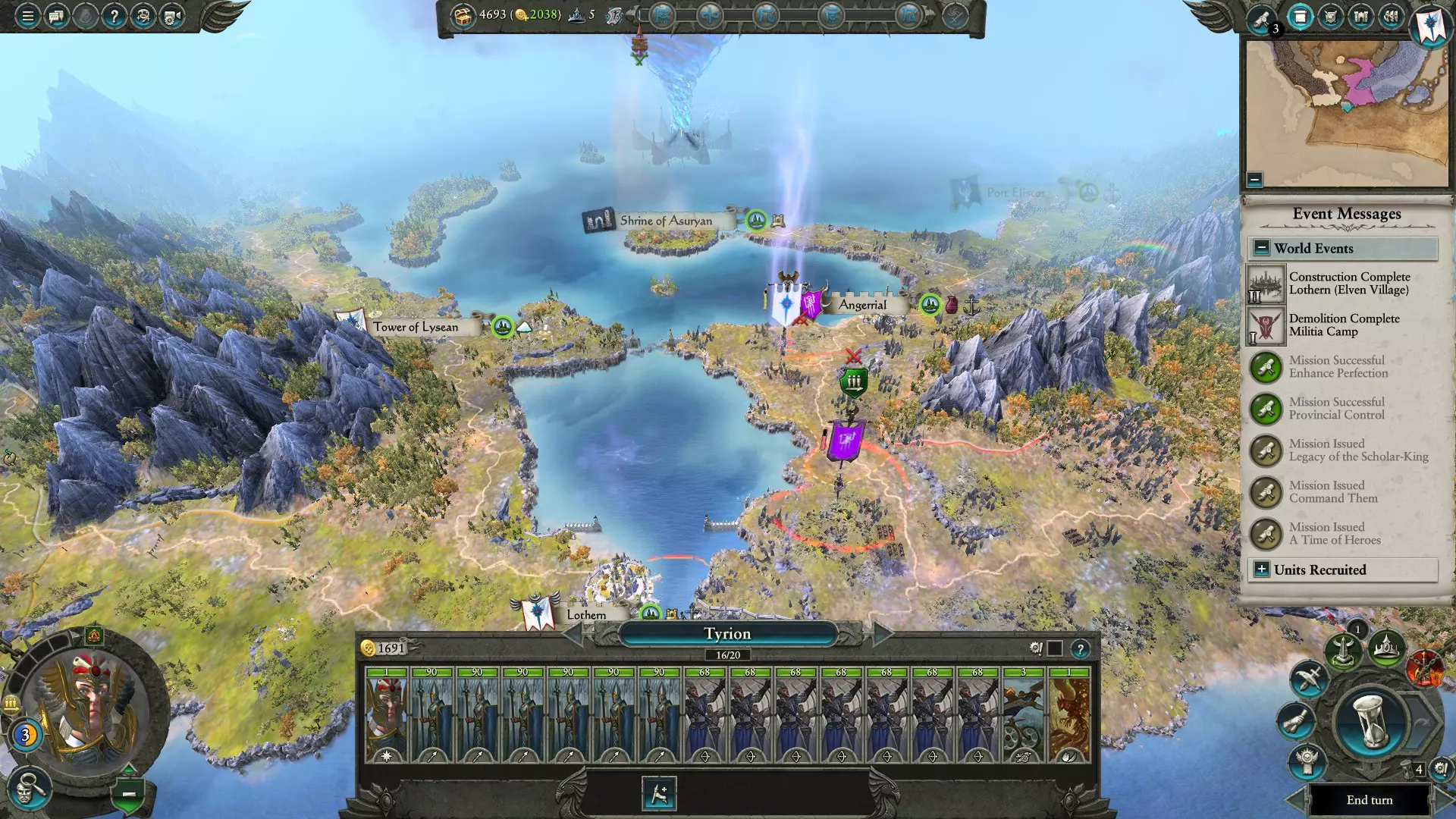 NOTE: Yeah, the Cult Lord is still heading to the Glittering Tower BUT he'll have a hard time taking it. Tyrion going for Angerial may make him rush back though Turn Five If you were attacked by Cult of Excess during their turn, congrats on Tyrion's new level and put his point into "Speed of Asuryan." Attack the Cult of Excess army and in this case, because of your superior numbers and their (hopefully) massive losses from the earlier fight, you auto-resolve to wipe out the entire army. Merge units to save some income. Losses should be minor so far, so you'll only lose maybe one or two units and the rest should be mostly okay. Move toward Angerrial. NOTE: So yeah, The Cult attacked the Glittering Towers in this run through. My Archmage and her three archer battalions made full use of the garrison fource (three damaged spearmen and two damaged archers). But we snagged a heroic victory. Basically I used the Lore of Life Earthblood and Awakening (AoE burst of damage) to keep my front line from being overwhelmed. Meanwhile, my archers did a bulk of the killing and focus-fired on the enemy archers/corsairs. once those broke, I moved my archers in behind the enemy frontline and shot them in the back with arrows. Lots and lots of arrows Dude basically lost EVERYTHING. I got a free 500 gold and a level for my new mage. She has a -15% speed trait, but she'll do as a filler lord until I get some influence farming done. I won't give her a full stack because that's crazy expensive. Probably just a 7-8 unit defensive force to move as needed. I've also named those three archer battalions "The Glittering Host" so they don't get accidentally disbanded in the future. They deserve to be respected for that accomplishment. Turn Six Congratulations! Your Rally Field is now upgraded. You can recruit different units now but more importantly, you can.... RESEARCH STUFF. Start with the basic one turn research for the military. This will complete a quest and get you some easy cash/influence. Fight the Angerrial Battle. Use the blind spot on the left side of the map and set up your army. Use your archers and artillery to punish the idiots on the way. Have your Phoenix deployed on the opposite end of the map and have him swing in behind. He can fire bomb units along the wall and once empty, prepare to swoop in once Tyrion and his spearbois get sent in. I usually wait until after my archers and bolt thrower are all out of ammo, but you can use your own judgement here. It's a hard fight but your have massive superiority and you can rear charge your phoenix into fights your spear men are losing. You'll lose some soldiers but wipe out of the Cult in this battle. No worries. Finish the battle and put your LL point into "Hard to Hit" to improve Tyrion's sustainability. Upgrade the Public Order (PO) building in Lothern. Look for more TA. I got Tirana to join me for a total of six TA by turn six. Turn Seven Congratulations, you've just gotten the first research quest done. Now choose what you'd like to research. I usually opt for "Archery Prowess" which gives boosts to your ranged unit reload speeds. Force March your army toward the Shrine of Asuryan. You'll be colonising it soon. Offer some small gifts (400-500 GP) to any HE factions that are resistant to NAP or TA. Caledor are probably busy dealing with Count Noctilus of the Dreadfleet. Good. They should be too busy to declare war on you for the time being. You may get offers for "Defensive Alliances" or even "Military Alliances" with some of the HE factions. This is a terrible deal because AI allies tend to drag you into their wars. We don't want enemies who are close enough to actually fight you. Politely show them the door but give them a small gift as consolation. Might help them fend off Norscans and Pirates. With definitely help improve your relationship with them. You may be able to hire a hero at this point. You can look at your options. You may have enough influence saved up from various scenarios the game offers you or from quest completion. If you do, buy a noble for 15 influence points. If you don't have enough for that, buy a scrub hero. HE need influence points to hire decent heroes/lords. The reason for this is because HE people tend to get really spoiled and arrogant living on their bubble continent of Ulthuan. Living for thousands of years tends to leave people with some personality issues. To show this in game, 'scrub' heroes cost you zero influence but they have negative traits (like penalties to upkeep, public order, etc.). Decent heroes and lords may cost 15 influence. BUT the expensive ones for 45 or 60 influence points are almost as good as proper Legendary Lords. So it's a mixed bag. Regardless, buy a noble if you can, then get ready to send him abroad. He'll be "securing" influence from our Caledorian brothers to the West. Turn Eight Secure more TA with other HE factions. I know this sounds repetitive but your race gains vision of trade partners AND you can improve your relationships in the process. The income isn't great (only 55-65 per agreement) but as you gain territory and build more trade resource structures, you'll quickly jump up the pay scale. Here you need to make a choice: Search ruins or colonise? I prefer the searching option for the extra cash to cover next turn's colonisation and also the potential for a nice new item. NOTE: if Saphery has an army nearby, don't search; colonise. Those Lore Master snobs may try to steal that city from you next turn. If there are not other HE armies nearby and you think you have time, search! The puzzles aren't that hard and I'll give you a quick explanation here: - dice puzzle: common sense, use some logical to figure out what symbol goes on that face of the die. -sudoku puzzle: look up how to play Sudoku. Basically you need a 1, 2, 3, or 4 in each column or row but you can't have two of the same number in a single row or column. Take a minute to figure out which number you need, then check the colo