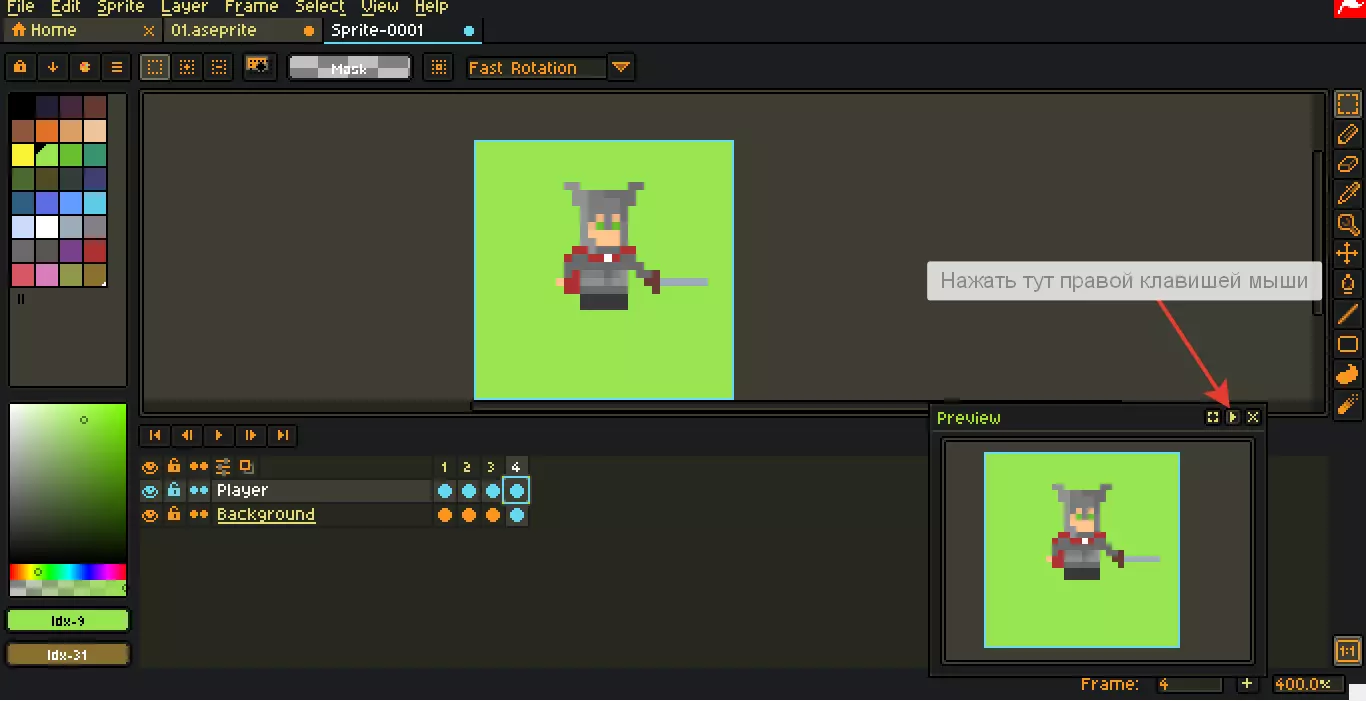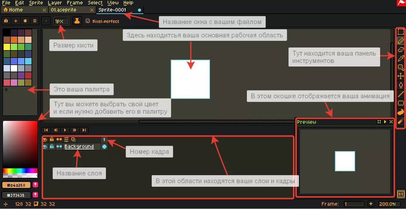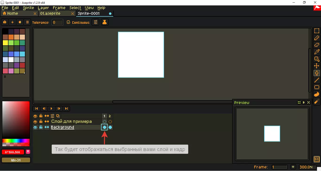 第四步 - 绘制第一帧 首先我要更改背景颜色: 为此需要在右侧面板中选择油漆桶工具,或按键盘上的G键 然后需要将颜色指定到所需的鼠标按键上,为此在调色板或右下角面板中,用所需的鼠标按键点击颜色 接着选择所需的图层和帧