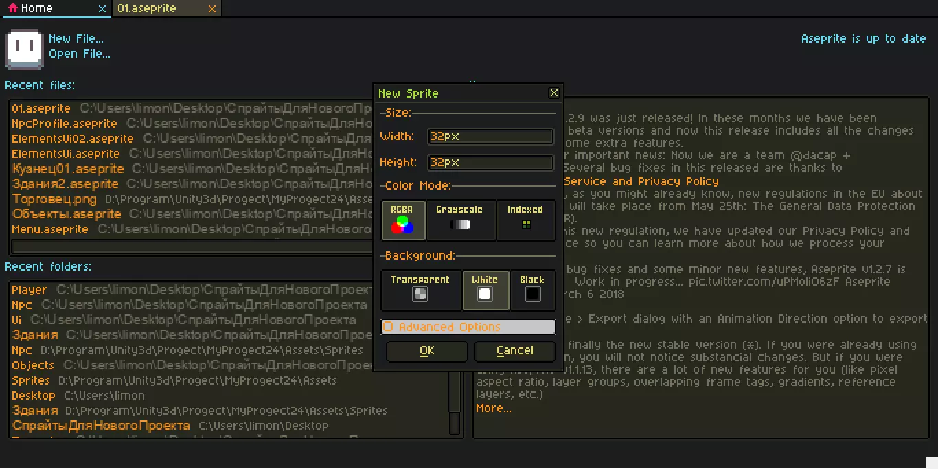 第二步 - 选择图像尺寸、调色板类型和背景颜色 我将使用32x32(宽度和高度)的尺寸,RGBA调色板类型以及白色背景(之后会为了方便进行更改),此外在高级设置中可以选择宽高比,但我们不会对此进行调整