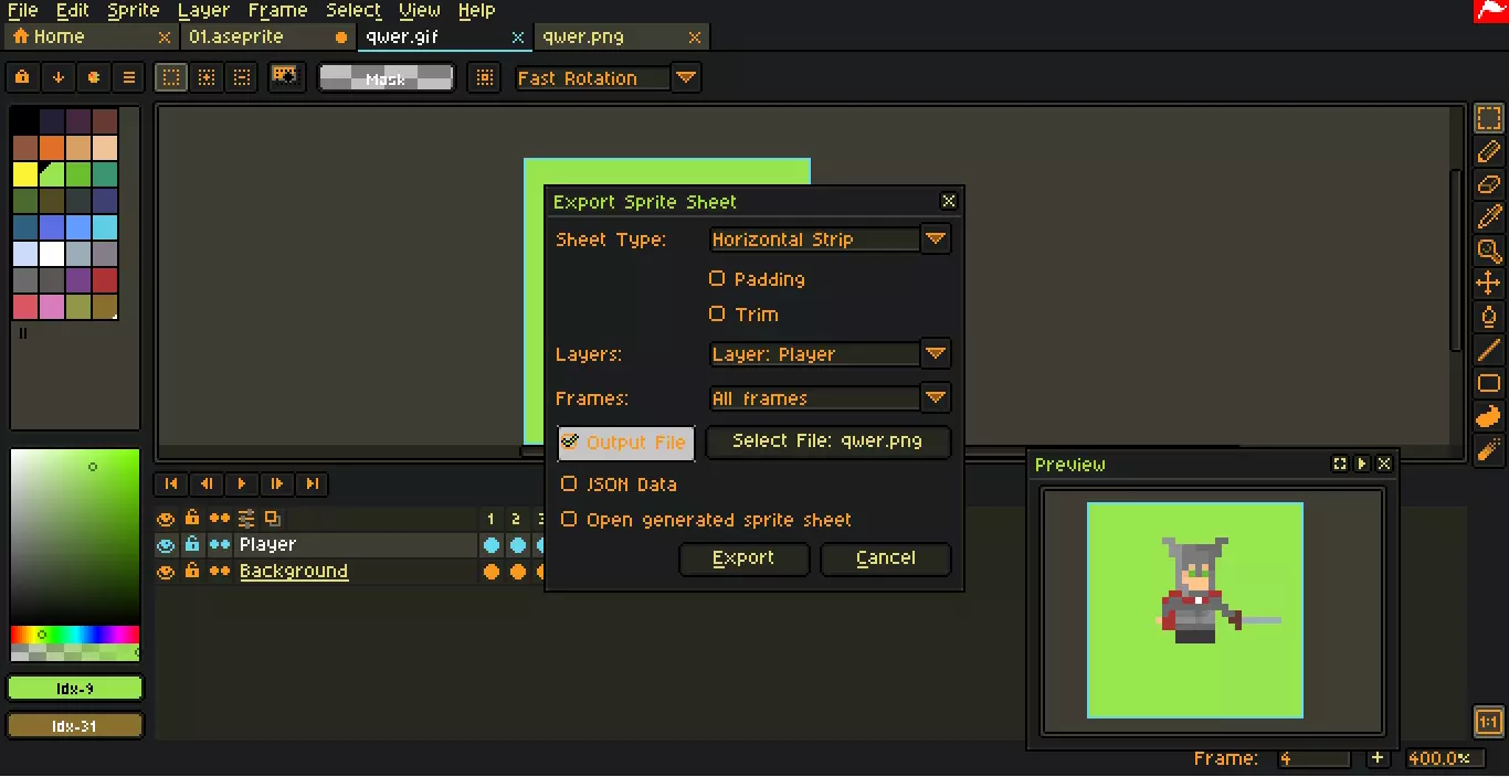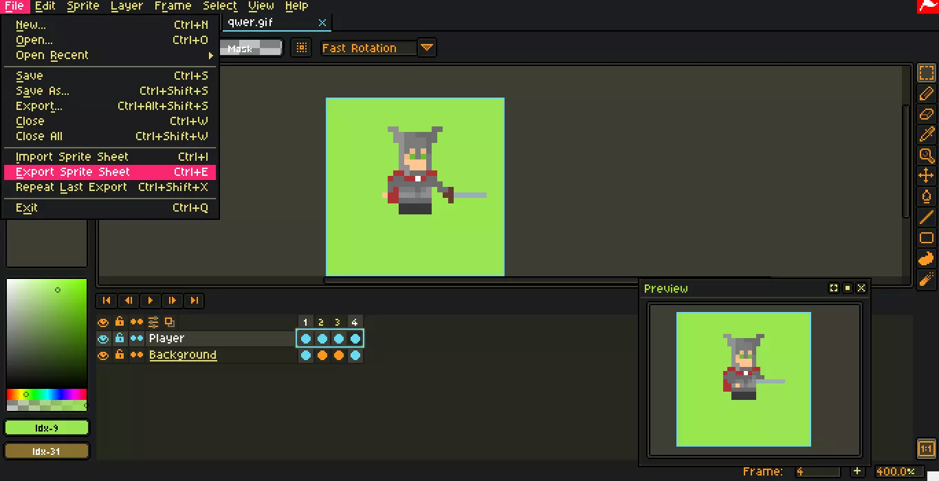 现在可以用鼠标左键点击Play图标。 *即使在绘制帧时也可以播放动画 按帧导出为png格式(简单来说就是创建精灵图) 点击顶部菜单栏的File,选择Export Sprite Sheet,或使用快捷键Ctrl+E