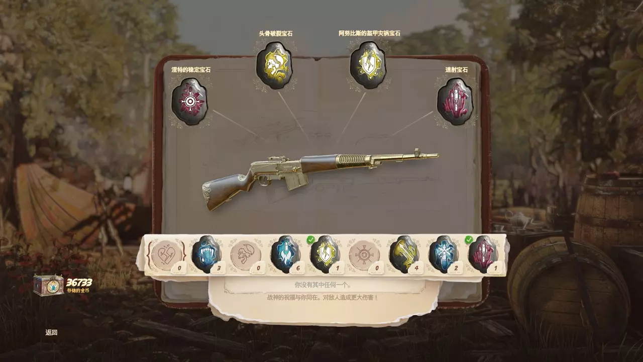 总计9种宝石,要注意的是宝石一旦安装到武器插槽就无法取下,只能安装新的宝石摧毁原有宝石。 其中泛用性较强的有门图神的野蛮宝石(增伤)、涅特的稳定宝石(减少后座力)、速射宝石(加快射击与换弹)。其余根据使用场景装配。比如单人高难度可以考虑赛克麦特的治疗宝石(杀死敌人回复少量血量),高载弹高射速武器可以考虑奎贝的冰封宝石(概率冰冻敌人),精准步枪可以考虑头骨破裂宝石(爆头增伤)。阿努比斯的盔甲灾祸宝石(增加穿透)也可以自行选择是否镶嵌。 其余的反弹宝石(子弹随机反弹数次)和本努的太阳火宝石(概率燃烧敌人)对武器加成有限,故不推荐。护符