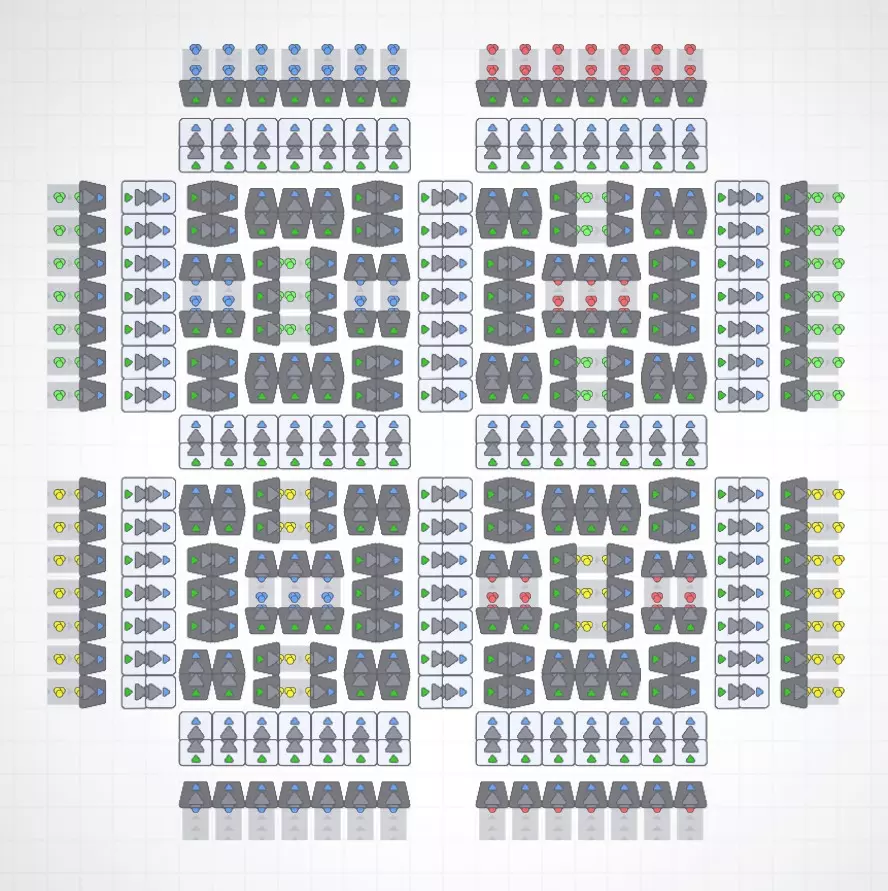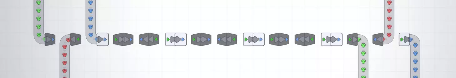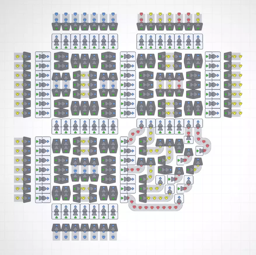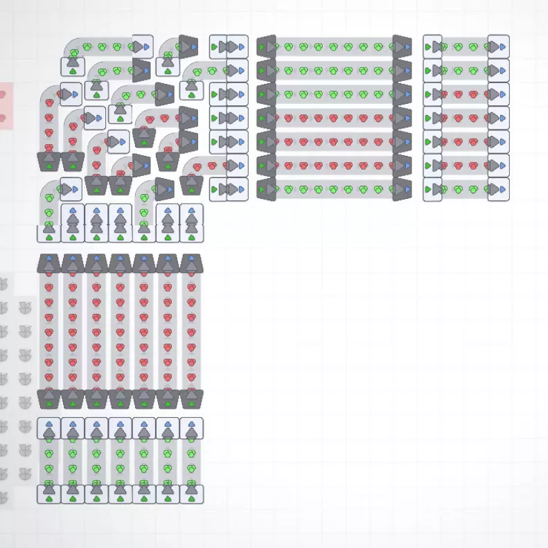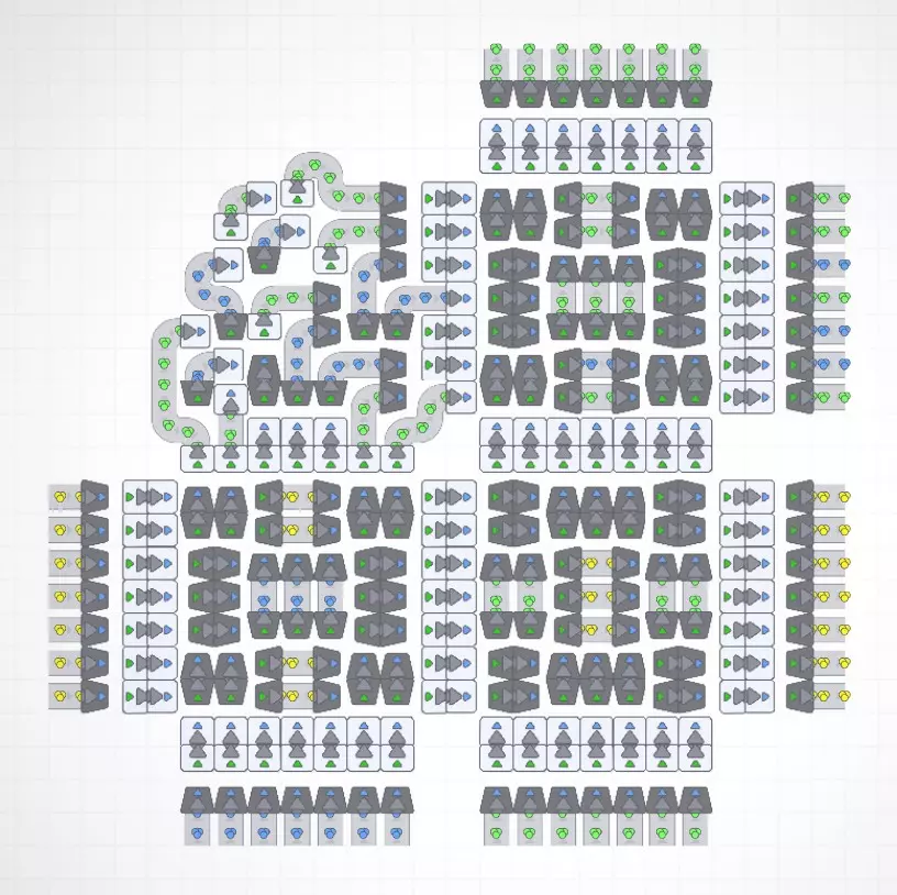 不确定这对其他人是否有用,但我真的很喜欢设计一个能将大量物品从一个点运送到另一个点的系统,所以想分享一下。本指南将涵盖我在这个项目中的设计目标、这些系统为何有用、它们的工作原理以及如何在你的工厂中使用它们。由于这是我第一次做这类指南,我希望能尽量减少错误,但请做好准备,这可能不是一个完美的解释! 简介 在《形状工厂》中设计东西时,我倾向于选择既能实现最佳传送带效率,又能将占地面积控制在最小的系统。这意味着,归根结底,如果有一条每秒运输30个物品的完整生产线,我希望我设计的任何系统都能处理该输入,并输出同样的每秒30个物品,同时将占用的空间保持在最小。我将系统或工厂的面积定义为机器本身占用的空间,而非总瓷砖数量,以此鼓励紧凑设计。话虽如此,本指南中的一些设计为了美观和最小占地面积,牺牲了部分易用性。这一点在转弯部分尤为明显。此外,我确信这些设计并非都完美无缺,如果你有任何改进建议,我很乐意看到! 好了,让我们开始介绍这些设计吧!抱歉,截图质量不佳,不知为何我用的所有工具都无法截取清晰的截图…… 传送带线路及其优势 7(14)传送带线路是一种7格宽、14线路的紧凑型传送带系统。下方图片展示了“交错”传送带线路如何将占地面积减少一半!这是我设计出的最实用的线路压缩方案,但稍后我们会介绍一种实用性较低但更为紧凑的版本。