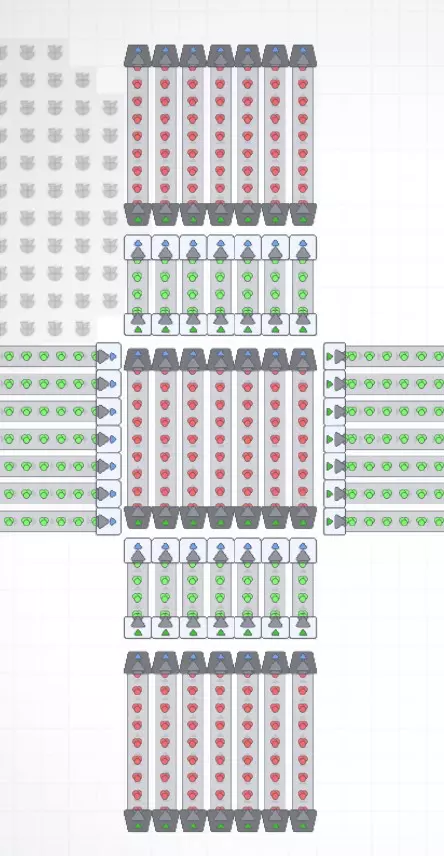 最后,一种更紧凑但实用性较低的传送带设计是由两条同向传送带和一条反向传送带组成。这种设计的问题在于它实际上无法扩展。由于只有一个方块用于输入和输出线路,构建7格宽的扩展系统是不可能的。如果一级隧道的延伸距离更远,我们或许能容纳4条传送带,但这是游戏本身的限制,而正是这种限制让游戏成为游戏,所以我愿意接受这一点。我想把这个设计也包含进来,万一有人出于某种我没想到的特殊原因觉得它有用呢。