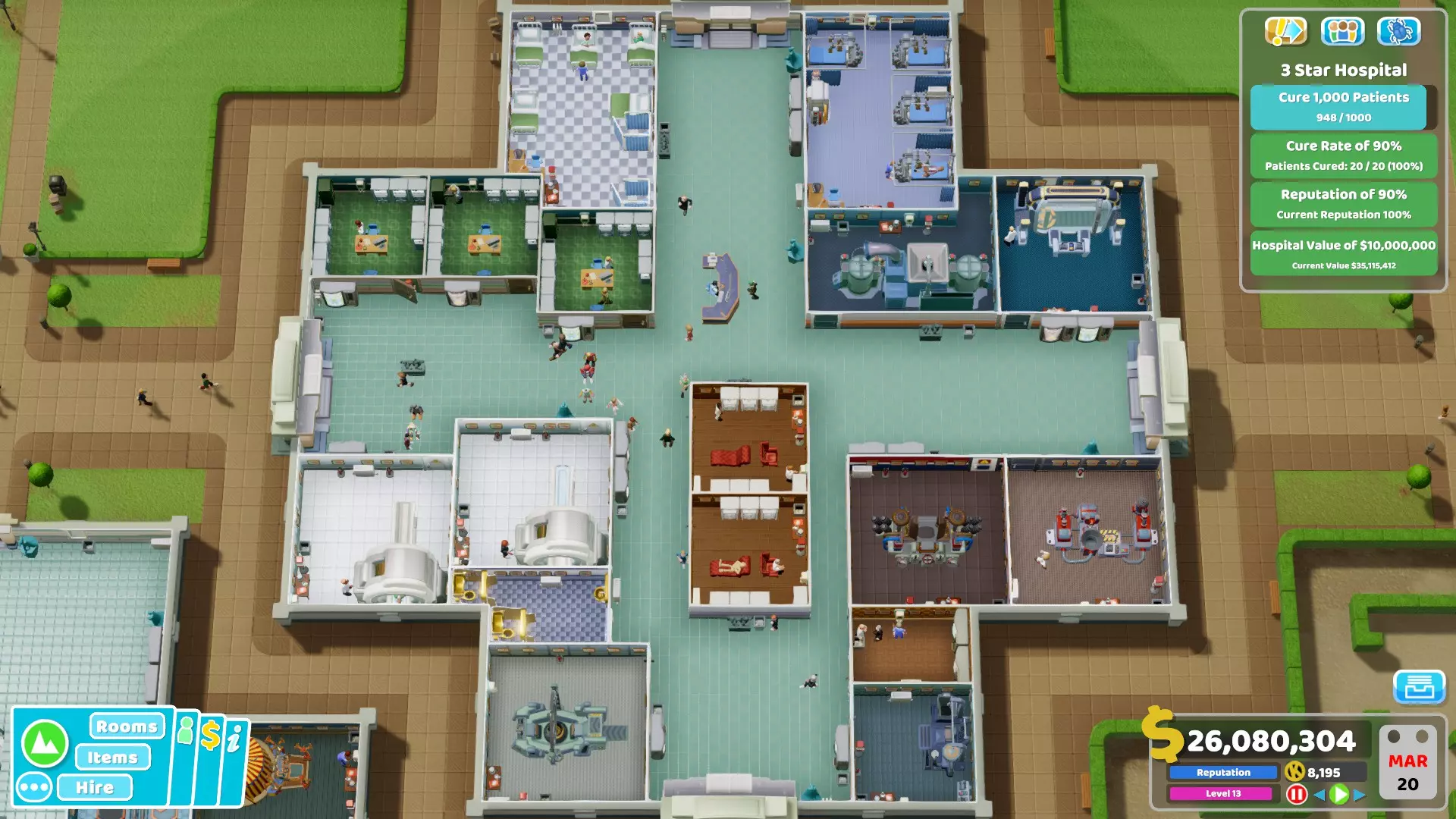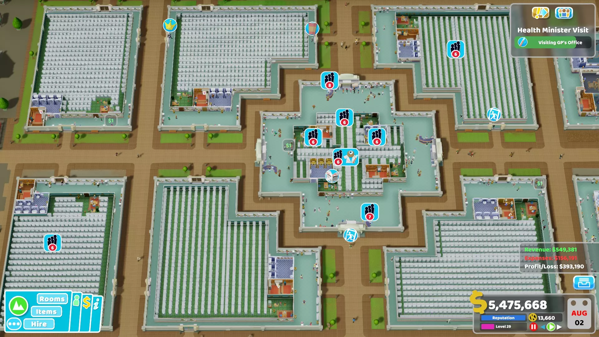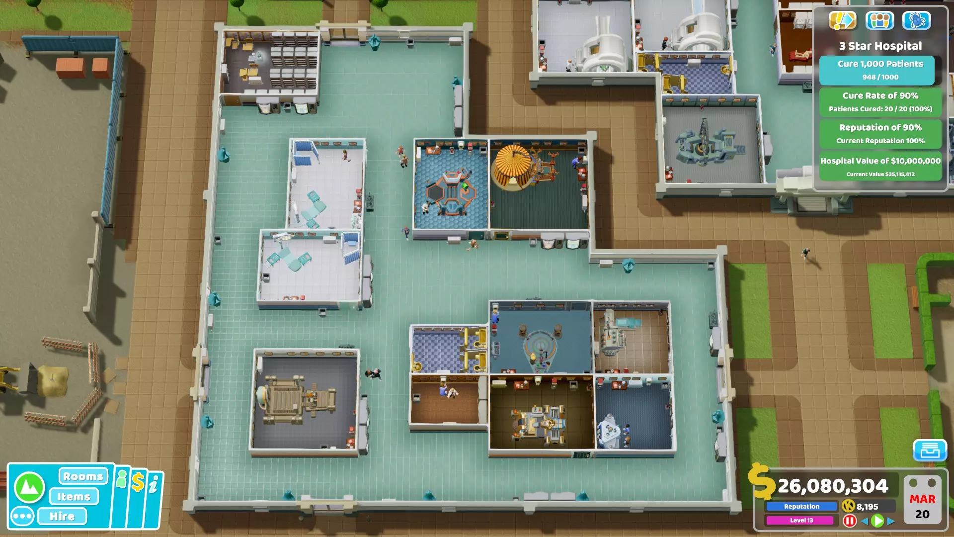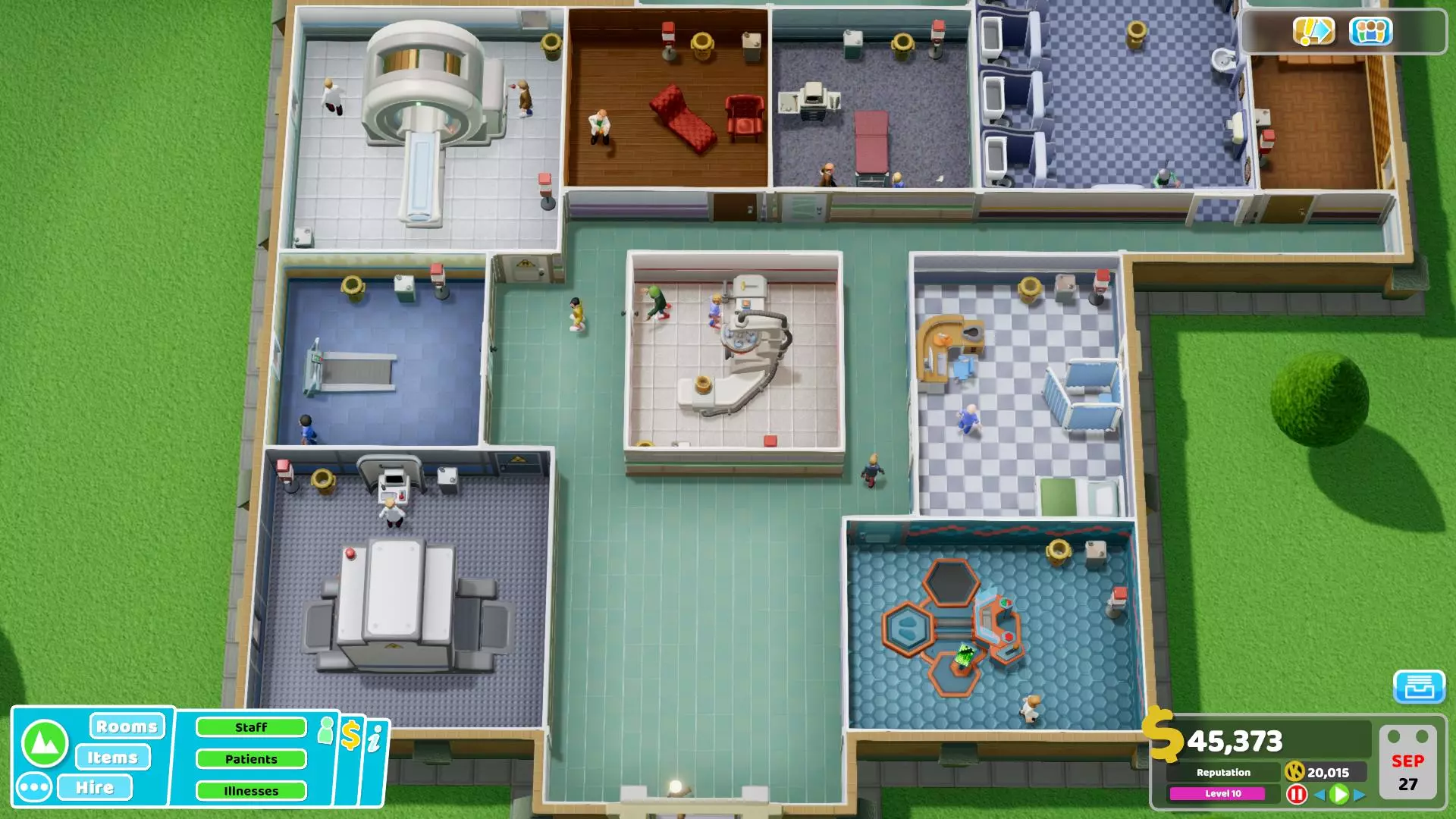 按照我的策略,这家医院只需2栋建筑就能高效运转,且仅需3间全科医生诊室。目前,这家医院已完全实现【自给自足】,不存在排队问题。医院环境整洁,患者就诊速度快,且盈利状况良好。相比之下,你可以看看一些游戏流程视频,会发现里面的医院往往规模庞大且秩序混乱。 2. 中心建筑专门用于诊断,由于空间充足,这里也设有一些治疗室:
