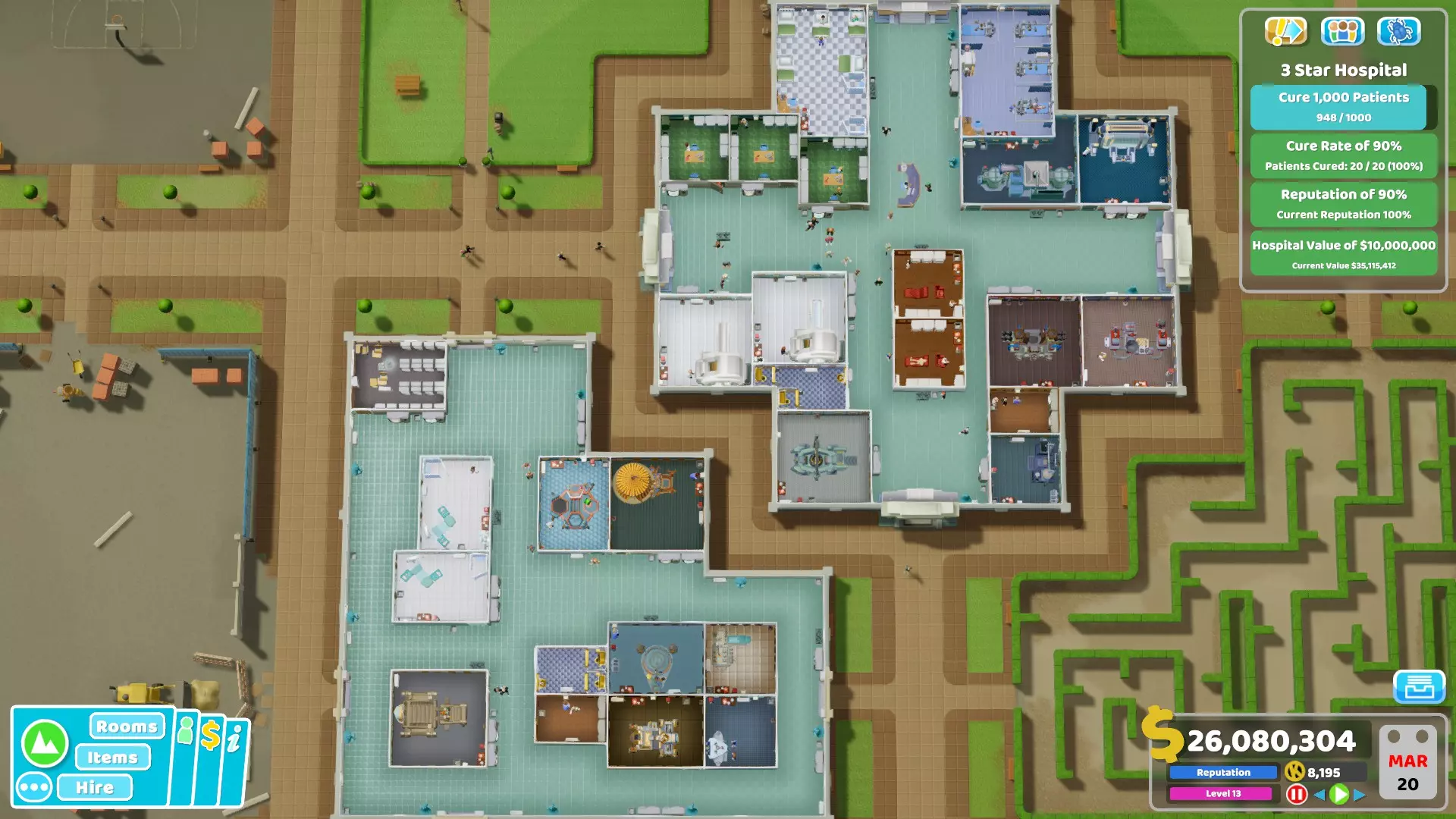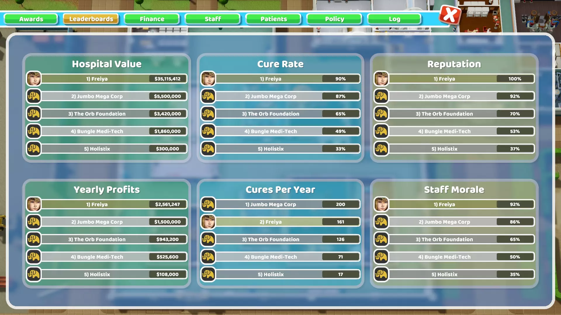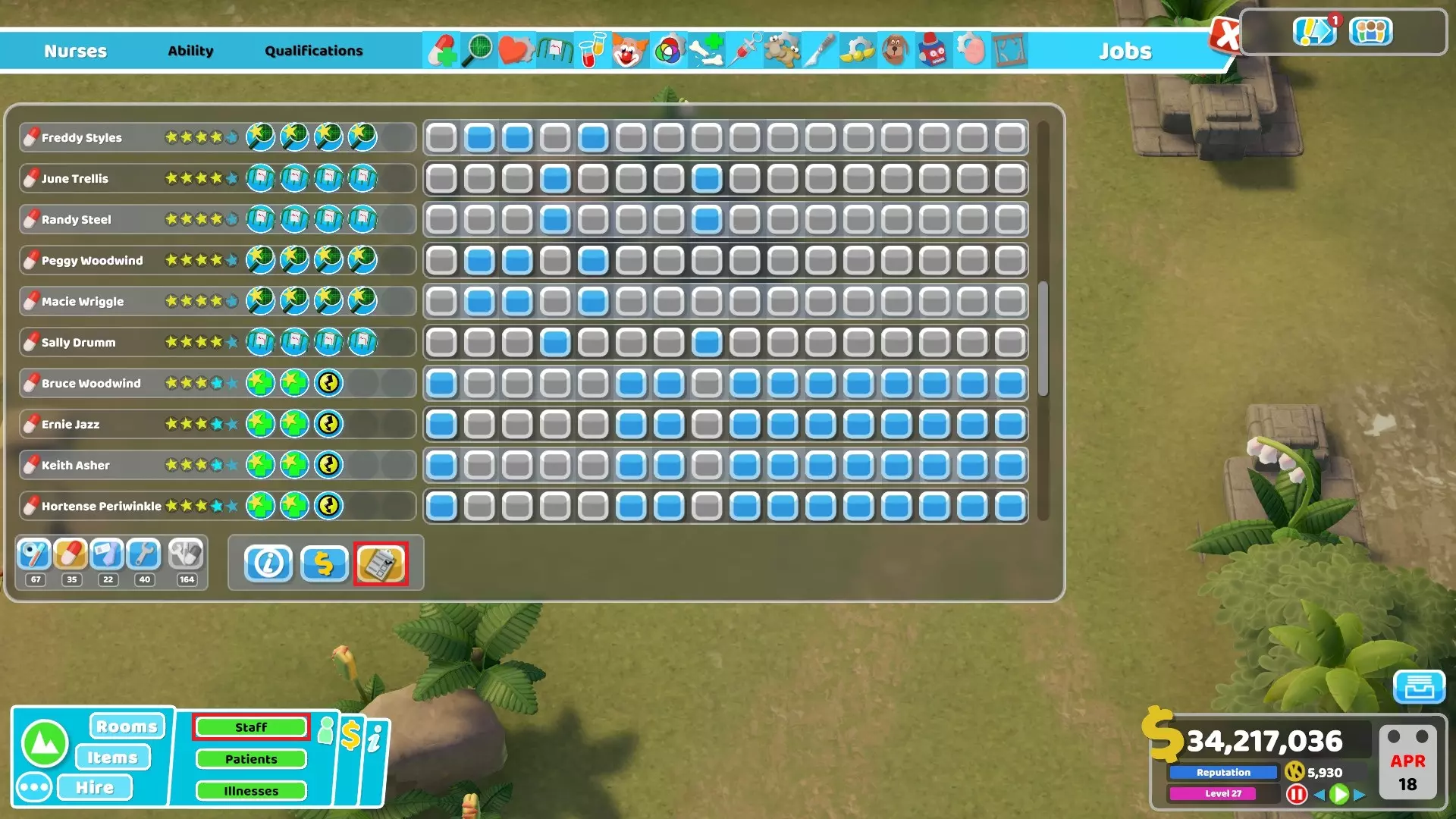 那里的DNA实验室只负责治疗患者,不进行诊断。需要注意的是,我有2间手术室,而这个治疗室是采用这种策略时唯一经常出现排队问题的治疗室,因为它的速度太慢了。不过,只设置1间DNA实验室是没问题的,而且我在大多数医院通常也只设1间。但由于它没有让我的医院升级,所以我决定再增加一间,这样就解决了排队问题。 在任务进行到某个阶段时,我曾有第二间培训室和一间营销室,但后来因为不再需要,就把它们删除了。 4. 本次任务期间我共有31名员工: