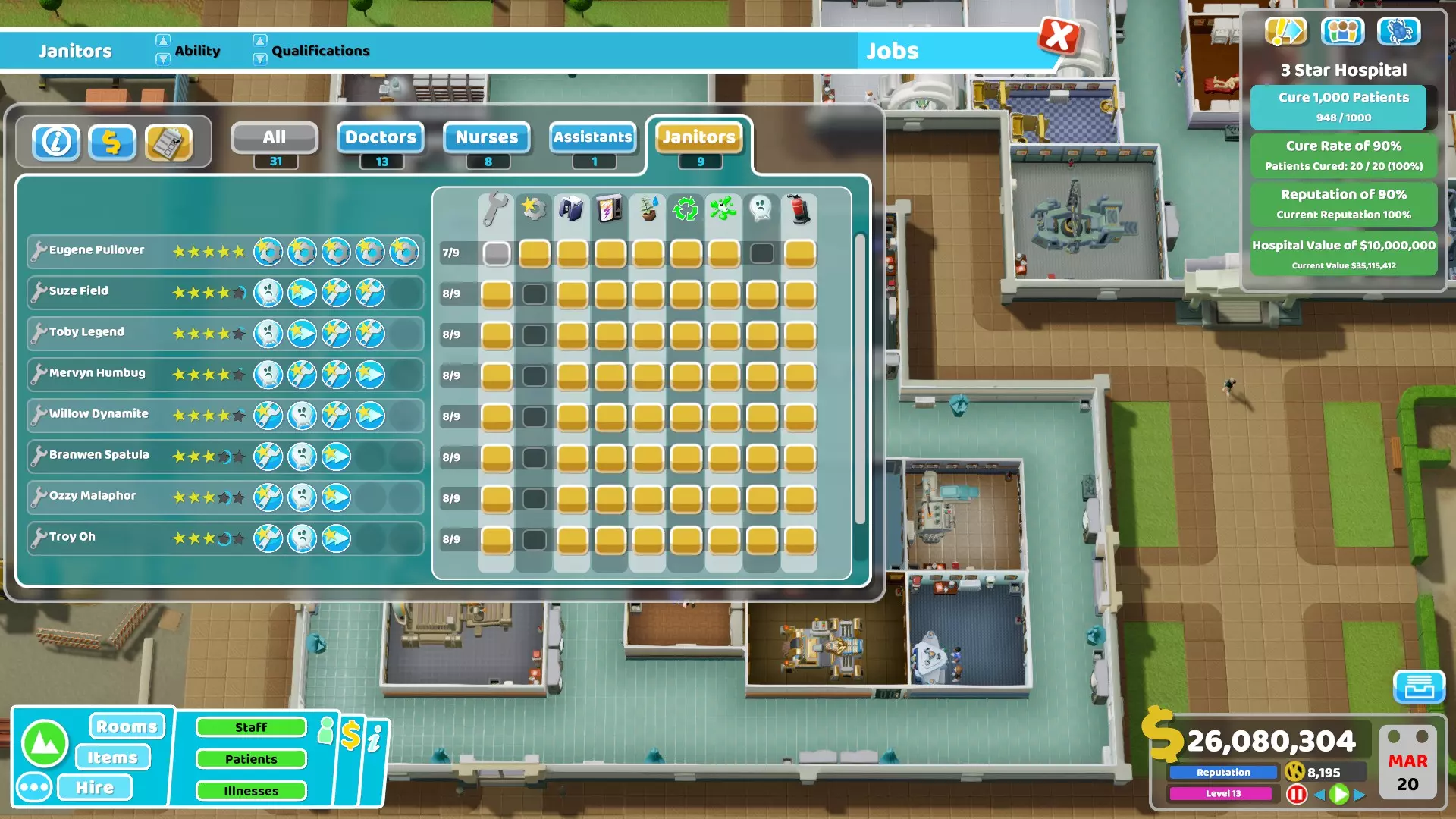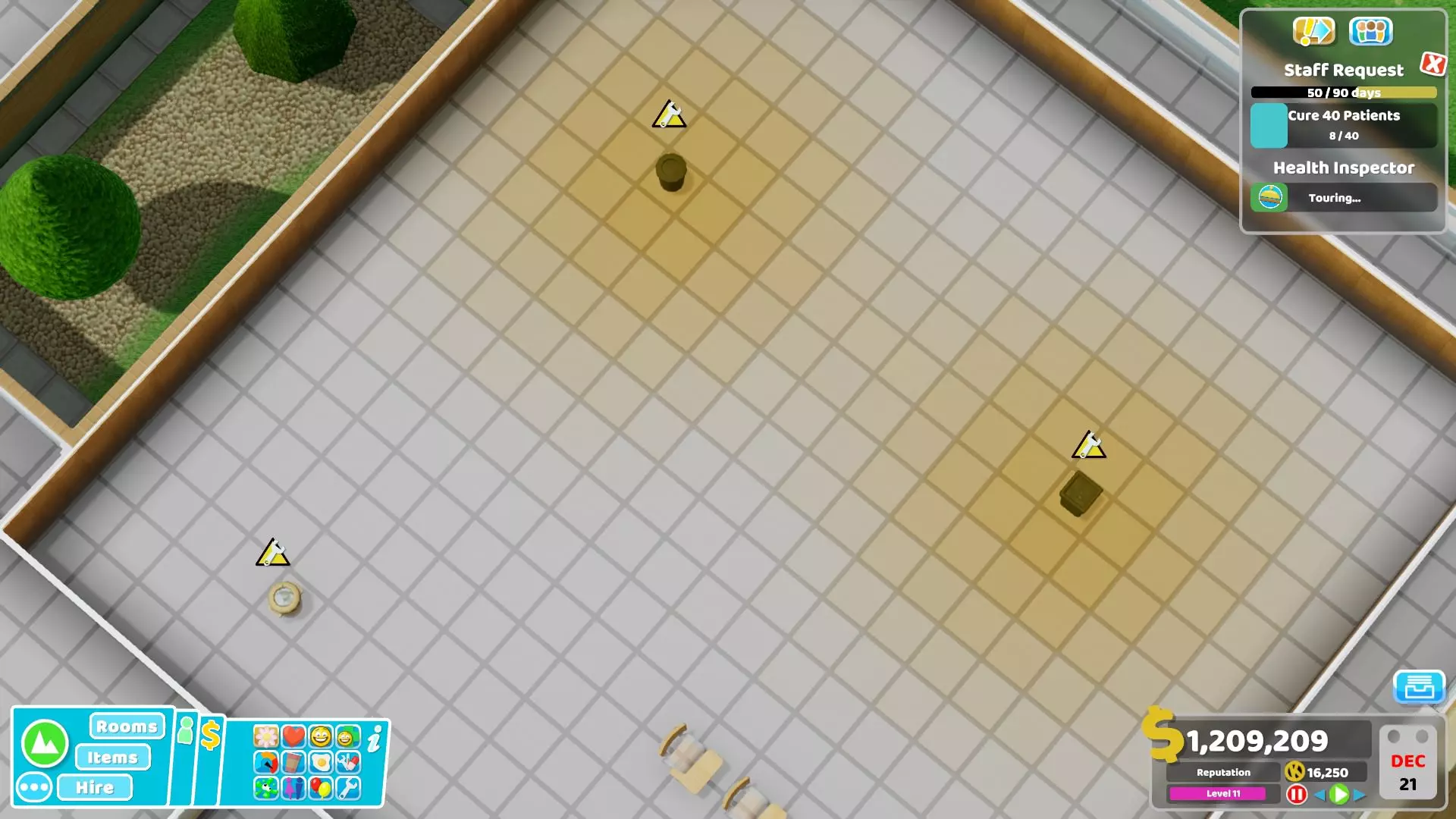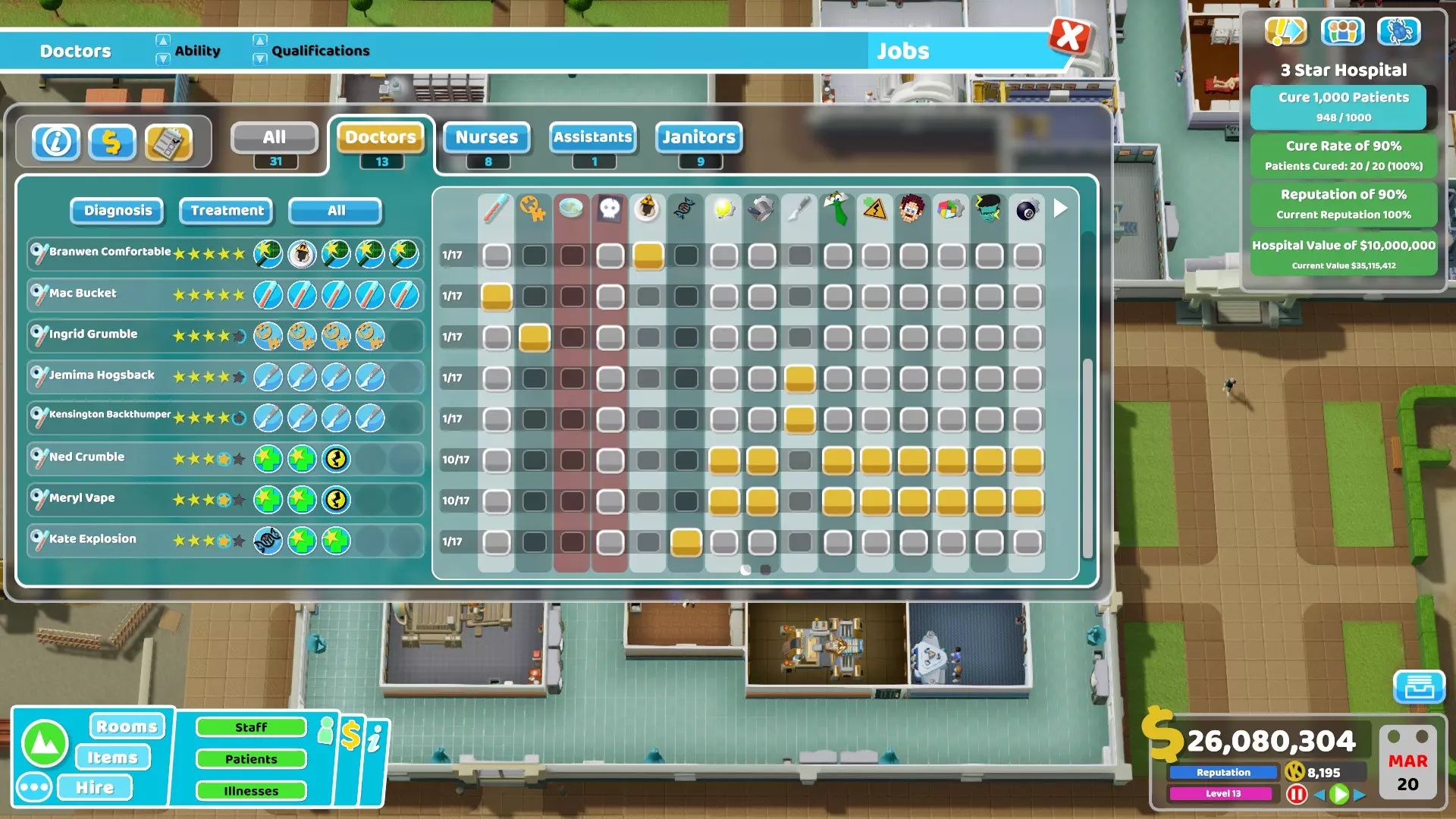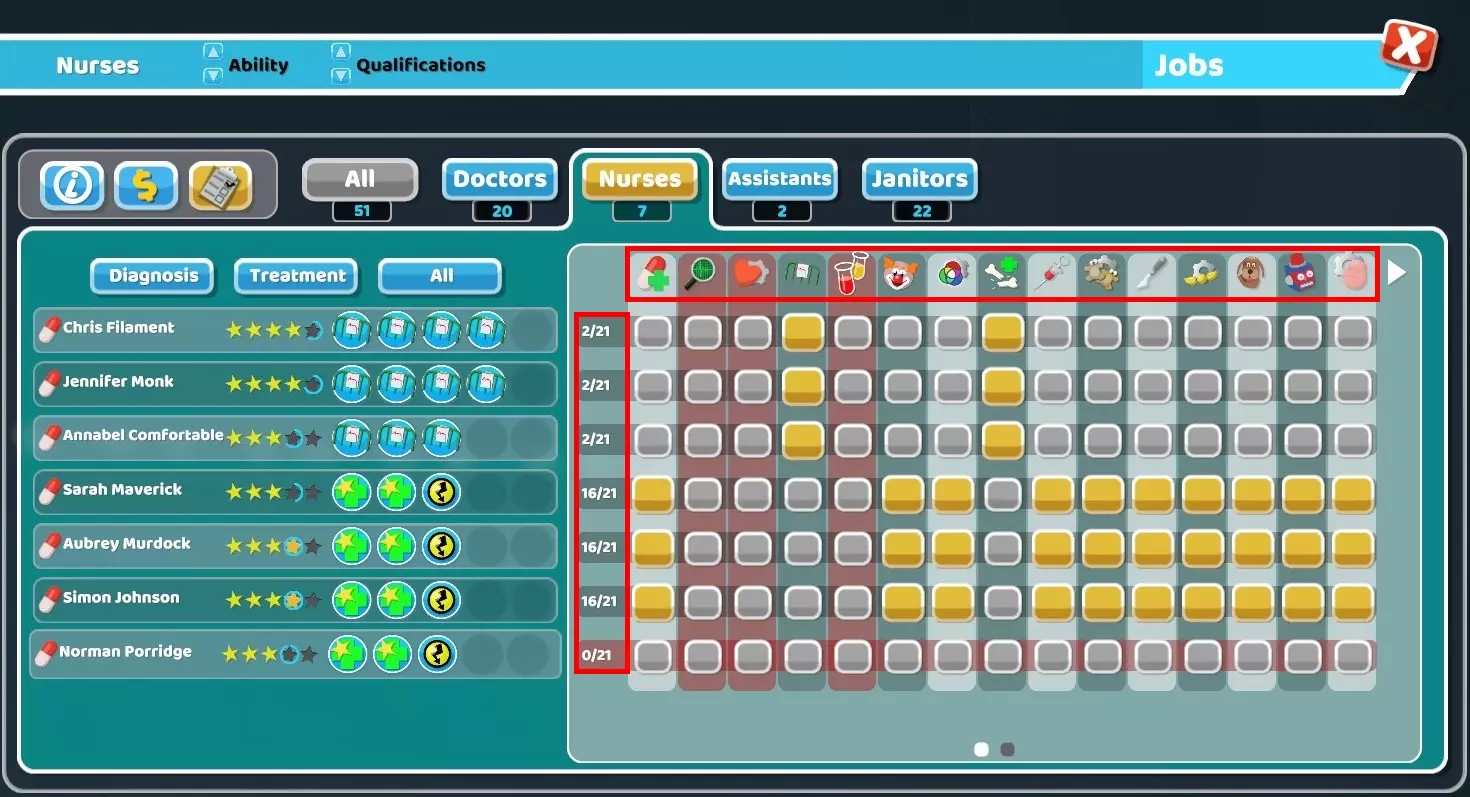32) Janitors can struggle a lot with all their tasks especially during missions with a lot of natural disasters. Here are some things that can be done to reduce their workload : - Remove all plants from the hospital, use other items that don't require maintenance. - Make sure to use the Big Bins, these are by far the best ones to reduce the workload of janitors. In cold environment using the incinerator from the Close Encounters DLC inside rooms can also help a little bit but I don't recommend it in hallways. - If you have spare money, use the Water Closets or the Golden Toilets instead of the normal ones. They are more durable and will therefore also reduce the workload. - Avoid buying unnecessary or far away plots, otherwise janitors will waste a lot of time just moving from a building to another. - If you have the Pebberley Island DLC and if the mission is in a hot environment, do not use Aircon Units at all. Instead rely completely on Ice Sculptures to lower the temperature since they don't require maintenance. - If you want to reduce the workload even more, you can use Drinking Fountains or Water Coolers and Sweet Dispensers (or even Carrots from Off The Grid if you want) since they don't require maintenance compared to other food/drink machines. It might be a bit overkill though, using items providing bonuses like the Luxury Snack Machines is usually better.33) Here is a table showing all buffs and debuffs given to staff members when the energy and happiness are above or below a threshold.Unhappy (happiness below 20%)Happy (happiness above 80%)Exhausted (energy below 5%)Tired (energy between 5% and 20%)Energised (energy above 80%)All employees-20% move speed+10% move speed-40% move speed -50% happiness-20% move speed -20% happiness+10% move speed +10% happinessDoctors and Nurses-10% diagnosis and treatment skill -2% happiness for patients when taking care of them+10% diagnosis and treatment skill +5% happiness for patients when taking care of them-20% diagnosis and treatment skill -5% happiness for patients when taking care them+10% diagnosis and treatment skill Doctors also get +10% research skillAssistants-20% customer service and marketing skill -2% happiness for patients when taking care of them+20% customer service and marketing skill +5% happiness for patients when taking care of them-20% customer service and marketing skill -4% happiness for patients when taking care of them+20% customer service and marketing skillJanitors-20% maintenance and upgrade skill+20% maintenance and upgrade skill-20% maintenance and upgrade skill+20% maintenance and upgrade skill Basic tips to prevent bankruptcy Here are some tips to help you get a profitable hospital. An important thing to note is that monthly expenses mostly come from wages (and loans) so it's actually not that hard to run a profitable hospital in most missions if you are careful. There is also an energy bill but there is not much you can do to reduce most of it and the amount is usually low anyway (see the "Energy cost" chapter for more info). 1) Only build rooms when necessary. There is no need to build all diagnosis rooms directly at the start of the mission. Just build one room and only build a new one when necessary (when the in-game notification telling you that a patient couldn't be diagnosed shows up). Of course, the same applies to treatment rooms, only build them if it's required to cure patients. However, if you have enough money do not hesitate to build treatment rooms when they are required since they give more money than diagnosis. 2) Do not recruit extra employees at the beginning, only recruit what's necessary to run the hospital. If there is no queue, a doctor or nurse can even take care of more than 1 treatment room. For example, I easily managed to get 3 star during the Croquembouche mission with 2 doctors taking care of 6 of the different treatment rooms and 2 nurses taking care of 5 of the other treatment rooms. It was possible because I kept the hospital at level 11 (to have less patients at once) but you get the idea, it's not necessary to have en employee per room in the case of treatments. 3) Never recruit employees with the "Expensive" trait (called "Wants more money" in the recruitment screen). Of course, avoid any other negative trait when possible but "Expensive" is one of the worst. On the contrary, one of the best trait to look for is definitely "Cheap" (called "Will work for peanuts" in the recruitment screen). 4) Never recruit overqualified applicants i.e. those with more than 2 stars since they cost way too much every month, except for example if you see a level 3 doctor with 3 General Practice skills and no negative trait. Recruited overqualified employees cost more monthly than employees who reached the same level after being recruited as juniors. 5) Never take a loan or do it only when you are confident it will help or if it's really necessary, for example to save your hospital by building a treatment room that will make it profitable. I used to always take loans when I started playing this game to quickly invest the extra money. However, it's often a bad idea since it makes the game more difficult with the extra monthly expense it brings if you are not careful. Note that the interest cost by itself is not that high, it's just that if you are in a bad situation after taking loans, it won't help to "lose" money each month. 6) Do not needlessly give pay rise to your employees just because you feel generous, even during promotions. Only increase salary when they are unhappy until they are satisfied (yellow neutral emote) but even that is optional if you are already struggling with money. Employees are fine as long as their happiness gauge doesn't go below 20%. Even if it does, making them take a break is usually enough to bring back their happiness to a higher level. 7) Emergencies are great opportunities to earn a lot of money. If possible, make sure to always accept them. It doesn't matter if y