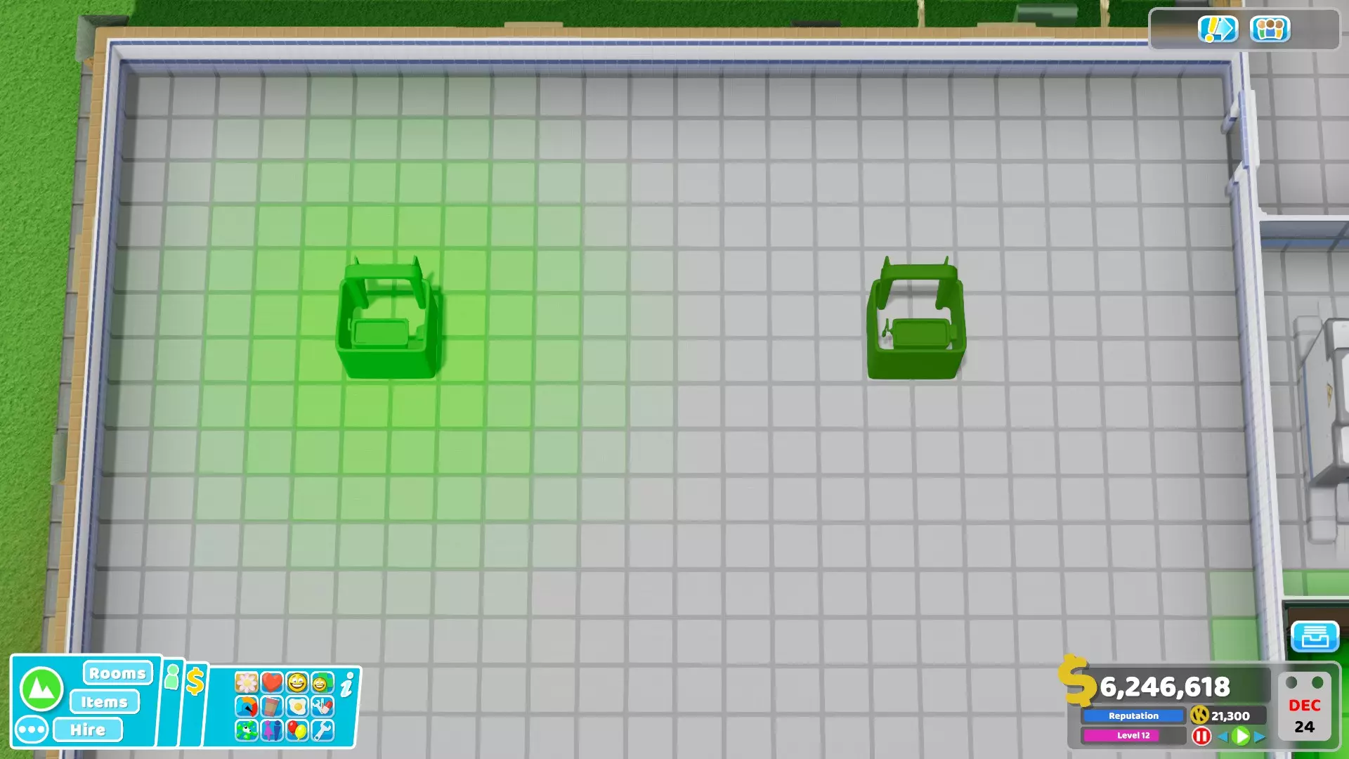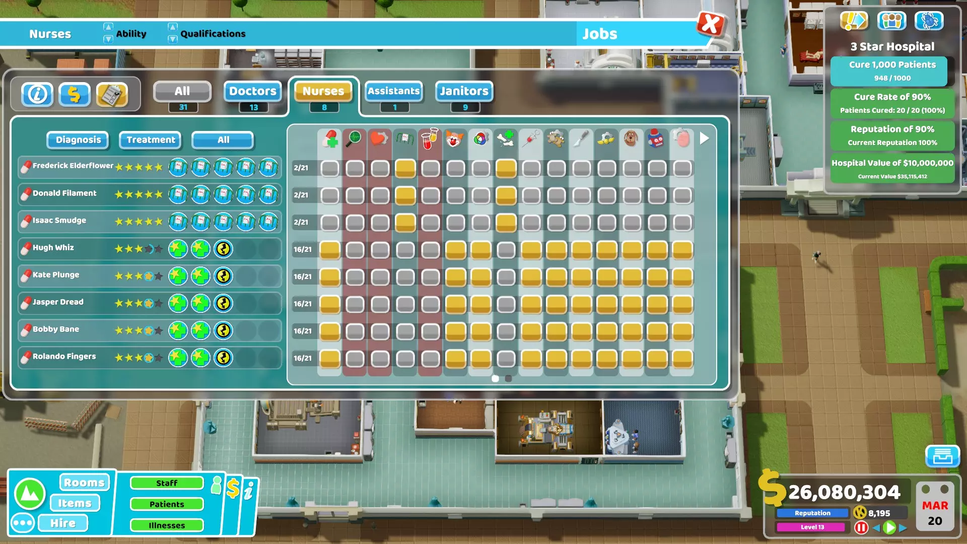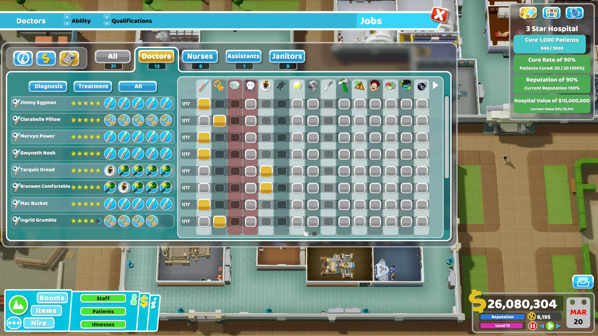 32) Janitors can struggle a lot with all their tasks especially during missions with a lot of natural disasters. Here are some things that can be done to reduce their workload : - Remove all plants from the hospital, use other items that don't require maintenance. - Make sure to use the Big Bins, these are by far the best ones to reduce the workload of janitors. In cold environment using the incinerator from the Close Encounters DLC inside rooms can also help a little bit but I don't recommend it in hallways. - If you have spare money, use the Water Closets or the Golden Toilets instead of the normal ones. They are more durable and will therefore also reduce the workload. - Avoid buying unnecessary or far away plots, otherwise janitors will waste a lot of time just moving from a building to another. - If you have the Pebberley Island DLC and if the mission is in a hot environment, do not use Aircon Units at all. Instead rely completely on Ice Sculptures to lower the temperature since they don't require maintenance. - If you want to reduce the workload even more, you can use Drinking Fountains or Water Coolers and Sweet Dispensers (or even Carrots from Off The Grid if you want) since they don't require maintenance compared to other food/drink machines. It might be a bit overkill though, using items providing bonuses like the Luxury Snack Machines is usually better.33) Here is a table showing all buffs and debuffs given to staff members when the energy and happiness are above or below a threshold.Unhappy (happiness below 20%)Happy (happiness above 80%)Exhausted (energy below 5%)Tired (energy between 5% and 20%)Energised (energy above 80%)All employees-20% move speed+10% move speed-40% move speed -50% happiness-20% move speed -20% happiness+10% move speed +10% happinessDoctors and Nurses-10% diagnosis and treatment skill -2% happiness for patients when taking care of them+10% diagnosis and treatment skill +5% happiness for patients when taking care of them-20% diagnosis and treatment skill -5% happiness for patients when taking care them+10% diagnosis and treatment skill Doctors also get +10% research skillAssistants-20% customer service and marketing skill -2% happiness for patients when taking care of them+20% customer service and marketing skill +5% happiness for patients when taking care of them-20% customer service and marketing skill -4% happiness for patients when taking care of them+20% customer service and marketing skillJanitors-20% maintenance and upgrade skill+20% maintenance and upgrade skill-20% maintenance and upgrade skill+20% maintenance and upgrade skill Basic tips to prevent bankruptcy Here are some tips to help you get a profitable hospital. An important thing to note is that monthly expenses mostly come from wages (and loans) so it's actually not that hard to run a profitable hospital in most missions if you are careful. There is also an energy bill but there is not much you can do to reduce most of it and the amount is usually low anyway (see the "Energy cost" chapter for more info). 1) Only build rooms when necessary. There is no need to build all diagnosis rooms directly at the start of the mission. Just build one room and only build a new one when necessary (when the in-game notification telling you that a patient couldn't be diagnosed shows up). Of course, the same applies to treatment rooms, only build them if it's required to cure patients. However, if you have enough money do not hesitate to build treatment rooms when they are required since they give more money than diagnosis. 2) Do not recruit extra employees at the beginning, only recruit what's necessary to run the hospital. If there is no queue, a doctor or nurse can even take care of more than 1 treatment room. For example, I easily managed to get 3 star during the Croquembouche mission with 2 doctors taking care of 6 of the different treatment rooms and 2 nurses taking care of 5 of the other treatment rooms. It was possible because I kept the hospital at level 11 (to have less patients at once) but you get the idea, it's not necessary to have en employee per room in the case of treatments. 3) Never recruit employees with the "Expensive" trait (called "Wants more money" in the recruitment screen). Of course, avoid any other negative trait when possible but "Expensive" is one of the worst. On the contrary, one of the best trait to look for is definitely "Cheap" (called "Will work for peanuts" in the recruitment screen). 4) Never recruit overqualified applicants i.e. those with more than 2 stars since they cost way too much every month, except for example if you see a level 3 doctor with 3 General Practice skills and no negative trait. Recruited overqualified employees cost more monthly than employees who reached the same level after being recruited as juniors. 5) Never take a loan or do it only when you are confident it will help or if it's really necessary, for example to save your hospital by building a treatment room that will make it profitable. I used to always take loans when I started playing this game to quickly invest the extra money. However, it's often a bad idea since it makes the game more difficult with the extra monthly expense it brings if you are not careful. Note that the interest cost by itself is not that high, it's just that if you are in a bad situation after taking loans, it won't help to "lose" money each month. 6) Do not needlessly give pay rise to your employees just because you feel generous, even during promotions. Only increase salary when they are unhappy until they are satisfied (yellow neutral emote) but even that is optional if you are already struggling with money. Employees are fine as long as their happiness gauge doesn't go below 20%. Even if it does, making them take a break is usually enough to bring back their happiness to a higher level. 7) Emergencies are great opportunities to earn a lot of money. If possible, make sure to always accept them. It doesn't matter if y