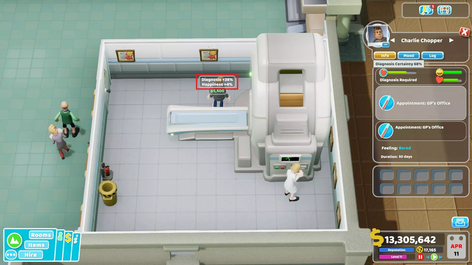 Note that those tests were done in a specific hospital with specific parameters. It's possible that there are more factors affecting the dispatch system like machine level, room prestige, queue size or other less obvious factors (and maybe even bugs). Also those results only show the first dispatch from a GP to a diagnosis room, maybe subsequent dispatches for difficult illnesses have their own priority rules. By the way, be careful and don't just build all diagnosis rooms after seeing those results. Building a room and recruiting an employee raise the hospital level gauge. This can significantly increase the number of patients coming to your hospital and have a big impact on queues if you aren't ready. Update (February 2020): Many people claimed that a well trained GP doctor is much better at dispatching patients to the good rooms. So I checked to see if that's true and the short answer is that the qualification itself doesn't matter, it's the level of the doctor that "improves" the dispatching ability. I tested the theory in a similar controlled experiment as above but I focused only on one illness this time. I chose Lycanthropy because of the interesting modifiers it has. To diagnose it, Fluid Analysis and Cardiology are much better than all other rooms with a 41% modifier. Psychiatry is good with a 20% mod but still inferior. All other rooms have a modifier of 5%. First I checked with a level 1 doctor, the dispatch ratio matched the modifier ratio which again proved the fact that GP doctors don't randomly dispatch patients and base their choices on the modifier values. This low level doctor sent most patients to Cardiology, Fluid Analysis but also a good amount to Psychiatry and from time to time but rarely to other rooms. I switched the doctor with a level 2, then level 3, then 4 and 5 fully trained GP doctor and what's interesting is that the higher the level and the less they sent patients to Psychiatry room and other rooms with low modifiers. In the end, the level 5 doctor was only sending them to the Cardiology and Fluid Analysis which are by far the best rooms in this case and not once to other rooms. Then I checked what changes the doctor behavior to confirm if it's the qualification, the diagnosis skill or the level. Ultimately, I found out that a level 5 doctor with only research skills and 120% diagnosis skill was only choosing the best rooms contrary to a level 2 doctor with 2 GP skills and 120% diagnosis skill. Conclusion: GP doctors naturally send patients to the rooms with the highest modifiers more often. The higher level the doctors are and the more likely they will choose the rooms with the highest modifiers. Their qualification and diagnosis skill don't matter, only their level is important to improve their dispatch efficiency. However, diagnosis skill is still very important anyway so teaching them General Practice skills exclusively remains the best training choice in my opinion. Chance to die and gauges depletion Here is another table with some data that aren't necessarily useful but still interesting I think. It includes the % chance to die when a treatment fails. For information, note also that for all illnesses in the game, the chance to show up as a ghost after death is 50%. Regarding Happiness and Health numbers, it basically means that a patient with a multiplier higher than 1 will have the Happiness or Health gauge deplete faster. For information, all other vital needs gauges deplete over time at the same speed for all base game illnesses except for "Boggled Mind" and "Bogwarts". Patients with Bogwarts have their Toilets gauge deplete twice as fast as other patients. Patients with Boggled Mind have their Hunger, Thirst and Boredom gauges deplete twice as fast as other patients. An interesting thing to note is that all illnesses in psychiatry have no chance to kill a patient when the cure fails. IllnessChance to dieHealthHappiness8-bitten50%11Animal Magnetism25%0.751Bed Face10%0.50.75Boggled Mind0%0.11Bogwarts20%11Broken Face30%11Clamp0%0.750.75Cross Bones30%11Cubism100%11Decision Rash40%11Denim Genes100%11Emperor Complex0%0.11Floppy Discs50%11Flumps100%11Freudian Lips0%0.11Grey Anatomy0%0.751Grout0%0.50.5Gurning Loins50%11Heart Throb50%11Humerus Injury30%11Hurty Leg30%11Inflated Ego0%0.11Jazz Hand10%11Jest Infection0%0.10.75Jumbo DNA100%11Lazy Bones10%0.751Leopard Skin100%11Lightheadedness100%0.751Litter Bug40%11Lycanthropy20%11Mime Crisis0%0.11Misery Guts20%11.2Mock Star0%0.10.75Monobrow10%11Mood Poisoning40%1.51Mucky Feet10%11Night Fever0%0.11Pandemic25%0.751Pipe Organs50%11Portishead10%11Potty Mouth20%11Premature Mummification25%11Pudding Blood40%11Rock Bottom40%11Shattered30%11Shock Horror50%11Spinal Bap50%11Spontaneous Combustion40%11Touch of Midas100%11Turtle Head50%11Verbal Diarrhoea20%0.750.75IllnessChance to dieHealthHappiness Full diagnosis during first GP visit - Part 1 Since diagnosis bonus provided by multiple medicine cabinets stacks, many of us wondered whether it's possible to diagnose all illnesses at 100% with only a single visit of the General Practice office. So take a look at the tables below to see how many cabinets are required to 100% diagnose an illness during the first GP visit. I wanted to have a table with all illnesses directly included there but it's too big for Steam. So I used a format similar to Mavocide's table that can be found there with interesting info: https://www.reddit.com/r/TwoPointHospital/comments/9f623m/gp_diagnosis_formula_and_number_of_medicine/ GP modifiers and illnesses (for reference) 10%: Spontaneous Combustion, Touch of Midas, Anty Matter, Hyperrealty 15%: Gurning Loins, Jazz Hand, Jumbo DNA, Pudding Blood, Aurora Snorealis, Evergreen, Goobris, Buccanear, Jellied Feels, Placid Reflux, Shadow Boxer, Highly Ill-Suited, Isotrope, Warped 20%: Emperor Complex, Knightmares, Nerological Imbalance, Space Caged 25%: Cross Bones, Denim Genes, Flumps, Heart Throb, Leopard Skin, Shattered, Dead Arm, Half Pipe, Shin B