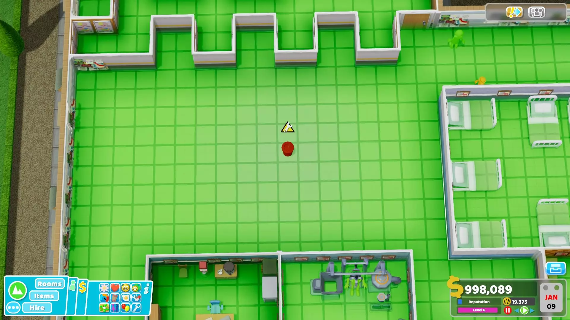 金色马桶和抽水马桶的另一个优点是,它们能显著提升房间声望,从而更容易提高房间声望等级。房间声望等级似乎对使用厕所的患者完全没有影响。不过即便如此,这对员工仍然有用,因为他们在房间内时仍能从中获得幸福感提升。 最后,我发现的最后一个优点与巨无霸超级公司的首席执行官珍宝·麦克纳利有关。当这位VIP访问厕所房间时,他会使用并占用一个马桶,这会立即将其维护值降至0%,需要清洁工进行维修。但他只会破坏普通马桶,如果房间里只有金色马桶或抽水马桶,他就不会采取任何行动,只会直接离开房间。如果你负担得起(2000美元非常昂贵),我强烈推荐使用黄金马桶。它们相比普通马桶的优势非常明显。如果你使用普通马桶,确保在附近放置能提升吸引力的物品(比如可以挂在马桶后面墙上的奖杯、海报或画作)。 治疗是如何运作的? 与诊断阶段不同,患者只会前往一个治疗室,然后离开医院。除了完成任务目标外,治愈几率本身并不那么重要,因为即使治疗失败,患者仍会支付相同金额的费用。尽管要确切了解治疗机制并非易事,但令人惊讶的是,它彻底改变了优化员工培训的方式,使得大多数旧指南在这方面都已过时。