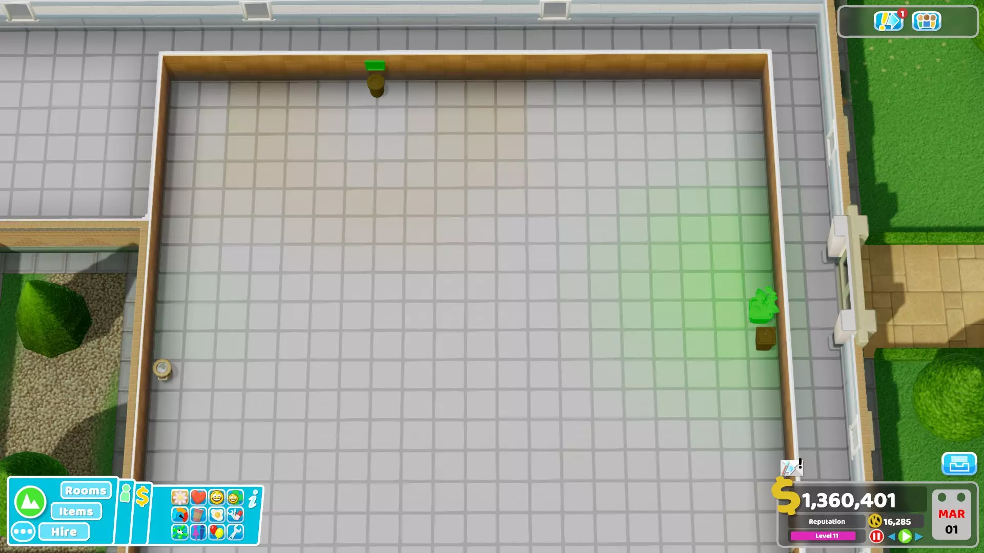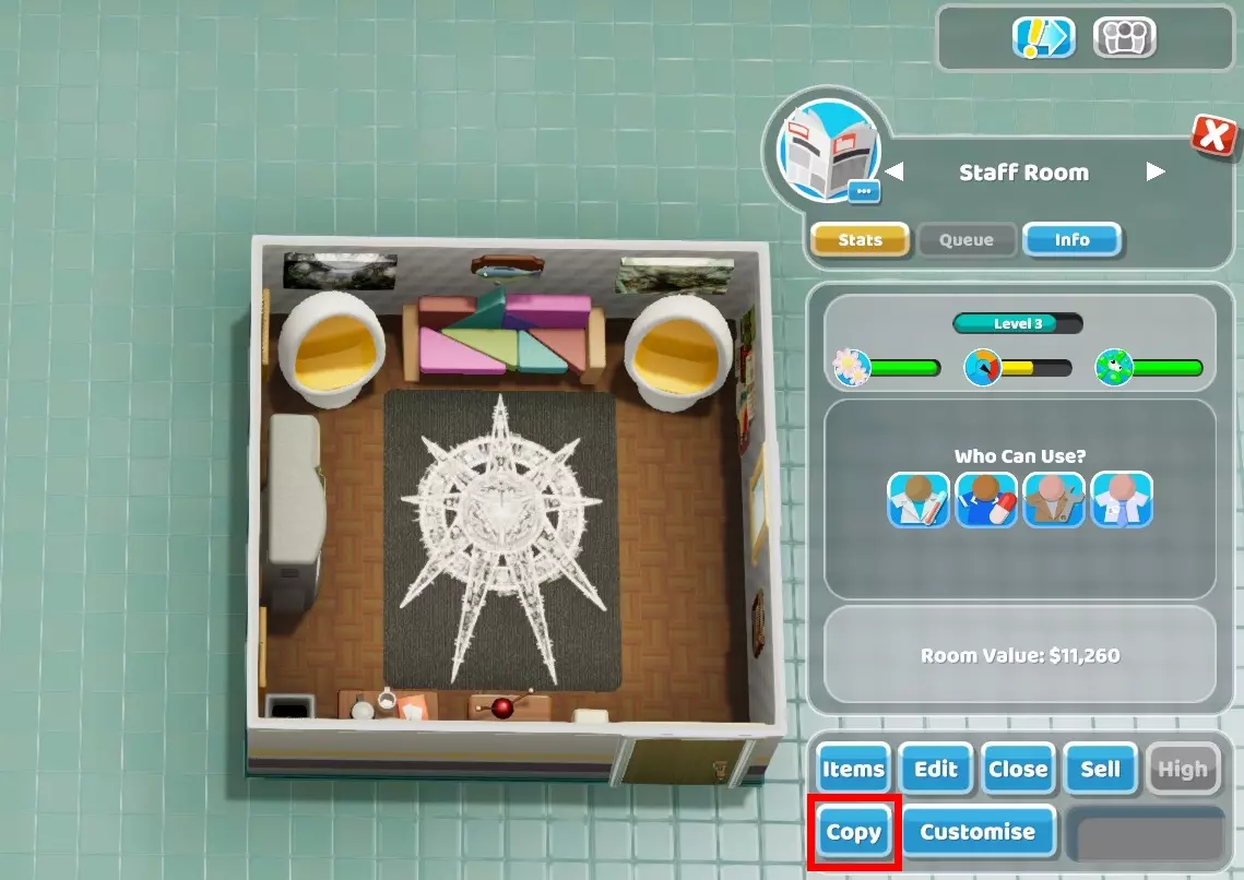 4) When Happiness of a medical employee is above 80%, they gain the buff called "Happy" which increases their treatment and diagnosis skill by 10% but also move speed by 10% even though it's not written in the buff description. A happy employee taking care of a patient also gives them +5% happiness. When Energy of an employee is above 80%, they gain the buff called "Energised" which increases their speed, treatment, diagnosis and research skill by 10%. They instantly lose those buffs when happiness/energy goes under 80%. A table with all buffs and debuffs given to staff when the energy and happiness are above or below a threshold can be found at the tip 28.5) When employees are training to get a skill, they slowly gain energy over time. Try to use that to your advantage and not waste that extra energy by sending them to the training room when their energy is between 20 and 60%.6) Bonuses provided by items like "+1% Training Speed" stack. With enough training boost items and/or teaching/learning trait and qualification, it's possible to have a training duration of less than 1 day: https://www.youtube.com/watch?v=hSeU_m1PtGI&feature=youtu.be However, there is no point aiming such a short time since it requires too much effort to set-up everything. Lowering the duration below 4 or 5 days requires a ton of boost items. If you have the extra money, it's still a good idea to add boosting items to reduce the training duration since missing one important employee during a long time can be bad.7) Just like the Motivation skill, Caffeine Buzz (from Coffee Maker item) only increases move speed. The buff boosts the speed to 200 which seems to be the max and makes employees run. However, it's extremely short and only lasts 20 seconds... Nothing too crazy. Note that Energy Buzz (from Energy Drinks Machine) has the same effect but lasts 30 seconds. Also it seems like employees will only drink a coffee if they are thirsty (when thirst is at least 40% depleted). And if there is an endless flow of patients they will never take the time to drink at all (they will only play the cosmetic animation making them look at the coffee machine) !8) When an employee is working, 1 energy is lost every ~6.6 seconds. The energy should take around 11 minutes to go from 100 to 0 energy. For an employee with the Stamina qualification, 1 energy is lost every ~8.9 seconds. Therefore, it takes around 14 minutes 48 sec for the energy to go from 100 to 0. By default, an employee works 134 in-game days before taking a break. With Stamina Training, an employee works 178 days before taking a break, it's 44 days more which can be very useful for surgeons for example. Note also that an employee with the Stamina qualification seems to recover energy more slowly. ~11 energy every 20 seconds against ~15 energy for others without Stamina qualification. Generally, it's not an issue since energy tends to be full before the end of the break if you didn't change the break policy.9) Plants look good and the attractiveness bonus they bring is nice. However, except for cosmetic purpose it's better to rely on other objects like posters, paintings, awards to increase attractiveness of an area. Since those items don't need watering, your janitors can focus on other more important tasks. Plants can actually have a negative attractiveness effect if your janitors don't manage to water them all quickly enough. That's also why they are less reliable.10) When you increase prices, you can see that some patients will refuse to pay. One of the most important factors affecting the chance to pay is the happiness of the patient, another factor in treatment rooms is if a cure fails or succeeds. Overall, just keep in mind that an unhappy patient will be less willing to pay higher prices. The happiness threshold defining if they will pay or not seems to depend on the illness and prices. In most cases, they will pay any price (even +100%) when their happiness is above 50% during the payment process. However, if the treatment fails they will need more happiness to be willing to pay, with +100% prices the threshold seems to be around 55-65% happiness depending on the illness. When patients pay higher prices, they lose happiness. For example, getting diagnosed in the mega scan room with prices at +100% can make the patient lose around 25% happiness. That's why I recommend not increasing prices for GP offices and even for diagnosis rooms. Patients will be more happy when entering the treatment room and be more likely to pay increased prices there where it's the most profitable.11) It's usually recommended to avoid using benches. The main reason is that they make patients take more time to enter a room when it's their turn. Without any bench, patients are all standing in line right next to the door and as long as they stay there, they will very quickly enter the room. While technically standing patients take more space in hallways than sitting patients, benches can also create some chaotic situations especially if there aren't enough for everyone. Sometimes patients seem to randomly stand-up and switch places which is annoying. However, benches have a benefit, they reduce the happiness loss over time of sitting patients (they don't seem to affect the needs or health gauges at all). I usually do not buy benches but if you intend to use them I recommend making sure there are enough for every patients, or you should probably not use them at all. Having some people standing and others using benches while queuing to enter the same room can make people have trouble moving through the hallway depending on the layout. General tips - Part 2 12) Room prestige level increases happiness over time of staff in the room. At level 1: it provides no benefit. At level 2: it provides the buff "Nice Room" => +5% happiness At level 3: it provides the buff "Good Room" => +10% happiness At level 4: it provides the buff "Amazing Room!" => +20% happiness At level 5: it provides the buff "Out