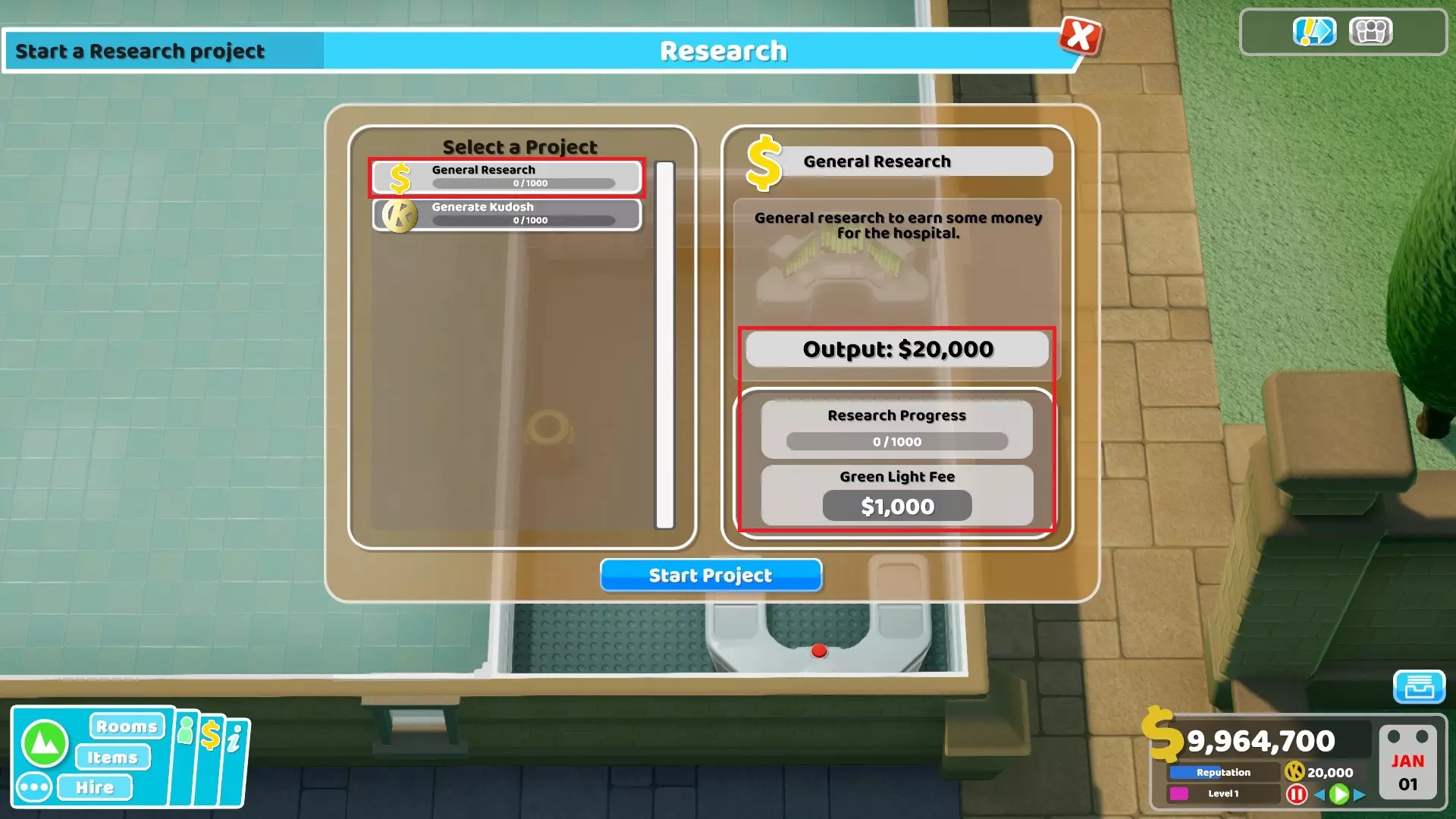 A. Is it worth it to use research to earn money ? Thanks to the calculator[docs.google.com], it's quite easy to answer this question. Yes, it can be very profitable with the proper setup. First, let's talk about items boosting the Research Powers. Note that Research Monitors, Researcher's Desk, Servers, Super Computers, Deep Thing 1 and 2 all have a monthly energy cost and can potentially make the player lose money instead of helping. Therefore, only use Research Monitors, Researcher's Desks, Super Computers or Deep Thing 1 when : - you have a solo researcher at level 4 at least - or 2 researchers at level 2 or above - or 3 researchers with at least one at level 2 - or when there are more than 3 researchers Only use Deep Thing 2 when : - you have a solo researcher at level 3 at least - or at least 2 researchers, with one at level 2 or above An important thing to note is that the Science Station (from Close Encounters DLC) doesn't have any energy cost and is very cheap, so you can use it anytime if you want even though it's quite big for just 1% Research Power. Keep in mind Servers are quite inefficient since the Research Power they provide is twice as costly per month as other boosting items. It's better to rely on other items. These boosting items can significantly reduce the time it takes for researches to complete and make research very profitable in the long term. Just use the calculator to see how much impact will have the addition of some items for your setup. Except the Science Station, these items are all very expensive though. That said, if you have spare money it's still better to place some of these objects than having money sleep for nothing. If you need money, you can still sell them anyway to get your money back. Something else to be aware of is that Servers, Super Computers, Deep Thing 1 and 2 also increase temperature around them. B. Profitability per project completion Here is how much money is gained in average after completing the "General Research" money project with 1, 2 and 5 doctors with the skill from research I to research V. Days displayed are the number of days it takes to complete the project including break days. No items are used. 1 level 1 doctor (~345 days) = 1 803$ 1 level 2 doctor (~200 days) = 7 403$ 1 level 3 doctor (~141 days) = 9 301$ 1 level 4 doctor (~109 days) = 9 737$ 1 level 5 doctor (~89 days) = 9 042$ 2 level 1 doctors (~173 days) = 2 370$ 2 level 2 doctors (~100 days) = 7 731$ 2 level 3 doctors (~71 days) = 9 532$ 2 level 4 doctors (~55 days) = 9 915$ 2 level 5 doctors (~45 days) = 9 187$ 5 level 1 doctors (~69 days) = 2 710$ 5 level 2 doctors (~40 days) = 7 928$ 5 level 3 doctors (~29 days) = 9 671$ 5 level 4 doctors (~22 days) = 10 022$ 5 level 5 doctors (~18 days) = 9 274$ As we can see researchers become much more "efficient" at level 3 or above. If you intend to make money with research, try to recruit doctors with the "Cheap" trait and reduce their expected salary during promotion. Researchers aren't really more efficient when happy contrary to medical staff, so just make sure their happiness is above 20%, otherwise it doesn't matter. C. Long term profitability As pointed out by Nspace, the above chapter only takes into account the profitability for only one research project. Here is on average how profitable each group of doctors will be in the long term. Let's take a time span of 5 years (1 825 days). 1 level 1 doctor = 9 542$ 1 level 2 doctor = 67 679$ 1 level 3 doctor = 120 835$ 1 level 4 doctor = 163 971$ 1 level 5 doctor = 187 068$ 2 level 1 doctors = 25 085$ 2 level 2 doctors = 141 358$ 2 level 3 doctors = 247 670$ 2 level 4 doctors = 333 943$ 2 level 5 doctors = 380 136$ 5 level 1 doctors = 71 712$ 5 level 2 doctors = 362 394$ 5 level 3 doctors = 628 176$ 5 level 4 doctors = 843 857$ 5 level 5 doctors = 959 339$ Since 5 level 5 doctors can research much faster, they are ultimately the most profitable research group. The issue with 5 level 5 doctors is that it will require a lot of micro management, since you will have to start a new project every 18 days or so. Obviously, make sure to instantly pause the game as soon as a project is finished to start a new one and thus avoid paying doctors and energy for nothing. In any case, don't forget that it's not cheap in terms of money/time to train these doctors so keep that in mind. D. Initial costs The initial cost of the construction of the room, the recruitment fees of the doctor(s) and the training costs mean it will take time for research to really become profitable. If we include those costs for the solo level 4 doctor we have: Research room price = 35 100$ Recruitment fee = 1 650$ Research I training = 15 000$ + 37 days of training by default Research II training = 20 000$ + 42 days of training Research III training = 25 000$ + 46 days of training Research IV training = 30 000$ + 50 days of training Salary during the 37 days of training = 1 724$ Salary during the 42 days of training = 2 302$ Salary during the 46 days of training = 3 025$ Salary during the 50 days of training = 4 110$ 35 100 + 1 650 + 15 000 + 20 000 + 25 000 + 30 000 + 1 724 + 2 302 + 3 025 + 4 110 = 137 911$ As you can see, 137 911$ is quite an investment... Let's see how many level 4 campaigns are needed to repay this investment. A campaign lasts around 109 days if we include break days. We get around 9 737$ per campaign. 137 911 / 9 737 = ~15 It takes 15 research projects to pay the investment. This means we need 5 years of research to repay the initial investment with level 4 campaigns, it's obviously more than that if we take into account early campaigns made before the doctor reaches level 4. If you have more than 1 researcher, make your own doctor train the others so you can at least reduce the costs there. Having more researchers will help to quickly repay the investment. Finally, if you play the Bigfoot DLC, it unlocks more money research projects in the campaign (doesn't seem to be available in the sand