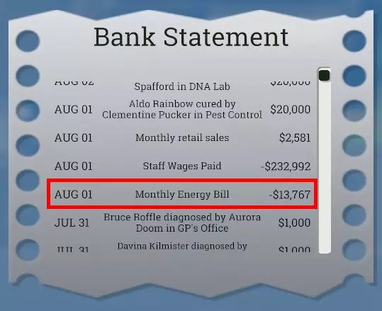 Here is below the energy cost per month of all items. If any of these items is in the hospital at the end of the month then it will be taken into account in the monthly energy bill: - 3$ per snacks, fruits, vegetables and drinks machine / arcade machine / arm bot / charging point / test-your-strength / vanity chamber / trampoline / gum dispenser / vaulting box - 10$ per wall monitor / pin art / accordionatron / velocipede / frozen art / - 15$ per ice sculpture - 20$ per pinball machine / energy beam - 25$ per small radiator / small aircon unit - 30$ per incinerator / wall aircon unit / shark bin - 50$ per radiator / furnace / aircon unit / mini radiator / hologram / fireplace / researcher's desk / research monitors - 75$ per large radiator - 100$ per supercomputer / server / deep thing 1 / deep thing 2 For "cosmetic" items, only the following ones seem to cost money each month: - 3$ per cryptohedron - 5$ per lamp / lava lamp / circus lights / torch - 10$ per television / retro TV / space cowboy / some keys / floppy clock / fossil / fitzpocket statue / cheesewater statue / gazplank statue / black & white / fascinator / orrery / maestropod / silver fox / pine cone / bust / armless statue / hypercube / puzzling cubes / blob fish / rocket pig / swinging balls / cat person / ex-lizard / bone lizard / mount facemore / dog portrait / ghost mirror / speaker stack / pool toy / origami / golden statuette / giant glass / shark art / jewel / grandfather clock / gretchen sign / ambulance race track / weather or not - 50$ per indoor fountain / large fountain / dolphountain / jasmine statue / love statue / golden gubbins and... ski rack for some reason For rooms, it's more complicated. There is no energy bill for rooms when they aren't used. There is an exception with the research room that costs 100$ each month by default (even when nothing is researched). For diagnosis and treatment rooms with a machine, they increase the energy bill based on the number of patients that are processed each month and the energy cost depends on the room itself. The energy bill increases by 100$ for each patient that was processed for example in the General Diagnosis and Pharmacy rooms. In other rooms like Fluid Analysis, DNA Lab, Mega Scan, etc the energy cost is higher with 250$ per processed patient. Note that I didn't check all rooms so it's possible other rooms have different costs per processed patient but it doesn't really matter since nothing can be done to change that. Rooms without a machine (GP office, Ward, Psychiatry...) that I checked don't seem to increase the energy bill at all even when processing patients. Interesting unlockable items - Part 1 I will list below the items I use the most or at least that may be worth unlocking with Kudosh in my opinion. I am only talking about items that affect gameplay significantly enough. General Items: Luxury Snacks Machine - K300 - $2 000 A snack machine that also increases happiness so it's obviously quite useful. Snack and drink machines that increase happiness are obviously the best choice if you have patients rage quitting because of happiness falling to 0. They are also probably the best too if you tend to increase treatment prices in your hospital (patients with high enough happiness won't refuse to pay high prices when cured). Fancy Food Machine from Culture Shock DLC is a much more powerful version of this item but has the downside of massively increasing thirst. Amusing Snack Machine - K500 - $2 000 (Pebberley Island DLC) A snack machine that also reduces boredom, a 2-in-1 item that can somewhat replace other items that reduce boredom of the patients making it a powerful machine. However, note that boredom isn't something employees have to worry about, so it will just be like a normal snack machine for the staff using it. Absorbent Snack Machine - K500 - $2 000 (Bigfoot DLC) A snack machine that also reduces the toilet need but increases thirst. The thirst increase is around 10% while the toilet reduction is random at either 15% or 100%. With this, it's easier to run a hospital without building any toilet or just to have patients/staff go to the toilets less frequently. Luxury Drinks Machine - K300 - $2 000 (unlocked in Tumble with 3 stars) A drink machine that also increases happiness so it's very useful. Just like the snacks version, it's usually the best to use especially if you increase medical prices. Laxative Drink Machine - K500 - $2 000 (Pebberley Island DLC) Very powerful item but with a drawback that can be bad depending on the hospital layout. It makes the patient's health increase over time while the toilet gauge decreases at a much higher speed. An issue with this machine is that your staff don't care about the health increase but will still get the toilet gauge decreasing faster if they use it. It's probably not worth it most of the time, however if you have many patients dying before treatment it's definitely an item that can help. Energy Drinks Machine - K200 - $1 000 A drink machine that also provides a temporary move speed boost. If happiness/health isn't an issue for you, it's a good drink machine. Water Cooler - K200 - $400 (Close Encounters DLC) A very cheap and small drink machine that never needs to be refilled by a janitor. It can be very useful to reduce their workload even though I prefer using other items that provide a bonus. Note that the Drinking Fountain is a very similar item that is slightly cheaper and don't require any DLC but has the downside of lowering hygiene by 4% when used which is acceptable. Sweet Dispenser - K45 - $300 Small item that can also be placed in work rooms. If a staff member is hungry and not busy (meaning no patient queuing at all), they can satisfy their hunger need thanks to this. Note also that contrary to most other food machines, it doesn't need a janitor at all. Replication Station - K200 - $2000 (A Stitch in Time DLC) Patients can use it both to drink or to eat so it can save space to only have t