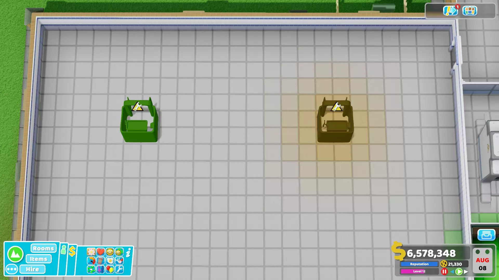 由于医院的卫生度默认是全绿的,所以这一点可能不太明显,但所有垃圾桶(除了有毒废物垃圾桶、鲨鱼垃圾桶和鸭子垃圾桶)都会降低周围的卫生度。与美观度类似,垃圾桶的维护量表数值越高,这种效果就会逐渐增强。