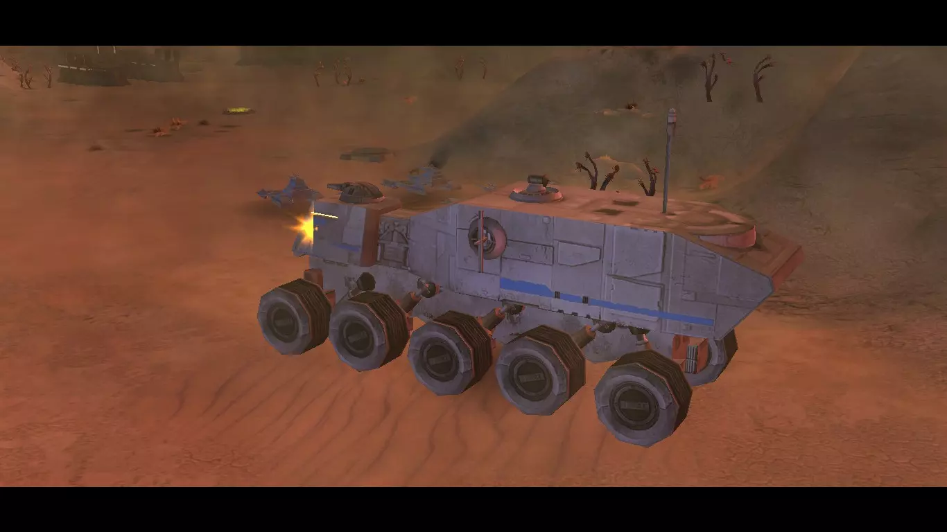 TIE Mauler(钛破击机)非常适合执行反步兵任务,因为这是它的主要职责。钛破击机也是一种速度极快的载具,同样能够执行侦察任务;但它相当脆弱,装甲轻薄,很容易被轻型载具摧毁。现在,你应该使用钛破击机并将其当作反步兵载具,但如果没有任何侦察兵可用,你也可以将其用作侦察载具。 在刚开始银河征服模式时,钛破击机是你最早获得的地面单位之一,AT-ST(全地形侦察步行机)也是如此。在作为帝国的最初几天,你的科技等级为1,你必须充分利用现有的资源。我知道使用小型枪械可能不太顺手,但在拿到真正的好家伙之前,你必须先凑合用着。AT-ST对付载具还算不错,不过它的射速较慢,对付步兵尤其是PLEX士兵时就不太理想了……那些蠢货!不过,我扯远了。AT-ST需要一个能对付步兵的搭档,而这个特定的搭档就是TIE Mauler。现在要注意,驾驶TIE Mauler时你必须动作迅速,才能轻松消灭步兵威胁,因为PLEX士兵能很快摧毁TIE Mauler。TIE Mauler凭借其出色的速度,还能轻松碾压敌人,所以尽管这么做吧,这既简单又能有效消灭PLEX士兵。使用TIE Mauler时,你应该始终配备后备单位,以抵御任何试图摧毁它的载具。 一旦你能够掌握将反步兵载具与反坦克载具结合成具有威胁性的混合部队的能力,能够高效地对抗任何步兵或载具单位,那么你将成为行星战争的最高指挥官。 2-M 反重力坦克 现在我们来介绍2-M 反重力坦克,它可以说是游戏中最平衡的支援载具。2-M 反重力坦克是你在科技等级2时获得的载具,它优于AT-ST,是其间接的精神继任者。我建议将这种载具用于你的防御部队,因为它消耗得起,价格相当低廉且威力强大。一个小队由4辆坦克组成;它们配备了标准坦克爆能炮,当所有坦克协同作战时,能轻松摧毁T2B。此外,它们还装有护盾,护盾激活时可抵御爆能炮伤害,但要记住,护盾仅能防御爆能炮攻击,无法抵挡如PLEX导弹之类的投射武器。 关于2-M反重力载具,首先需要了解一些背景知识和注意事项。首先,也是最重要的一点,这是一种反重力悬浮载具,并非在所有星球上都能运行。其次,由于没有腿或履带,它无法碾压敌方步兵;但它也有优势:作为反重力悬浮载具,它能在水面和大多数帝国载具无法进入的地形上悬浮行驶,更不用说它还具备速度优势。关于历史,其实相当有趣。2-M实际上是克隆人战争期间使用的TX-130光剑级坦克的前身。TX-130是一款出色的载具,而2-M与其非常相似,因为它与TX-130共享相同的基本设计,但2-M在武器装备、护盾、装甲和整体战斗效能方面都有巨大改进,性能更为优越。 两侧的两张图片是克隆人战争时期的TX-130。