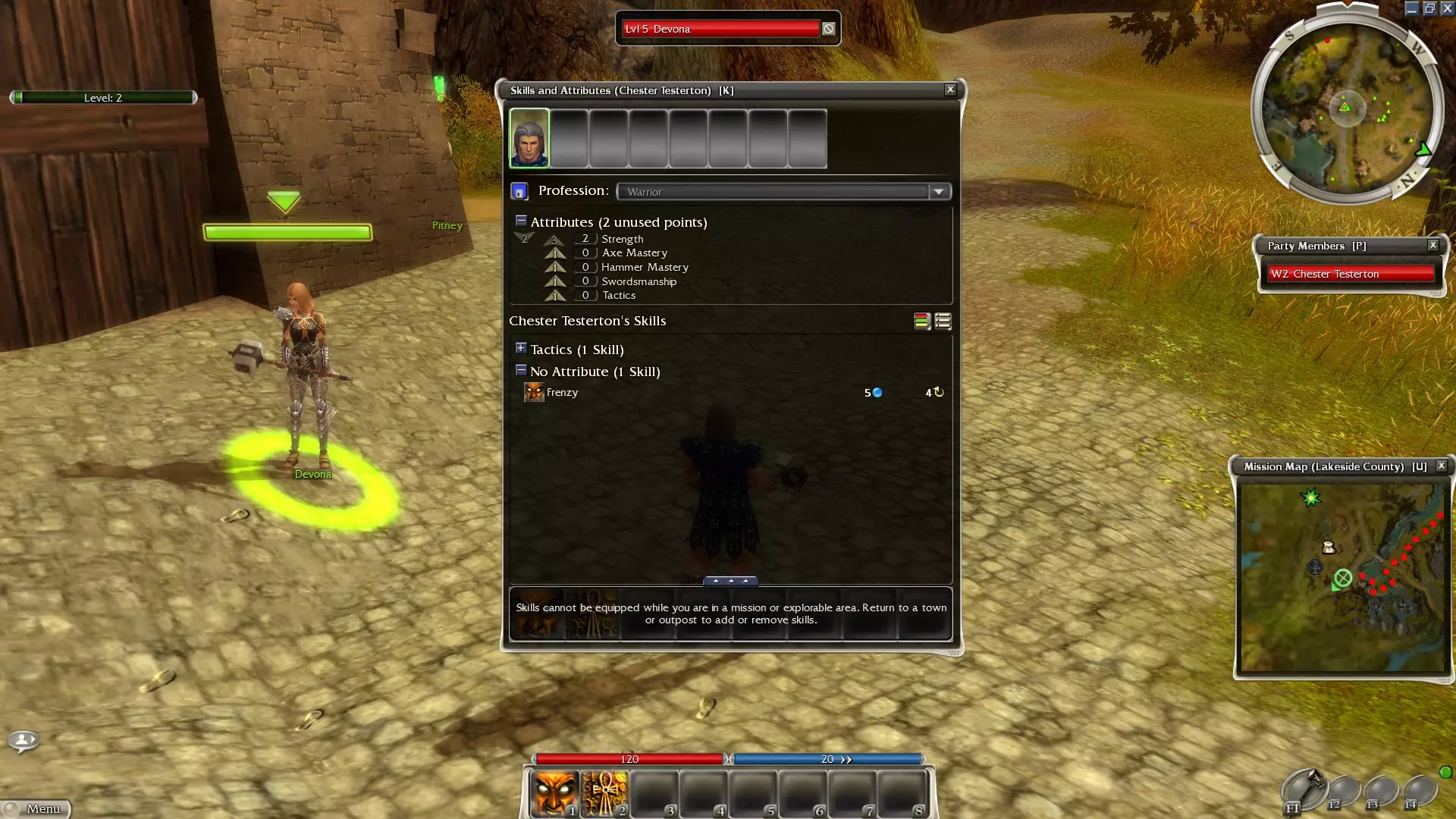 每次升级你将获得1点技能点和属性点。你可以通过属性名称左侧的箭头分配属性点,箭头中的数字会显示进一步提升该属性所需的点数。这些点数可以在任何城镇或前哨站自由重新分配,因此无需担心分配错误。 每个职业都有一个专属的【主要属性】,该属性仅作为该职业的主要职业属性。 战士:力量——攻击技能每级获得1%护甲穿透。 游侠:专精——所有游侠技能的能量消耗每级降低4%。 僧侣:神圣恩赐——以盟友为目标的技能每级额外治疗3.2点生命值。死灵法师 灵魂收割:每当范围内有敌人死亡,每等级获得1点能量。 幻术师 快速施法:减少所有幻术师技能的施法时间和冷却时间。 元素使 能量储存:每等级增加3点最大能量。 充分利用职业的主要属性至关重要,因为你职业的所有技能通常都会从中受益。你还会在技能与属性面板中注意到,已解锁的任何技能都列在其相应的属性下。为任何技能的属性线添加点数通常会使该技能更有效:受该属性等级影响的数值会以绿色显示。德沃娜的新任务【令人不安的传闻】将指引你前往阿什福德修道院,在那里,抄写员米拉科会向你介绍地图旅行功能。从阿什福德出发,按M键打开世界地图,即可传送回阿斯卡隆城,阿尔敏·萨伯林会在那里为你讲解副职业相关内容。你可以随时从游戏中的任何地点,传送到之前访问过的任何城镇或前哨站。不过,若从可探索区域使用地图传送,该区域将立即重置,未拾取的掉落物会消失,怪物也会重新刷新。 副职业 副职业是《激战》中的一大优势,但对新玩家而言,也可能带来困扰。即便是老手,也应该先学好自己的主职业,再投入时间或资源到副职业上。在游戏的这个阶段,其他职业的主要作用是帮助你填充技能栏,直到你获得更多本职业的技能来替换它们,同时也能让你体验其他职业的玩法。 由于设计原因以及主属性的独占性,任何角色在副职业上的表现都不会比以该职业为主职业的玩家更有效。例如,一个强大的元素使技能可能需要消耗25点能量,这比某些职业的总能量还要多。幻术师的某些技能可能需要三秒施法时间,但主职业幻术师凭借其主属性几乎可以瞬发相同技能。副职业僧侣的治疗效果永远无法与主职业僧侣相提并论。 随着游戏进程推进,你最终将能与NPC雇佣兵(“佣兵”)一同冒险,他们能运用自身技能来辅助你的技能。这意味着你无需将僧侣作为副职业来治疗自己:僧侣佣兵始终可供你使用,战士和元素使等其他职业的佣兵亦是如此。 在这个起始区域,你将有机会尝试所有可用的子职业。作为参考,我的《激战》入门指南详细介绍了其他一些职业(参见:职业/专业)。如果你感兴趣,可以随意尝试其他职业,否则请准备好确定你的选择。注意这条消息: