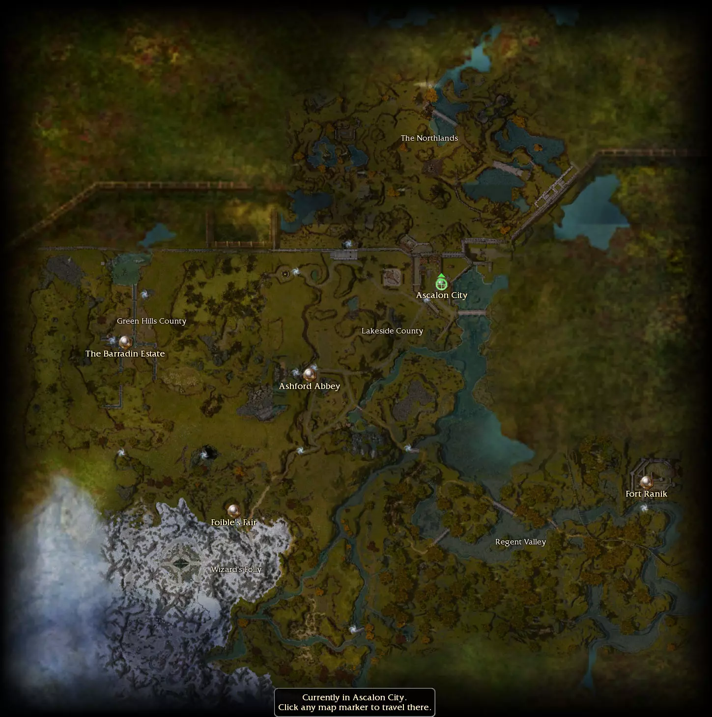 接受任务后,请注意屏幕右上角的指南针。指南针边缘会出现绿色箭头,指示下一个任务目标的方向。当目标进入范围内时,指南针上会显示绿色星爆图标,标记任务目标的准确位置。 与任务相关的NPC和可交互物体上方会显示绿色符号。新任务的符号为感叹号,任务目标的符号为向下箭头。 找到并与泰达斯爵士交谈,完成你的第一个任务并接取后续任务。接取后续任务后,按“L”键打开任务日志,你刚接取的任务会列在【主要任务】下方。主线任务是推进游戏剧情必须完成的任务。你可以随时查看任务日志来追踪当前激活的任务。注意,在日志中左键点击任务标题会激活该任务,并在指南针上显示指向下一个任务目标的箭头,且任务给予者和目标通常不会在指南针上标记,除非是与当前激活任务相关的。 按住键盘上的CTRL键会高亮显示玩家和敌人的名字。按住ALT键会高亮显示NPC和物体。这两个键都可以透过墙壁或其他障碍物高亮显示目标,如果你难以找到玩家、NPC或任务目标,这会很有帮助。可探索区域 你的下一个任务【战争准备】将引导你离开城镇,进入湖畔郡。进入该区域时会出现提示:当你在城镇外冒险时,你将拥有自己的私人世界副本。若想与朋友一同游玩,只需在离开城镇前组成队伍即可。 湖畔郡和游戏中的大多数区域一样,都是针对你的队伍进行实例化的。这意味着你击败的敌人在你离开该区域前不会重生,NPC会根据你的情况出现或消失。例如,完成你的下一个任务【职业测试】后,NPC哈弗斯丹会通过阿斯卡隆城的传送门出现,交给你下一个主线任务【进一步的冒险】。 道路对面就是一个复活神龛。每个游戏区域通常有多个【神社】,当你靠近时它们会点亮。如果你被击败,将在最近激活的神社处重生。