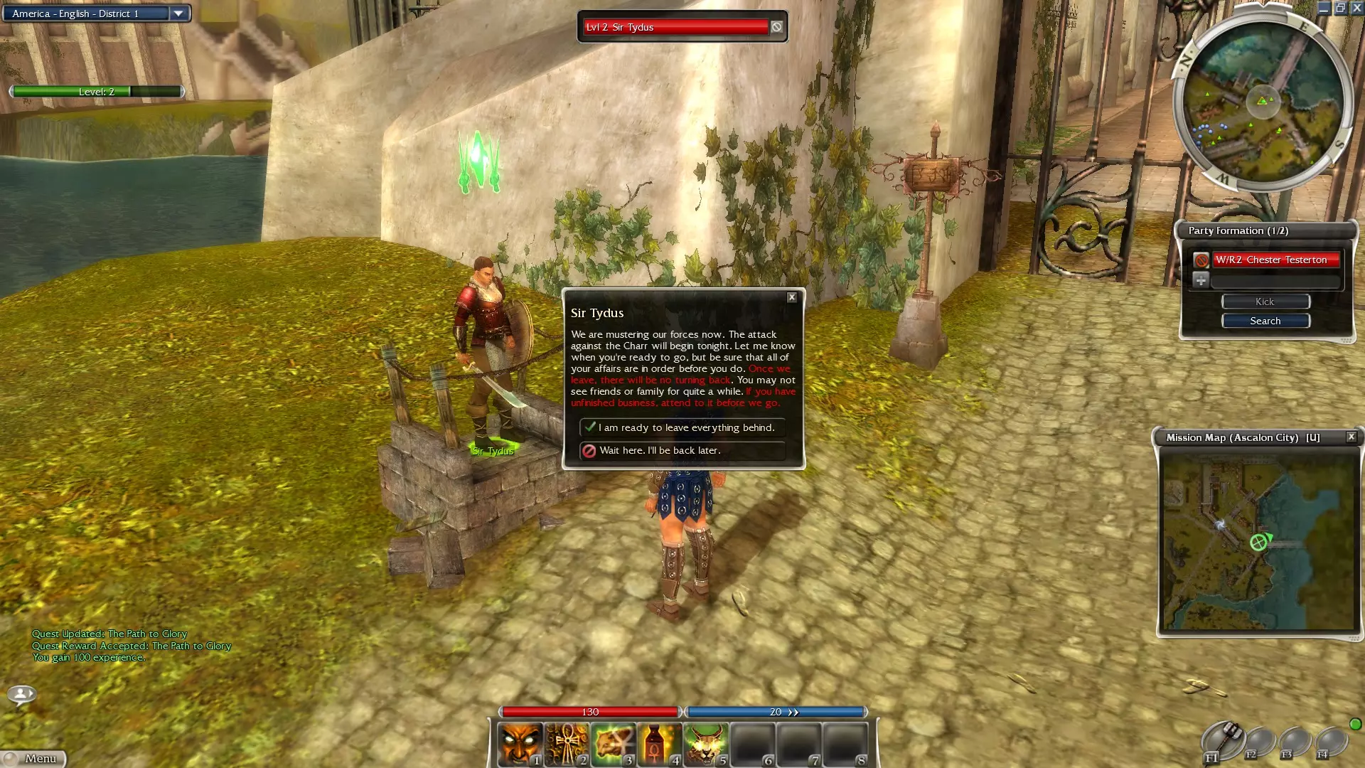 虽然从技术层面来说,你确实无法再尝试第二职业,但这种说法具有误导性。实际上,如果你愿意,之后是可以更换第二职业的,只是要等到游戏后期才能进行。 以下是关于第二职业实用性的一些信息: 战士:战士通过呐喊和姿态来增强自身防御并支援队伍。例如战术技能“小心戒备!”能暂时为你附近的队友提供额外护甲。 游侠:当玩家选择游侠作为第二职业时,通常是为了能有宠物陪伴战斗,不过他们除了“安抚动物”外,往往不会为宠物携带其他额外技能。野外生存之灵有时也会由副职业游侠携带,不过其施法时间可能会让人望而却步。 僧侣:大多数选择僧侣作为副职业的玩家,是为了获得像【复活】这样的强力复活技能,以便复活倒下的队友。僧侣作为副职业的效果远不如作为主职业,而且治疗工作最好还是交给指定的治疗者。如果你作为副职业僧侣携带【治愈】技能,其他玩家会嘲笑你并离开你的队伍。 死灵法师:死灵法师比较特别,因为其主属性只与能量恢复有关。这意味着任何职业只要合理分配能量,都能有效地作为死灵法师的副职,不过大多数选择死灵法师作为副职的玩家,是为了使用诅咒法术或尸体利用技能,例如【血之井】这种能在特定区域内提供生命再生的技能。 幻术师:幻术师拥有许多低能量消耗但施法时间较长的实用技能。许多玩家选择幻术师作为副职,是为了其打断技能、移除 hex 效果的能力、能量恢复技能或惩罚类技能。像【火焰祷言】这种能暂时降低火焰伤害的防御性祷言也很受欢迎。 元素使:任何职业都能成为强大的元素使,但许多元素技能的施法成本极高,且施法时间异常漫长。因此,大多数选择元素使作为副职业的玩家,都是为了其独特的能量管理技能,例如【次级能量纹章】,该技能能暂时降低法术消耗。 游戏此时引入副职业,是为了帮助玩家更好地了解其他职业的能力,以及在带领队伍时做好自身准备。在我看来,副职业可能会让玩家在最需要专注于主职业的时候分散注意力,给新手玩家带来不必要的困扰。虽然任何职业都能作为不错的副职业,但我强烈建议不要选择元素使,因为其技能的能量消耗会迅速耗尽你的技能栏能量。如果你不确定该选择什么,我建议将游侠作为你的次要职业,因为它能让你驯服宠物,并专注于你的主要职业。如果游侠已经是你的主要职业,那么我建议选择战士或幻术师。 不过,我要再次强调,大多数熟练玩家通常只会从次要职业中采用一到两个技能,除非他们使用非常特殊的build。不仅如此,熟练玩家通常不会在次要职业的特性线上浪费太多属性点。用战士施放【陨石术】,扮演一个“不可阻挡的”战斗法师可能很有趣,但这实际上是在浪费战士的核心优势,因为有许多战士技能更能为团队的胜利做出贡献。通常来说,你投入到副职业属性线上的每一点属性点,本可以更有效地分配到主属性上。如果你听从我的建议选择游侠作为副职业,那么在驯服新宠物后,你唯一需要的游侠技能就是【安抚动物】,用它来治疗和复活你的伙伴。 当你准备好后,确定你的副职业选择。 继续前进 选择副职业后,你可以选择继续推进剧情,或者完成阿斯卡隆周围的额外任务来获取经验。整个区域应被视为教程区域,在你从阿斯卡隆城的阿明·萨伯林处接取【荣耀之路】任务之前,你将无法使用账号仓库或其他额外内容,该任务还会附带此警告。