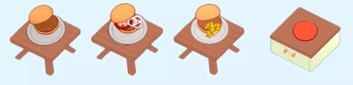 汉堡 汉堡是5级解锁的初始菜品,由煎制肉饼和汉堡面包组成。额外的卡片可能会引入新的配料或改变肉饼的烹饪方法。 配料:汉堡配料(洋葱、西红柿) 芝士汉堡(芝士) 新鲜肉饼