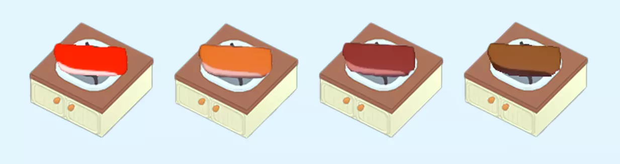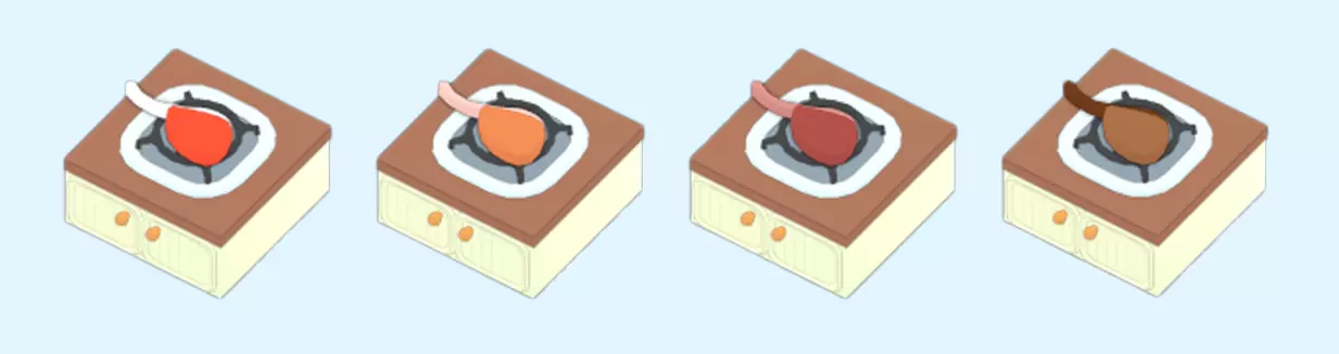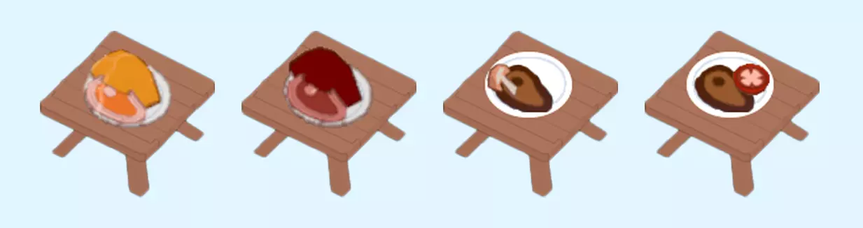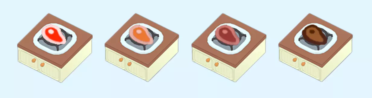 牛排 牛排是游戏中首个可解锁的食谱。所有牛排都有以下熟度: 三分熟(Rare) 五分熟(Medium) 全熟(Well done) 每个熟度等级的烹饪都需要更长时间。 当任意牛排被盛到盘子里后,就无法继续烹饪了。