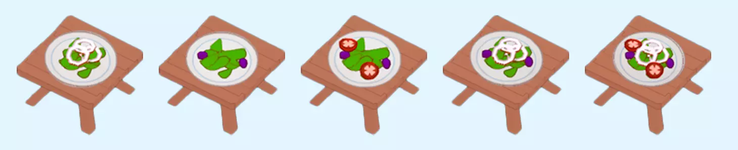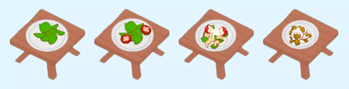 沙拉 沙拉是2级解锁的开胃菜。制作非常简单,但需要大量切配。起初客人可能会点2种沙拉: 生菜 生菜和西红柿 主菜:苹果沙拉 土豆沙拉