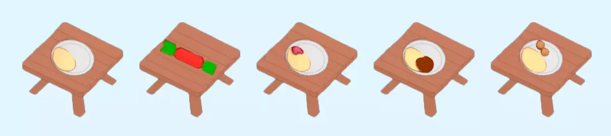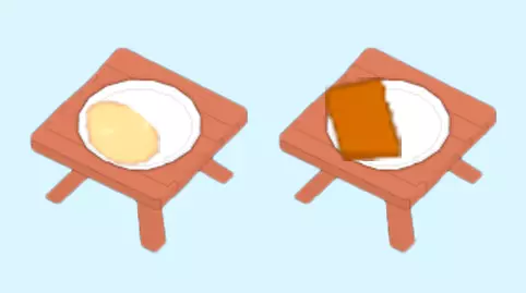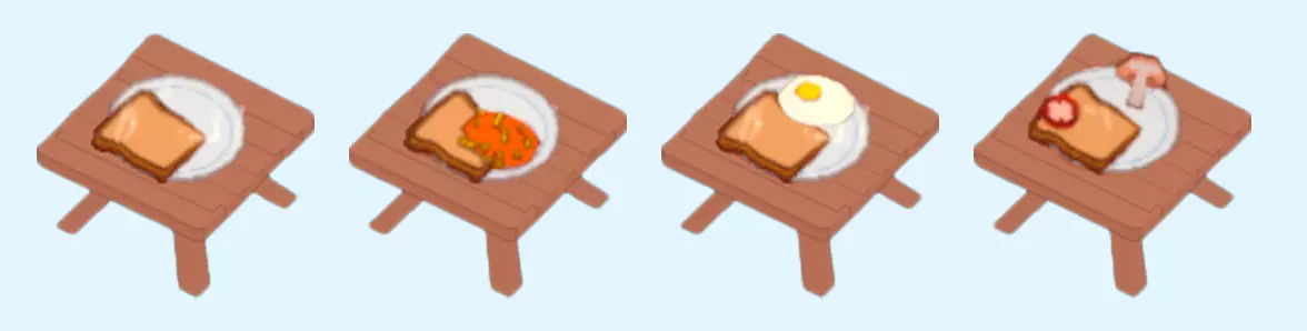 早餐 早餐是在13级解锁的初始菜品。初始食谱只有吐司,制作一条面包需要花费大量时间,但面包内含10片切片。额外的卡片会增加馅料。 配料:早餐豆、早餐蛋、早餐配料(番茄、蘑菇)