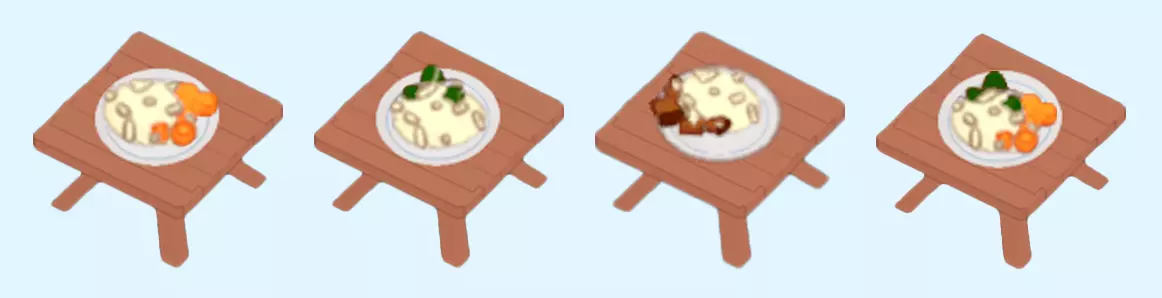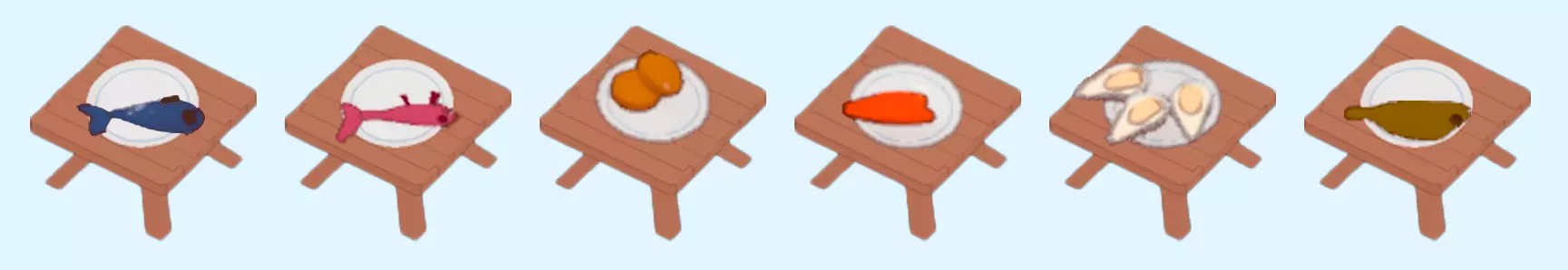 鱼 鱼是9级解锁的初始菜品。最初的蓝色和粉色鱼除了烹饪外不需要任何准备。主菜单包含许多更复杂的食谱。 主菜:蟹肉饼 鱼肉 牡蛎 刺鱼 附加项:鱼类拼盘(增加1个鱼类槽位) 鱼类拼盘(增加1个鱼类槽位)
