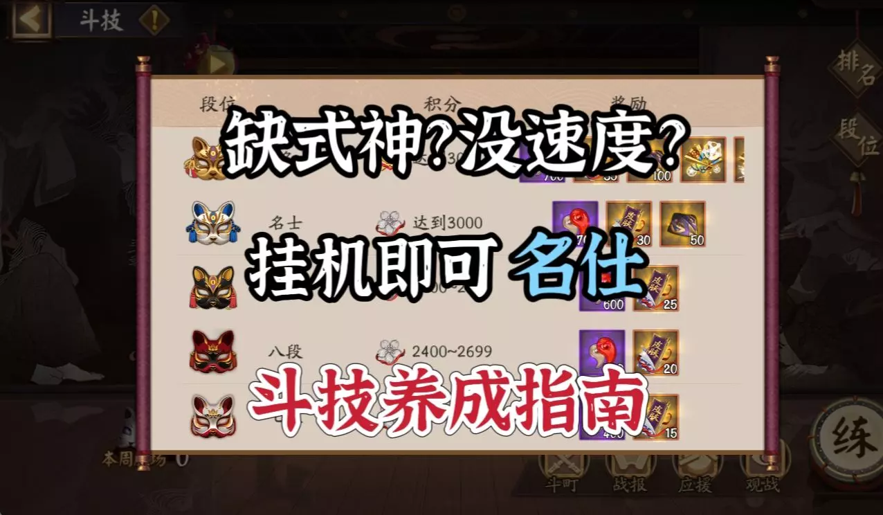 由于这款游戏存在较大的数值膨胀,所以较新的输出式神通常会更强(如SSR Asuna、SP Otake等),因此如果攻略不是最新的,直接选用这些新出的式神即可。 尽快寻找一位优秀的导师(拥有强力式神且活跃),这样你能在导师任务中获得丰厚奖励,例如技能达摩或免费的SSR/SP式神。 与导师提升羁绊等级,这样你就能借用他们的式神来通关前期游戏内容。提升羁绊的快速方法包括:一起组队刷本、赠送碎片(你可以祈愿R和SR碎片,它们对前期很有帮助,导师也能轻松提供)、邀请参加百鬼夜行、赠送友情礼包以及结界寄养。 尽量快速提升等级,因为很多游戏内容都受等级限制。等级 内容 15级 【闪耀】、【概率提升】、【首领挑战】、【玩家对战】、【活动】、【师徒系统】 20级 【宠物】、【首领挑战掉落首领魂】 27级 【魂十组队模式】 30级 【魂十一组队模式】、【终极大蛇】、【秘闻副本】、【区域首领】 50级 【派遣6星式神】 60级 【1个5星达摩】、【10个符咒】 养成 队伍配置 大多数内容中,你需要的是: 山兔:【招财猫】御魂,大量速度,2-3星即可