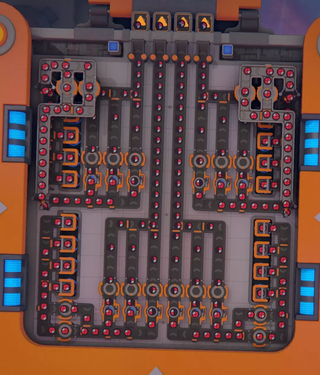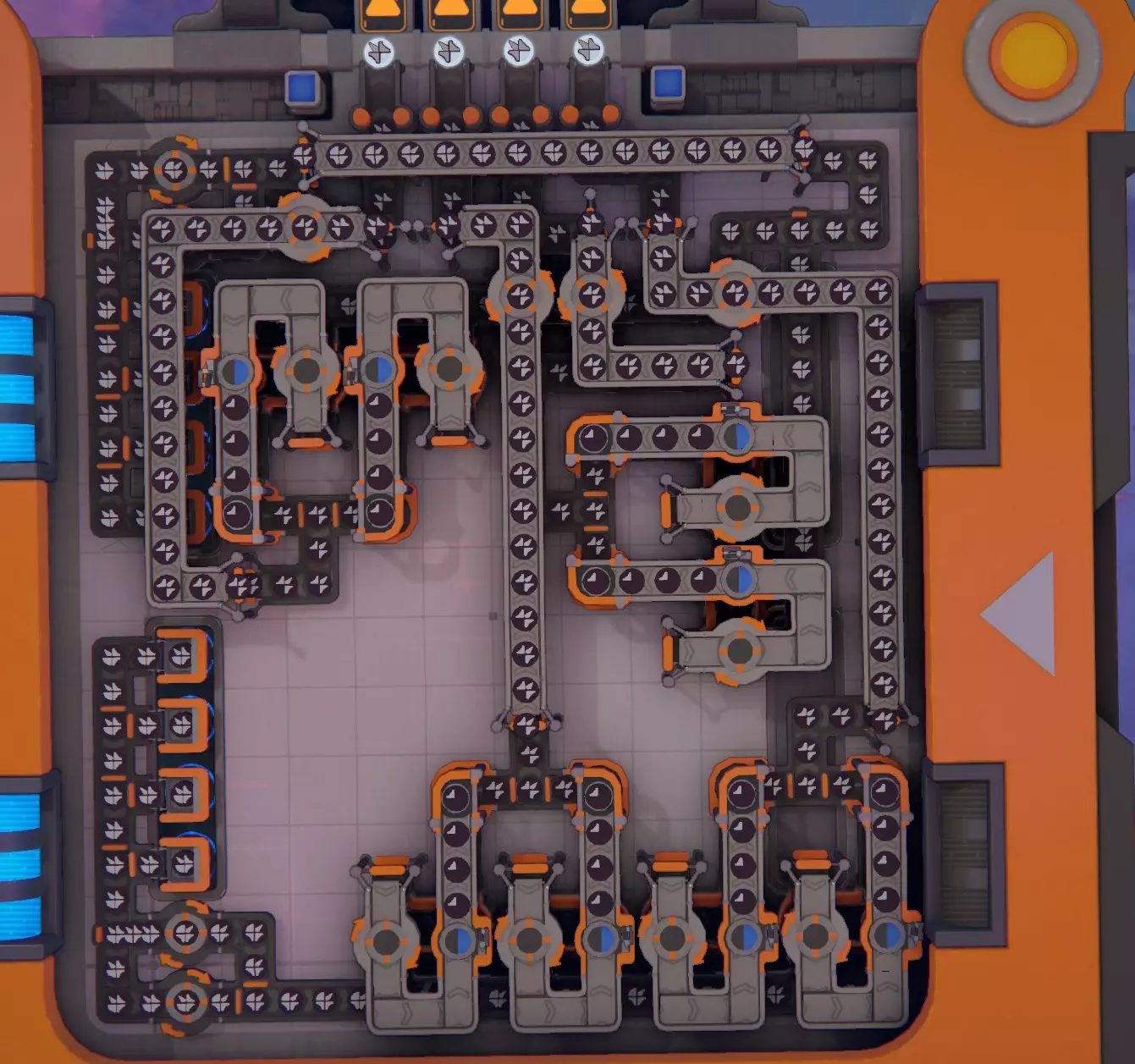 Input rotators decide which corner gets cut. Output rotators decide final rotation of the leftover 3/4. This is updated version - it does not require over-the-top updates for stackers. Equal/normal distribution of upgrades is sufficent. This outputs belts only 50% saturated. Best to just copy-paste one more and join together with space belt. Note: Because each of 4 output belts carries 50% then one rotator is enough to rotate output. SHAPEZ2-1-H4sIAGeqwGYA/6xa607jRhR+l1F/msr2eHyJtD9IYFWksGWB0q4qVM2SCbXqtaOJIxahvHttx0l898w5XiRWEL5z+eb4zLn4gzyRmWUGzCDzOzL7IL+k7xtBZuRmG/F4RQxy85LE+QdXPOVk9jcJs59n33dhtArj118XuzQV8kqs+S5Kn7gMeZxmoO2/fCNmi7fDV/aLAvVl9+O7kHbl84uL4vPnvUGu41SGYpup+CDfyOzCMsh9ZppBHjNrlvw92aX/POSw2zAW8vpnKuJtmJm2Nz6G/jBTNq/6NS8t7/PsLuLpOpE/tsSId1F0+Fbae787fLXs/SvT7xi52fl/uR2ZfZK/pMmRmps4oynm0ZGi3OoKioJQNghlQVABBORDQB4E5OqBWNWnuYjS8u+XYj2C8YuoLI/rVsjXLJ4fE2s5jPI0UebhpLzqI5CbeZfI9EHEKyGbSIMsctGvl/m/Tw31lqXi6W0oZSLFqgm2q1b0G98Hpzi4A4SXwe4W8PJBuU9SngXH77H4uuOrkceE6SNZFVma/LCJwjxFWo+Jreqz2zx3jUOjHdYrRjjtoEyDcbsDvgzXqfXH5nMi37js5c06IZeF252Wj8gw8TICvAgfL8LDi3DxIliviOJIr5K3eORADhKcauZTi0O/AoQdYe0BrFUoIzEcHFWfnIZZPkD7APxkfFO7UvbxW+gaAb/xaD0YLg4iWsGEe23VQwmzDqulyTLTzPnLf6Pmgg/YxR2whzpgF3zADHdIDMo2w7Ht4NhmKLYdMNvldQamu8QD+C6RYMLLSxTM+NlzEOWlehDnJvrS0E5CZ7b1cAH6cdI9F7+tUbewgoFdBNaZQm8zkPS1gyX4aAln6pFu1PrIhzSLMjHSIftAXGmyOrCZ/FwknrXxhxbmsRgJDT6SuijLqSR6QIvpQDtMFzSEYFWUUoKjbf9A3aij1lE2OklYMu/q+/WMrvX/FOS2WR19UEAJYFZHL1SrBjBPc5OBrDF+iZ8FaNcPud9N3WrhbbXxVLUCsLGc23DObSznFM65jeScIji3OihTv94oCn3WPVDsKluAllFDq92Vli6yL2St9n0wfHGZtV2FRrF7hKjTY+urKiEmIgHTkwj1KaRzwiyhw9fzhgVe9DntmITKoBPIcCaQwXTz4sBUGz4htiZaqlQXQSBv3NpSRn8SU4svwEhkJLZG519d+jUmWGf1GtPJADpbDPQ77ABJr4mjN8Cxa2qx69ViUWeIagEXGyYMZvekZVWdS2gHf/RTo28++qh1mfu1k1C4xRmmfGJdtYfGqpIN39EqygP4/V7bDQNdpxgwUy9n3BpCK886cIY8WLnmw2ABDMaGux6lR9uBl2teb3WiuOP0tNf17T2xvtn+RHVMgHg3JOh4NUQ3Wii8gvKrEoD3EMWs1mnHSw5qtybFXEUUHuz+eLCPrqbVklhPrLiYWJko2P2OpYuK/gDRBAUqRaGSCAsvwsaLoHgRDDwnMxsCxuK3b7CKWUn5Hc/+6BY7QC9xUBE0wWBigrnEBGMJZ6LpNht4sUkBjllL1kuWemu3WPw5WpkNj3n7JQRoCcfJHBvrULtEPBtkHsZcvj8JWby4Xbx2vs9Ff2veSOVL3Bv+InJyvyQrUeb1z5fX88uvn7K8/rzf/y+AAAMAUOufgL0uAAA=$