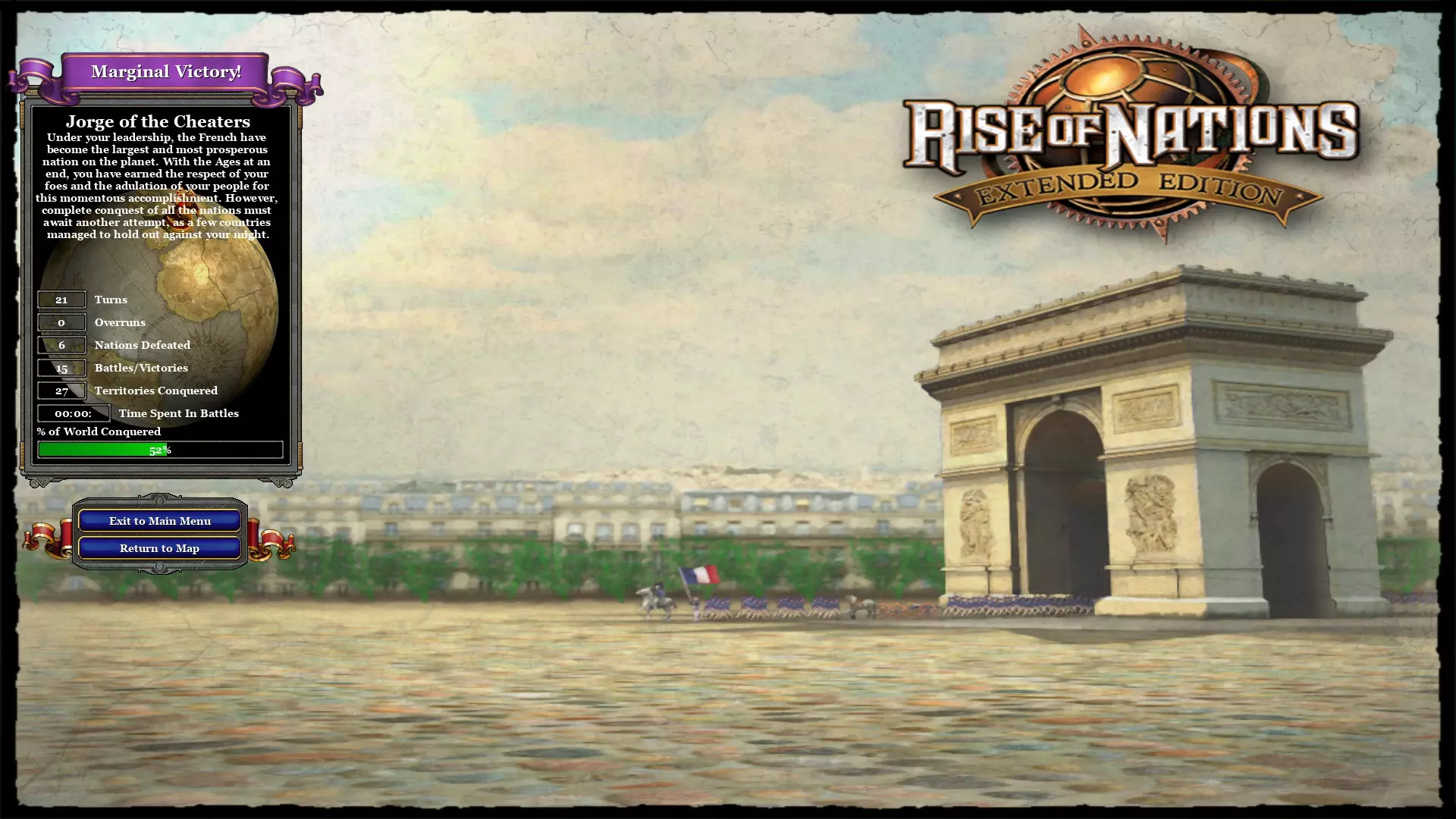 不过有个“正当”获取成就的小技巧: 当你看到之前出现的那个界面时,点击【返回主菜单】。 然后重新进入【世界战役】菜单,你会发现最后一个战役的选项显示为【继续】,点击该按钮。 你会回到之前的游戏进度(有时是最后一回合),正常游玩或跳过回合即可。 你仍然会看到带有“Cheater”的胜利画面,但成就会正常解锁! 希望这能帮到大家,抱歉了各位可敬的玩家,但我还得刷其他成就,时间不多,所以……