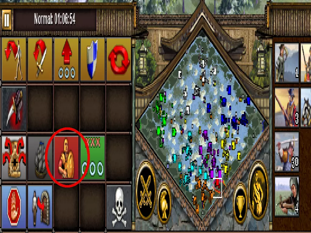 如果您想更改位置,请点击防御或进攻选项旁边的按钮,(这个位置更改非常重要)。我认为在进行村庄占领时,带上像攻城锤/攻城炮这样的大型武器。将这个战术部署在山脉周围,配合步兵以及长矛兵/投石兵,可以形成非常有效的防御。特别是“{”形状的军事阵地布局,能让您在山地中构建良好的防御。