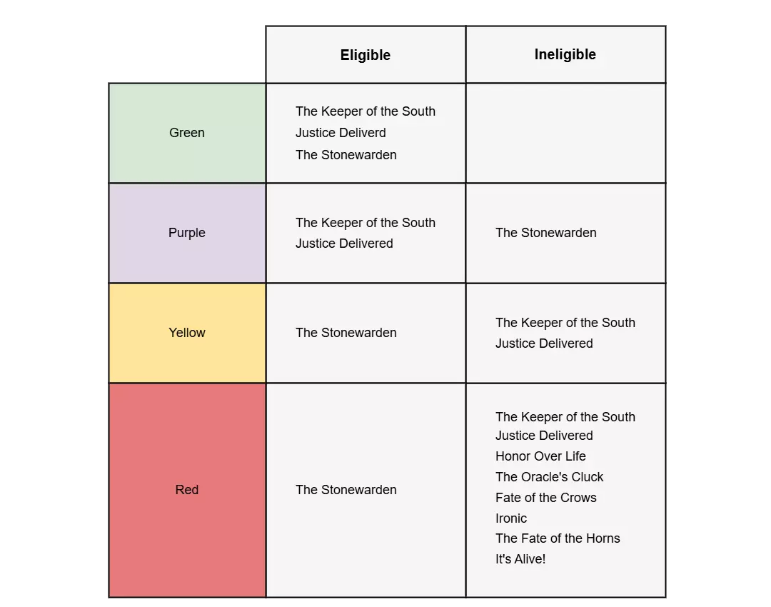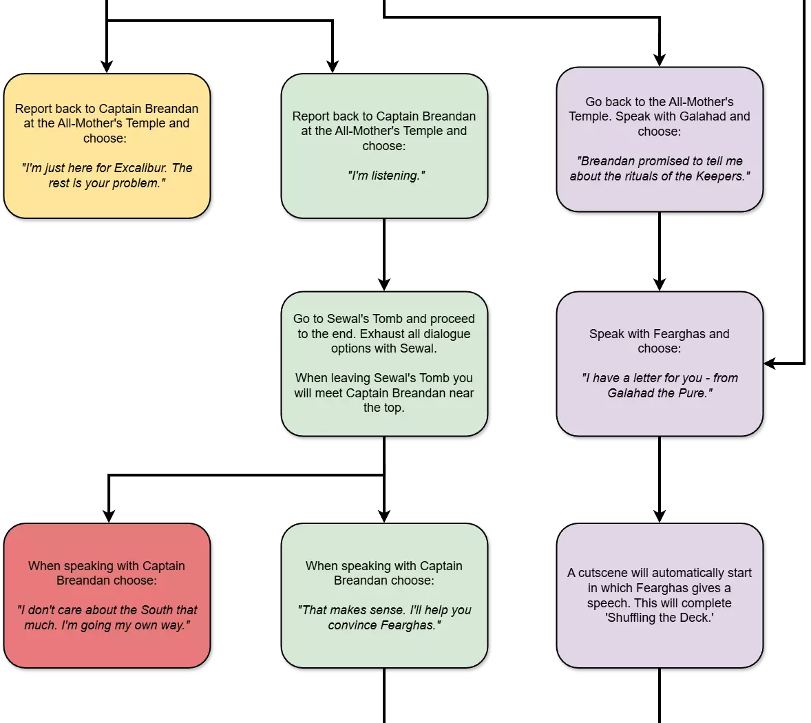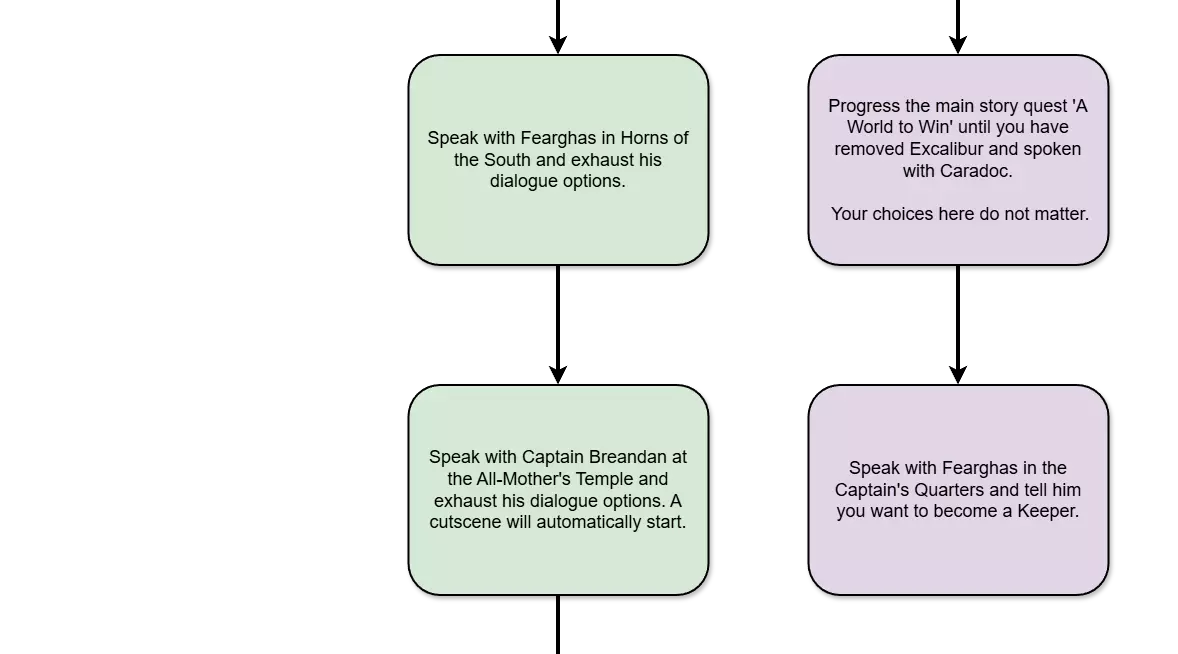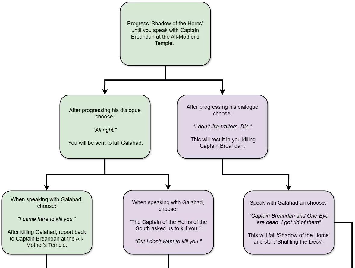 要解锁此成就,你需要宣誓成为一名守护者。这只有在推进主线剧情并在第一幕拔出王者之剑后才能进行。你在游戏此部分做出的选择会影响多个成就的获取资格。如果你希望在一次游玩中获得所有成就,强烈建议你参考本指南的【容易错过内容清单】部分。以下是获取此成就时需要注意的几点: 如果你为了获取【By My Own Hand】成就而提前拔出了王者之剑,请务必加载之前的存档,因为未正确完成主线任务将导致你无法解锁此成就。 此成就极易错过,并且需要选择非常特定的对话选项。在第一章主线任务推进过程中,请经常手动存档。这样如果出错需要重新加载时可以节省时间。 无论你在第一章与谁结盟,都能成为守护者,尽管有一些相互矛盾的帖子和攻略称如果与加拉哈德结盟就无法解锁该成就。不过,与加拉哈德结盟会导致一名NPC死亡,并阻止你解锁The Stonewarden成就。 以下是可能会阻止你成为守护者的对话选择图表。如果你是普通玩家,不想在游戏时对照流程图,简单来说就是:确保与布兰登队长结盟,并选择杀死加拉哈德。然后选择听取布兰登船长的秘密并帮忙说服费格斯