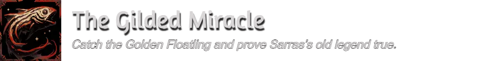 深呼吸……这不是另一个钓鱼成就。 尽管成就描述如此,但你不需要“捕获”金色漂浮怪。相反,你需要找到并击杀它。要让金色漂浮怪生成,你必须先完成支线任务【流浪的奇迹】。请参考以下步骤来解锁【The Gilded Miracle】成就。 步骤1:创建手动存档,以防出错。 步骤2:与图片所示位置的沃斯克对话。他会给予你支线任务【流浪的奇迹】。跟随游戏内标记完成该任务。 步骤3:完成任务后,前往图片所示的溃疡之地。 步骤4:进入溃疡之地后,按照以下路径前进,参考图片: ▸向第二个路口右转。▸向右转。 ▸跳下边缘,向右悬挂。 步骤5:你应该会看到两个芬布勒德和金色漂浮物在一个箱子周围飞。杀死金色漂浮物并拾取箱子。