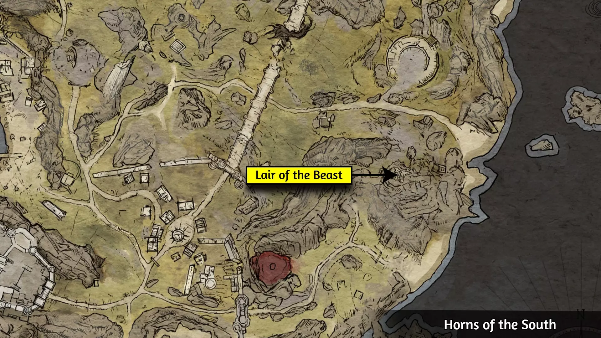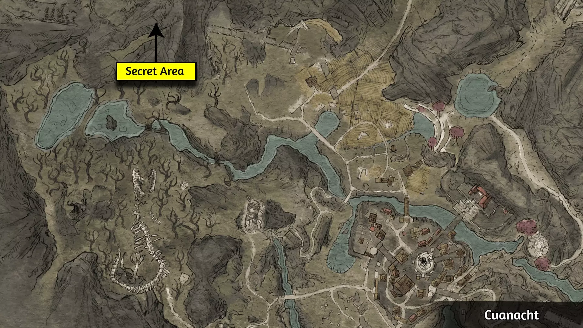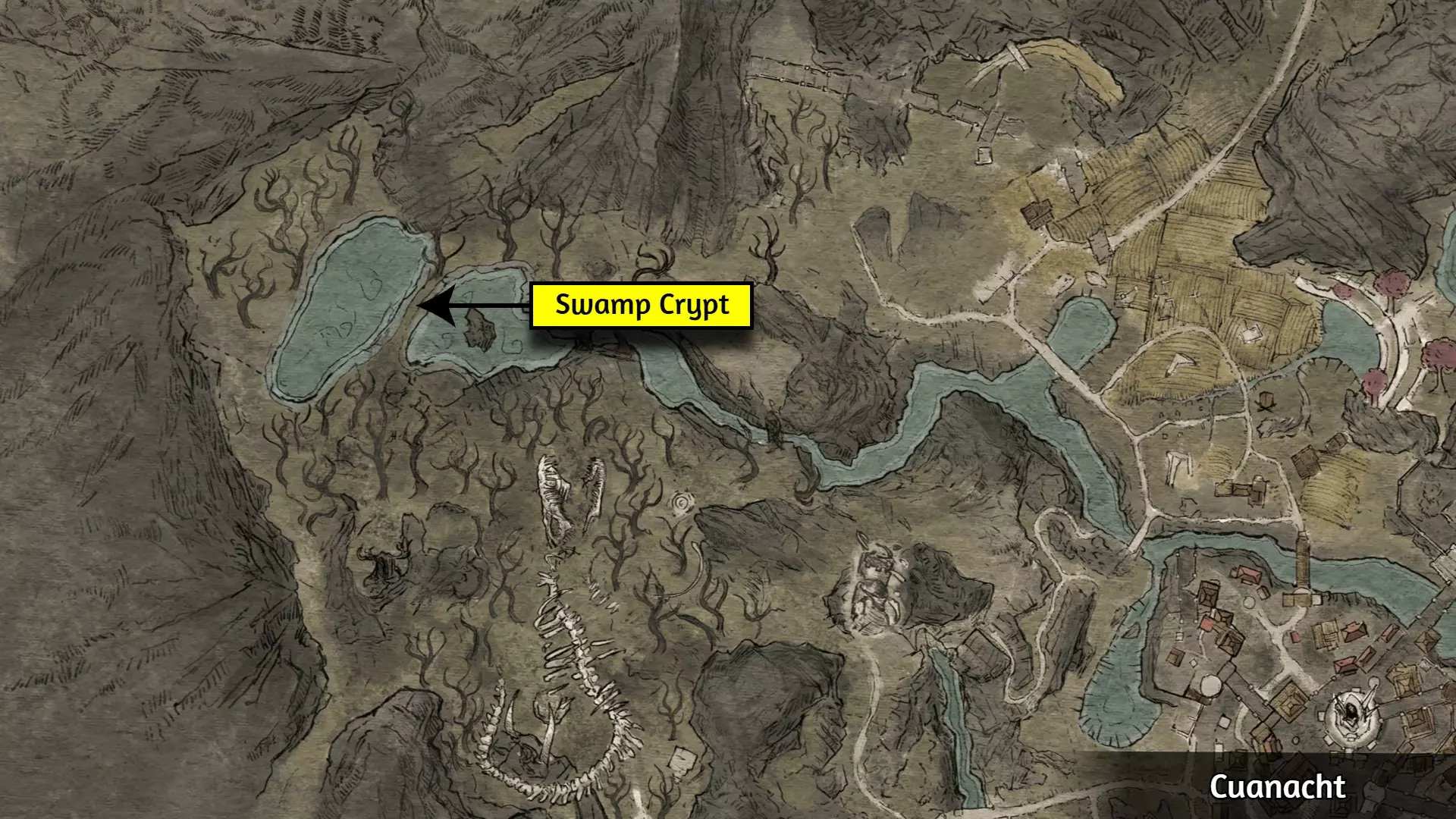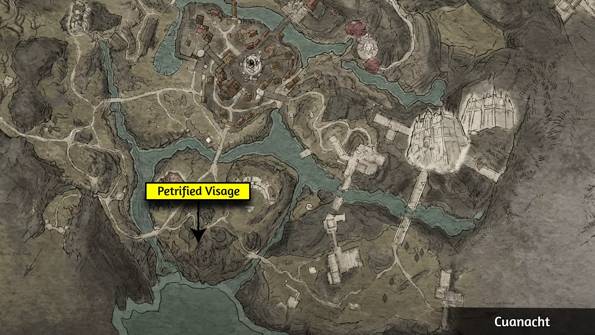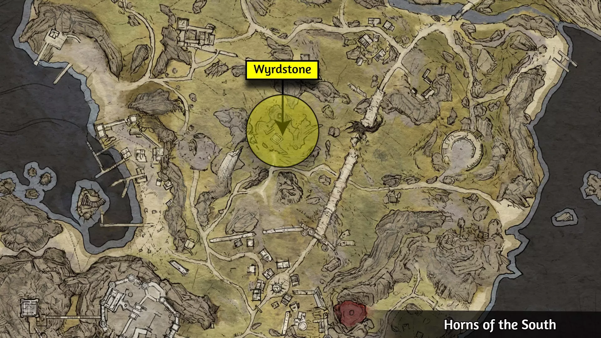 这个成就是个例外;大多数玩家会自然解锁它,但有些玩家报告说即使游玩时间远超50小时也未能解锁。通常的情况是:当在野外篝火处休息时,你必须收到【有东西在黑暗中潜伏】的提示,并且遭到攻击。对大多数人来说,仅收到提示并不会触发成就。 幸运的是,玩家们发现,在【石化面容】快速旅行点附近露营,能稳定触发【Prey of the Wyrdness】成就。具体位置可参考下图。