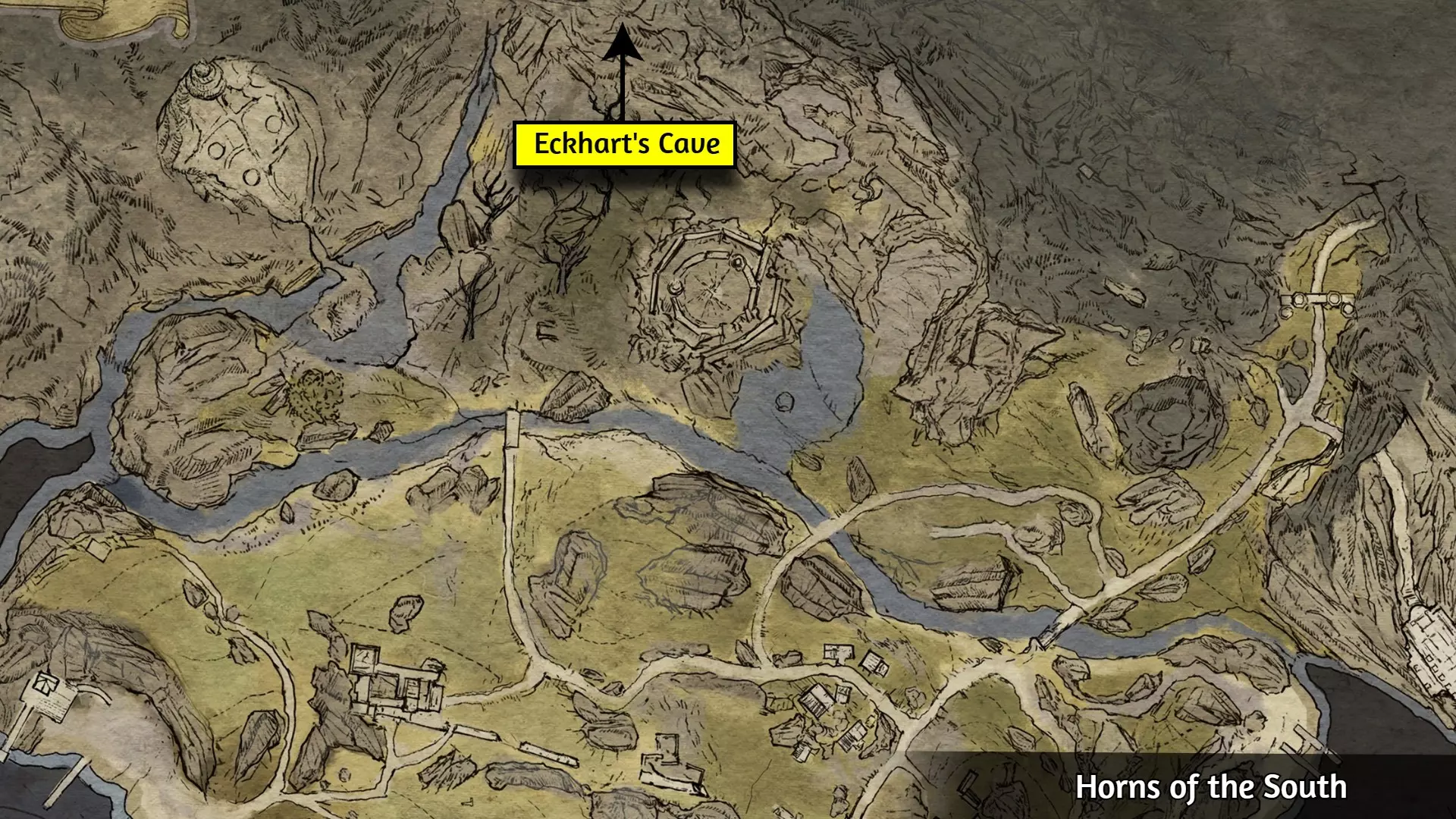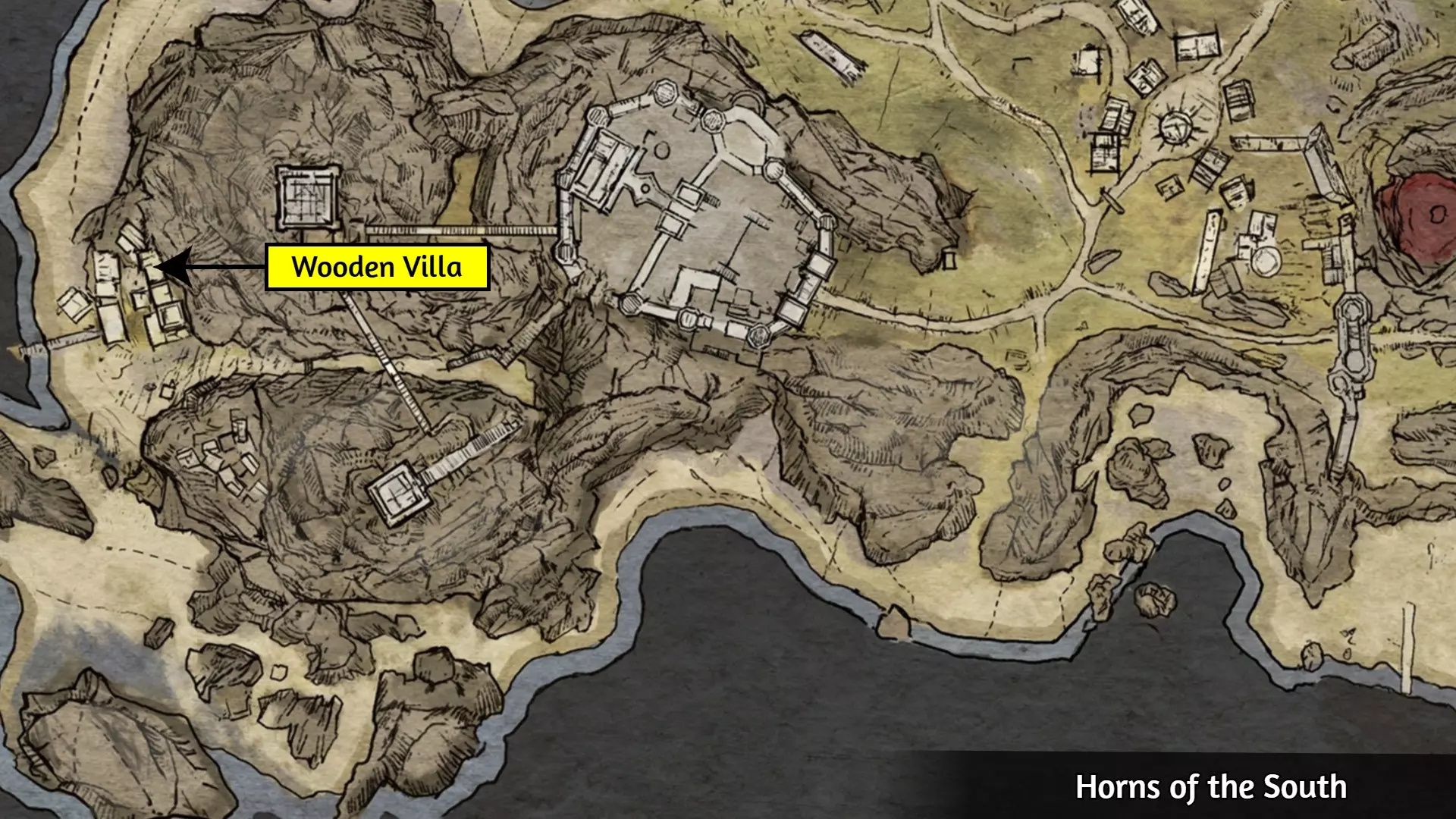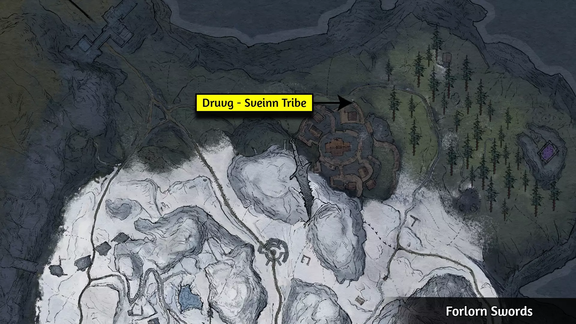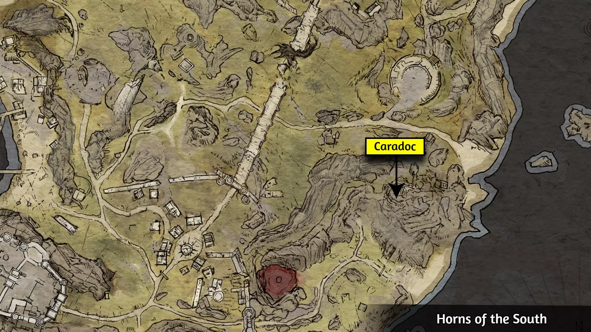 这个成就是个例外;大多数玩家会自然解锁它,但有些玩家报告说即使游玩时间远超50小时也未能解锁。通常的情况是:当在野外篝火处休息时,你必须收到【有东西在黑暗中潜伏】的提示,并且遭到攻击。对大多数人来说,仅收到提示并不会触发成就。 幸运的是,玩家们发现,在【石化面容】快速旅行点附近露营,能稳定触发【Prey of the Wyrdness】成就。具体位置可参考下图。