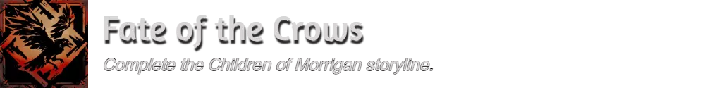 展翅高飞:解救维达尔,在罗斯克里与他会面,并同意让莫里根之子带走他。 流浪者无家可归:找回日记并归还。 理性的杀手:与赫罗夫交谈,告知他现在是线人。返回并领取下一个任务。 布谷鸟之卵:与阿布林交谈并选择杀死他。返回并领取下一个任务。 高昂她的头颅:找回莫里根之首并归还。接受下一个任务。 任性之子:同意调查家族墓穴,并向文汇报调查结果。 甜蜜梦境:选择支持自我或战争;该决定不影响结局。