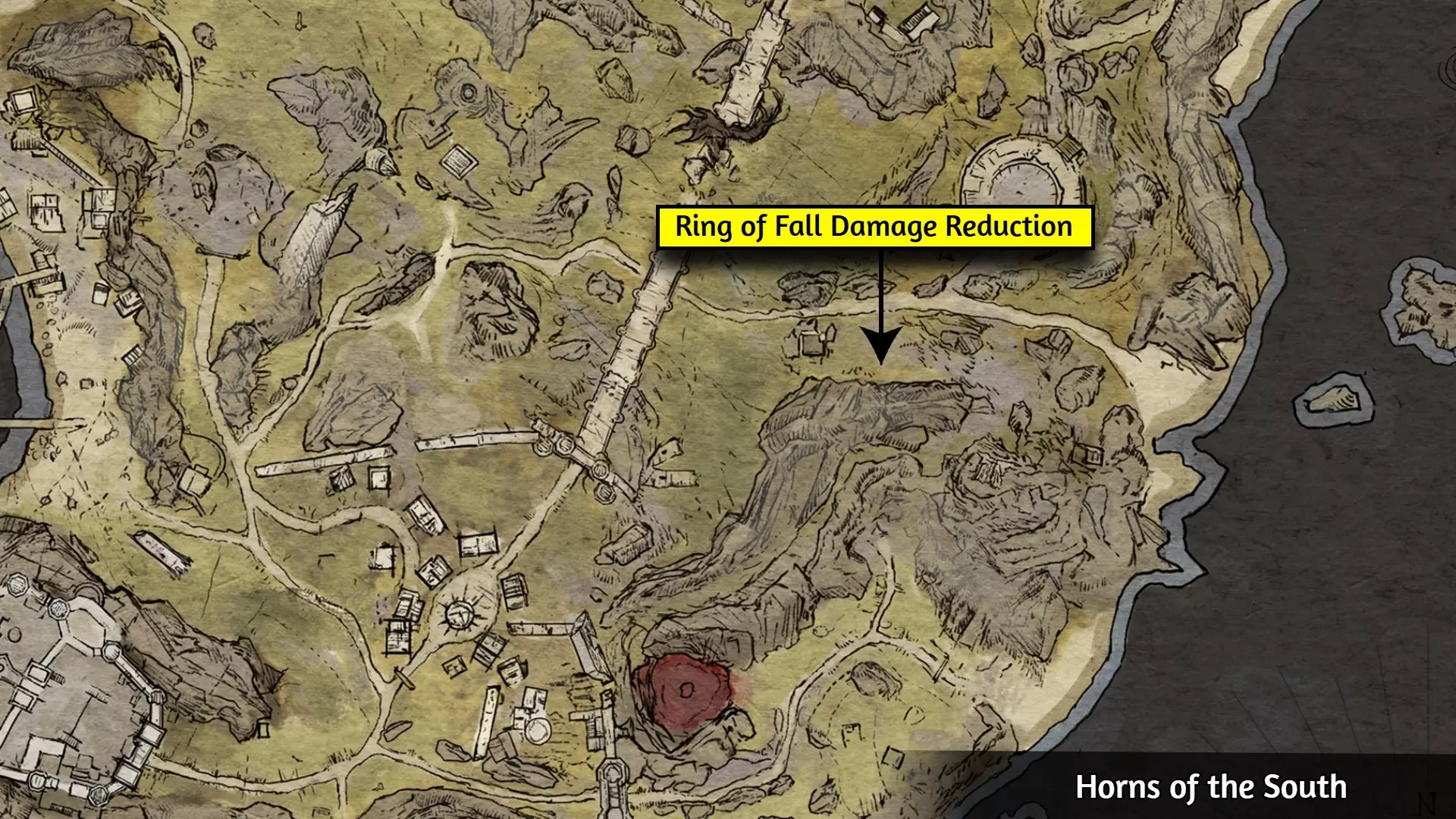 从下图所示位置的尸体上拾取【坠落伤害减免戒指】。装备该戒指后,从足以致命的高处跳下。你拾取戒指的尸体正后方的悬崖就是个不错的地方。哇啊啊啊!