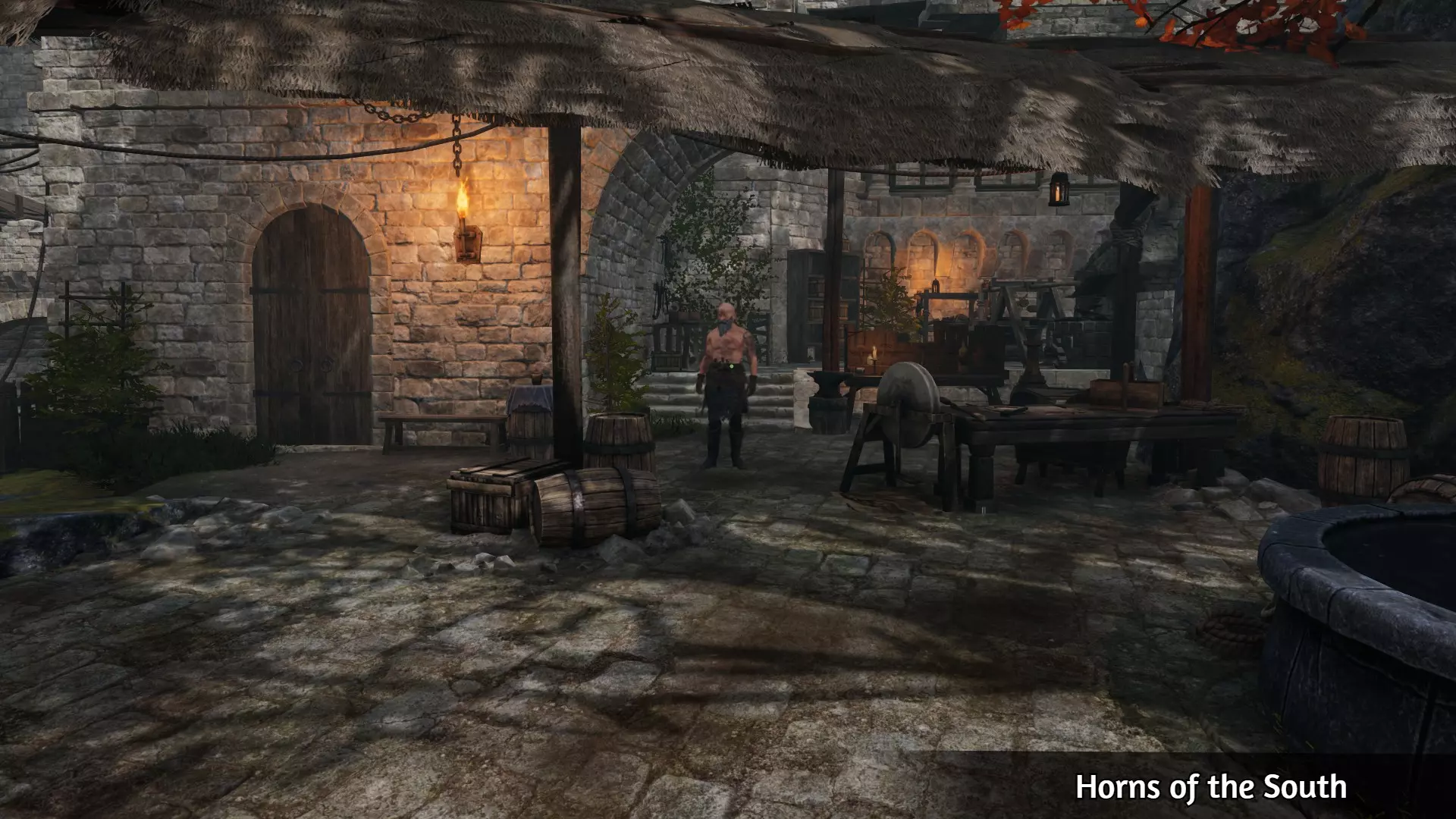 解锁【Hands of Creation】的一个简单方法是前往下图所示位置找到奥斯布里特,购买10份铁矿石,然后与锻造炉中的磨石互动来制作开锁器。