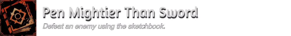 在下图所示的位置向奥拉思购买素描本。打开快捷使用轮盘,从左侧篝火和坐骑旁边选择素描本。找到一个低等级敌人,使用素描本将其击杀。你只需造成最后一击,这意味着你可以先用普通武器削弱敌人,然后切换到素描本完成击杀,以解锁成就Pen Mightier Than Sword。