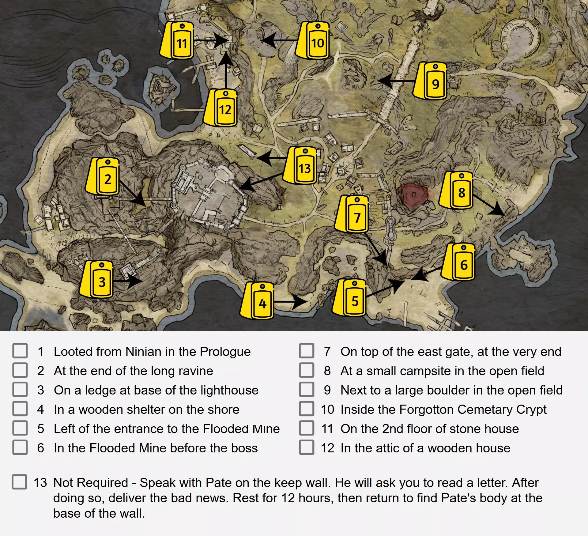 总共有13个守护者标签,其中12个是解锁【Honor Over Life】成就所必需的。收集完成后,必须将它们交给军需官才能解锁该成就。以下是显示所有位置的地图,以及每个守护者标签的单独截图。