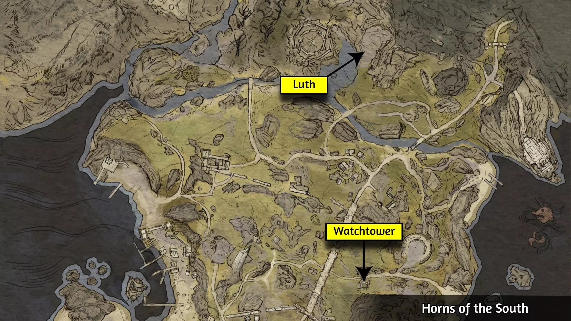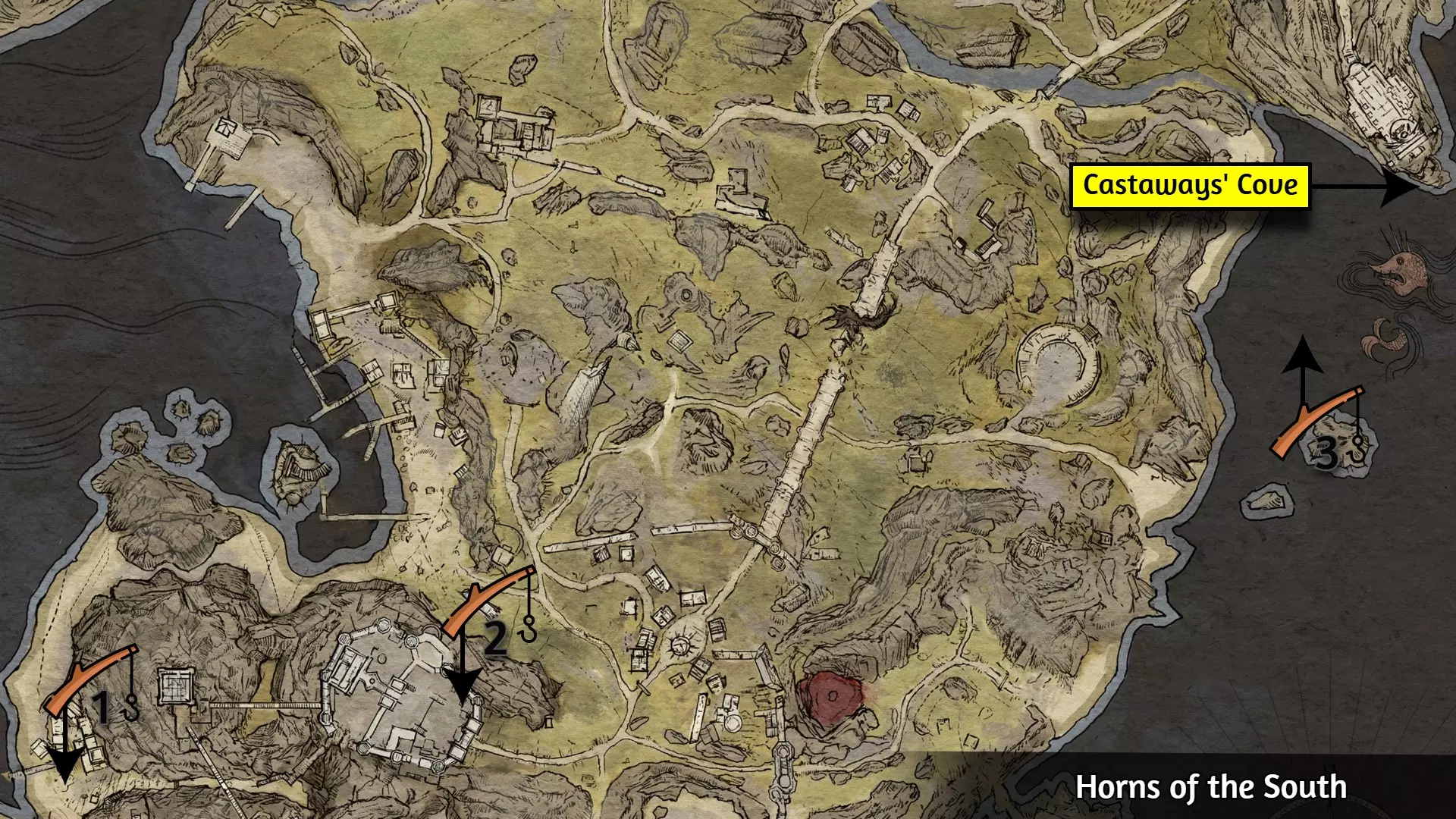 海之灾祸是漂流者海湾尽头的 Boss,漂流者海湾即下图所示的地下城。支线任务【最后的航行】会引导你前往那里,但该任务并非解锁成就或进入海湾的必要条件。你只需用鱼竿对其造成最后一击,这意味着你可以先用常规武器削弱它,再切换到鱼竿完成击杀,以解锁成就The Deadliest Catch。 以下是部分可找到鱼竿的地点: 1. 从赫芬处购买。 2. 从奥拉思处购买。 3. 小岛的一艘船旁边。
