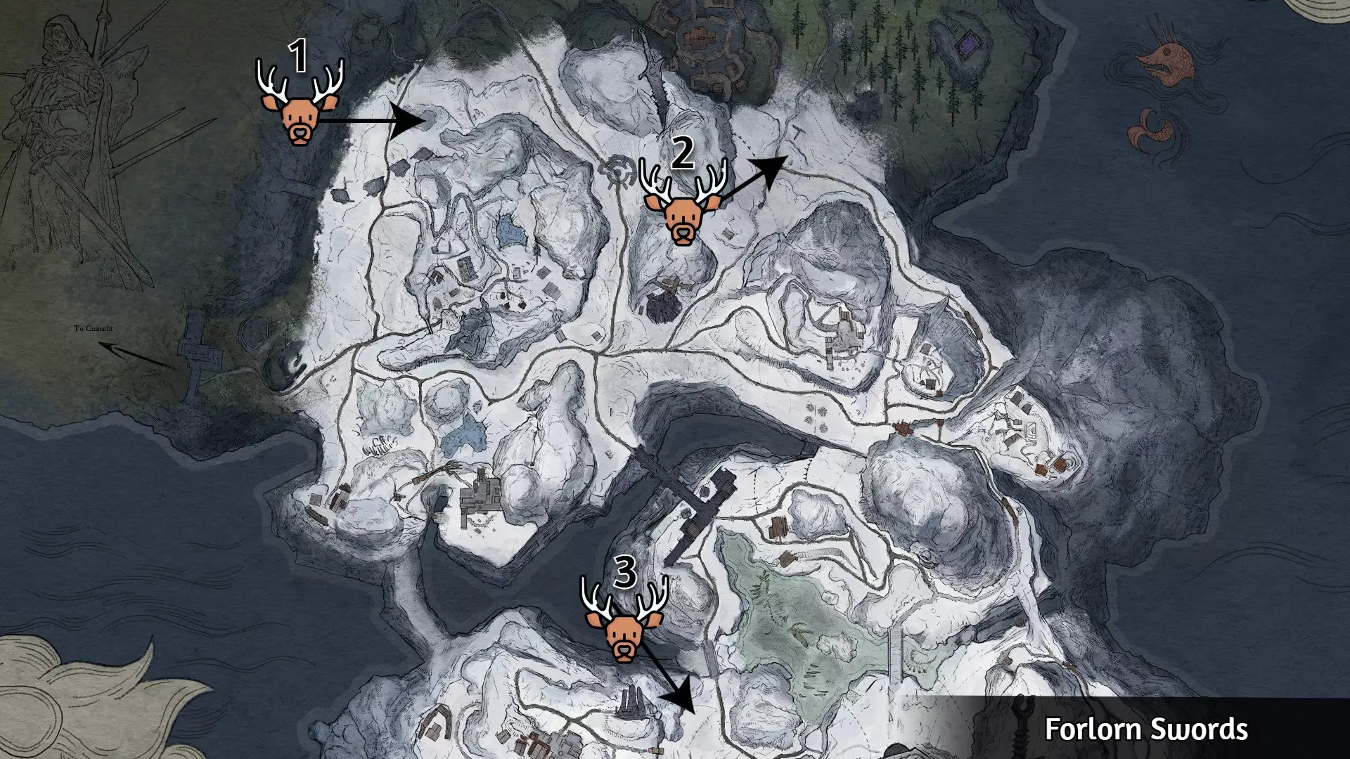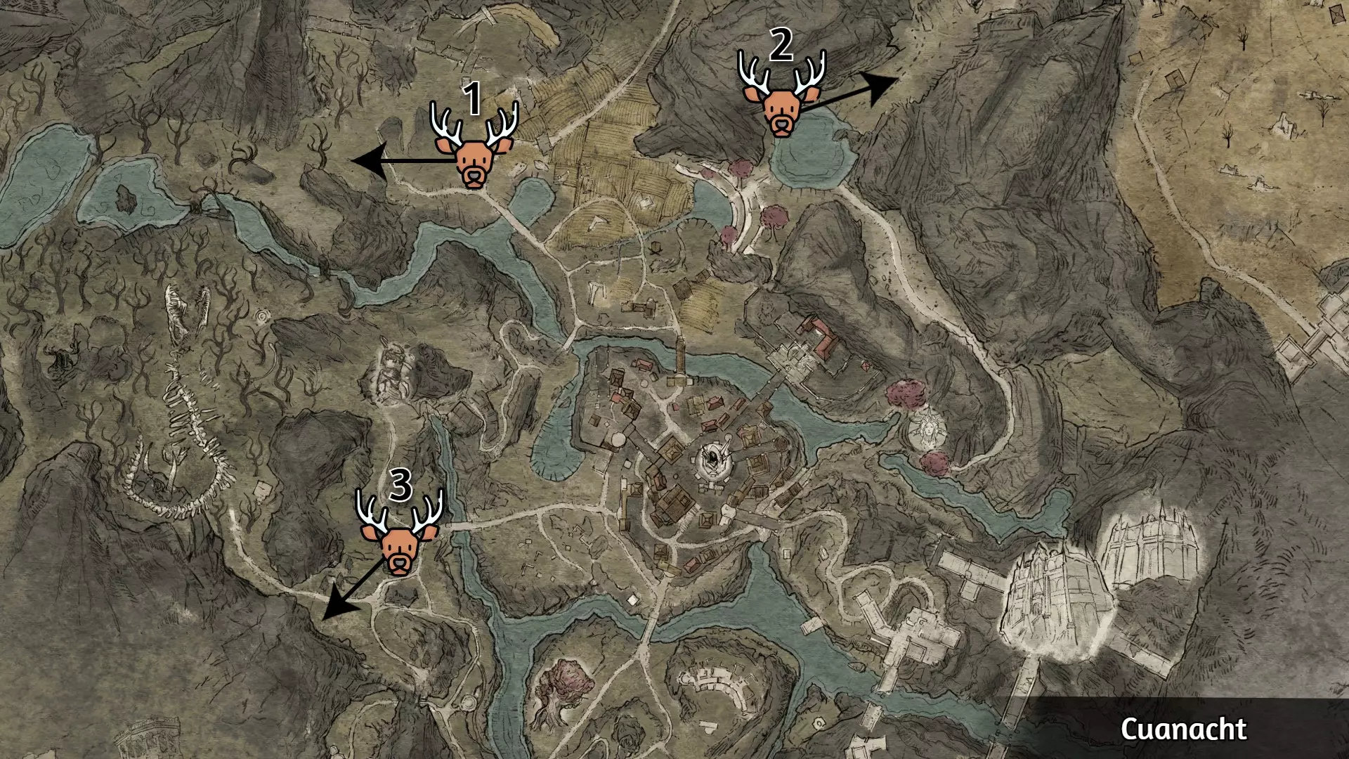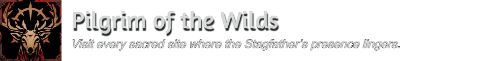 游戏中共有九座雄鹿之父圣坛,其位置如图所示。与圣坛互动后,会生成三只幽林鹿并启动20秒计时器,你必须在时间结束前将它们击杀。正如成就描述所言,仅拜访圣坛是不够的,必须成功完成每个圣坛的挑战才能解锁【Pilgrim of the Wilds】成就。以下是一些通用提示: 提前为每个圣坛的挑战存档,失败后重新加载;否则,你需要等待24小时才能再次尝试。 你可以将游戏难度降至故事模式,这不会影响计时器时长,只会降低幽林鹿的生命值。 事先拥有满格的王之魂会大有帮助。使用造成持续伤害的物品可能会很有效。开始前务必清理神龛周围的其他敌人。之后不要忘记与神龛互动以获取战利品。